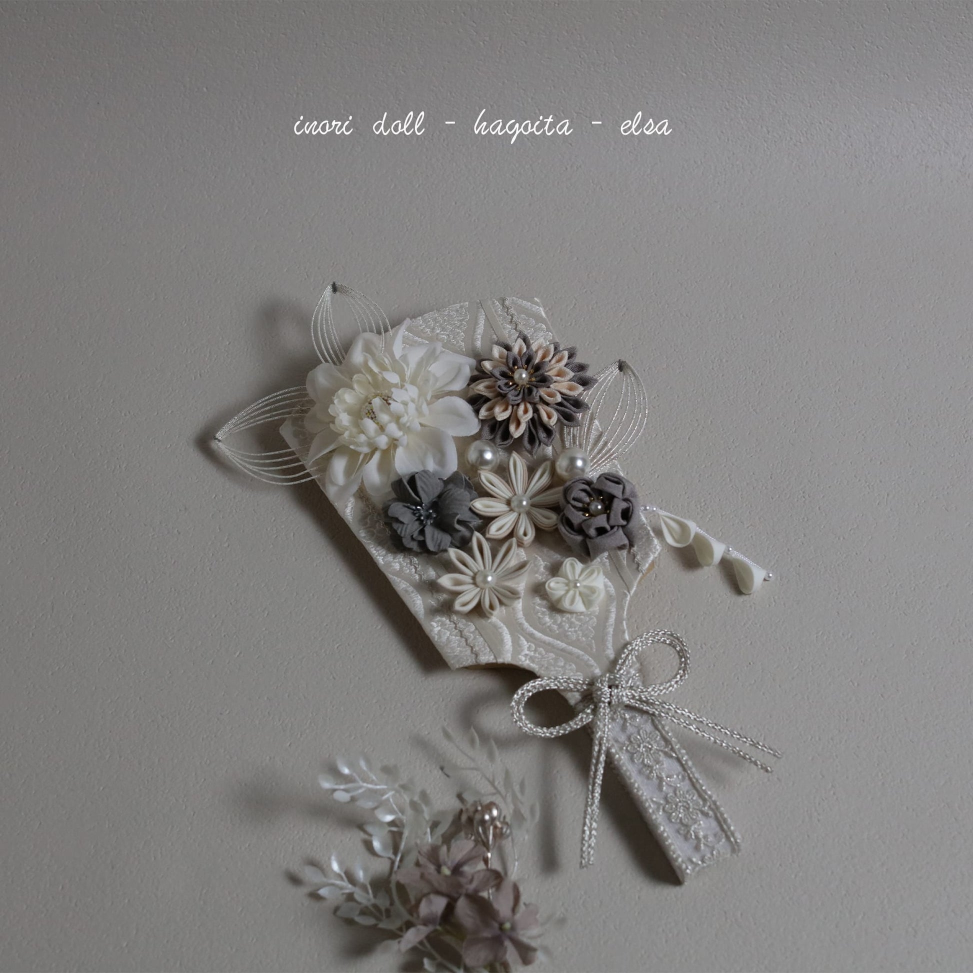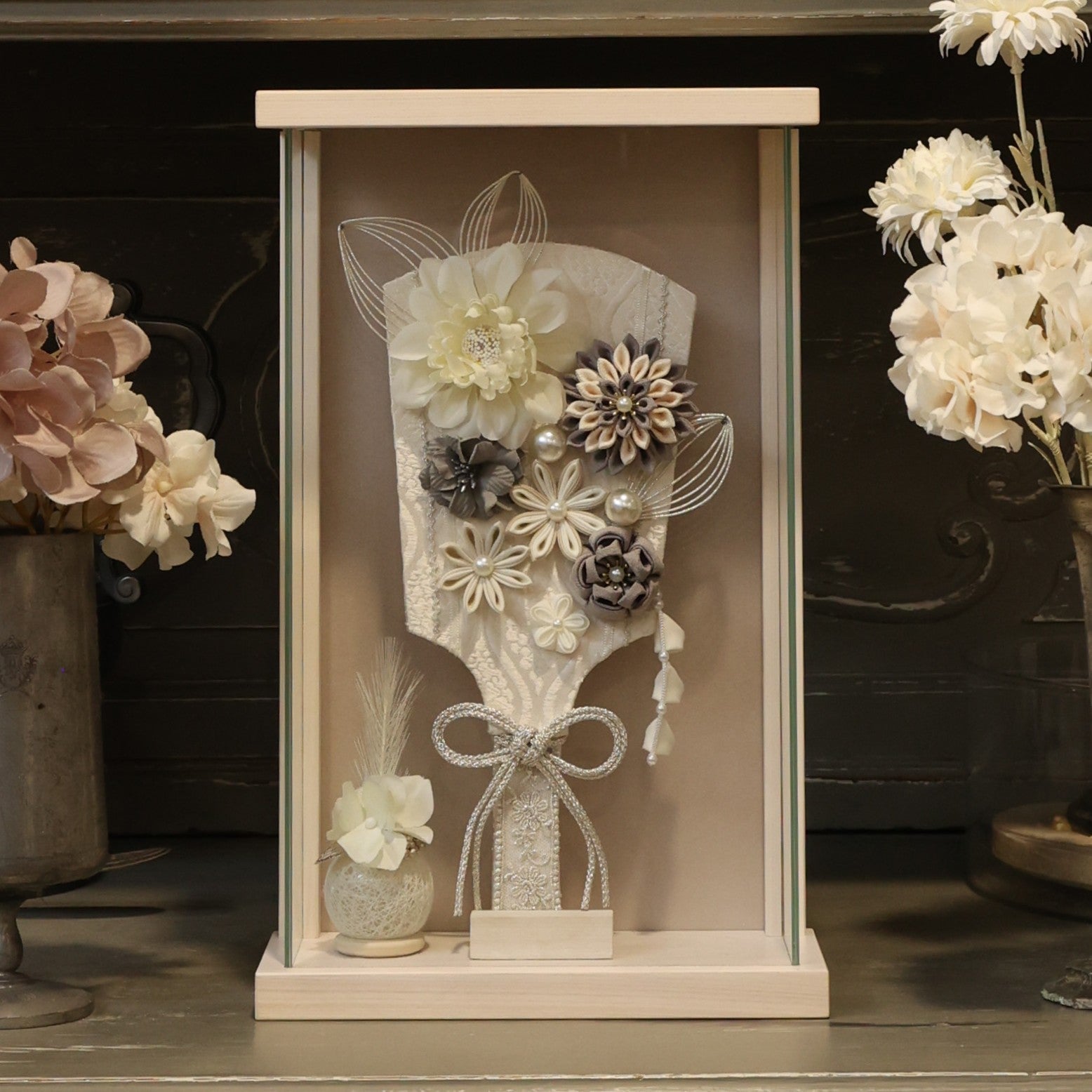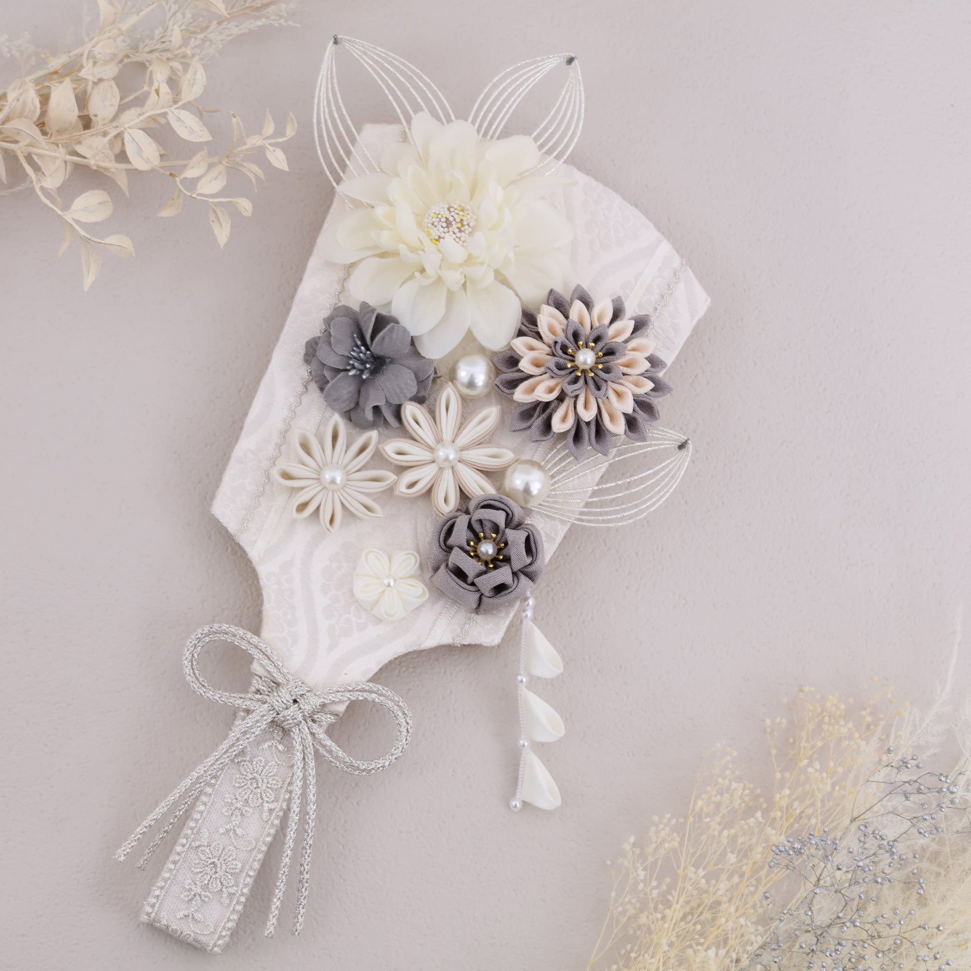 この羽子板は、赤ちゃんの健やかな成長を願ってデザインされています。花飾りにはスモーキーグレーのダリアを使用し、その優雅な色合いは赤ちゃんの成長の静かで穏やかな瞬間を象徴しています。ダリアは堅実さや誇りを表し、未来への希望を感じさせます。