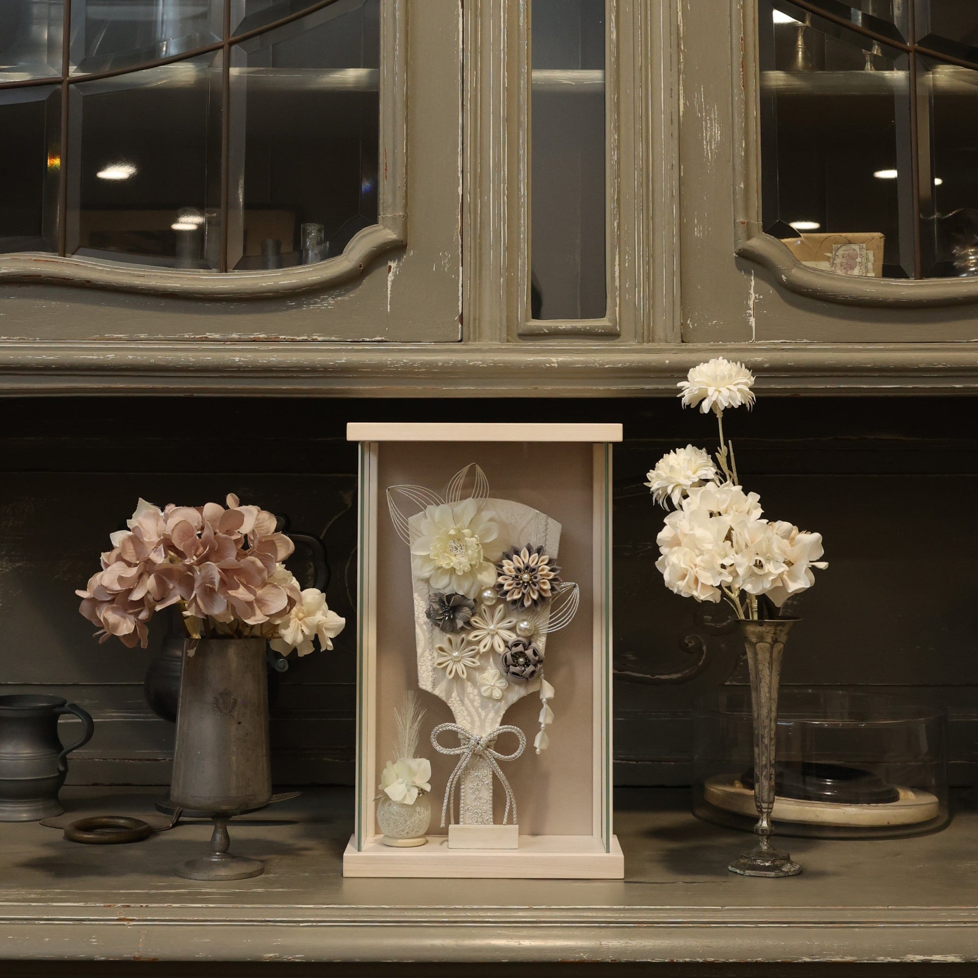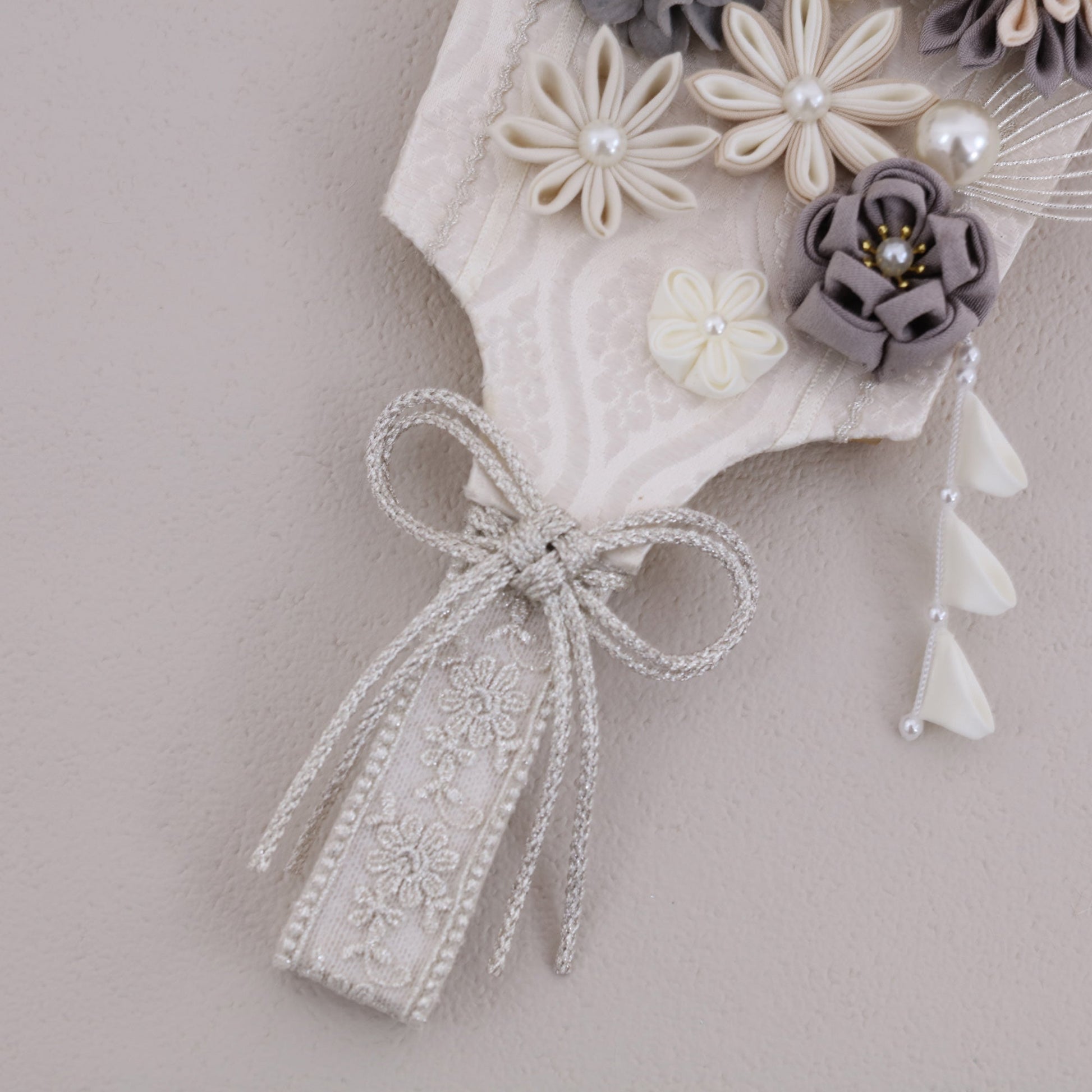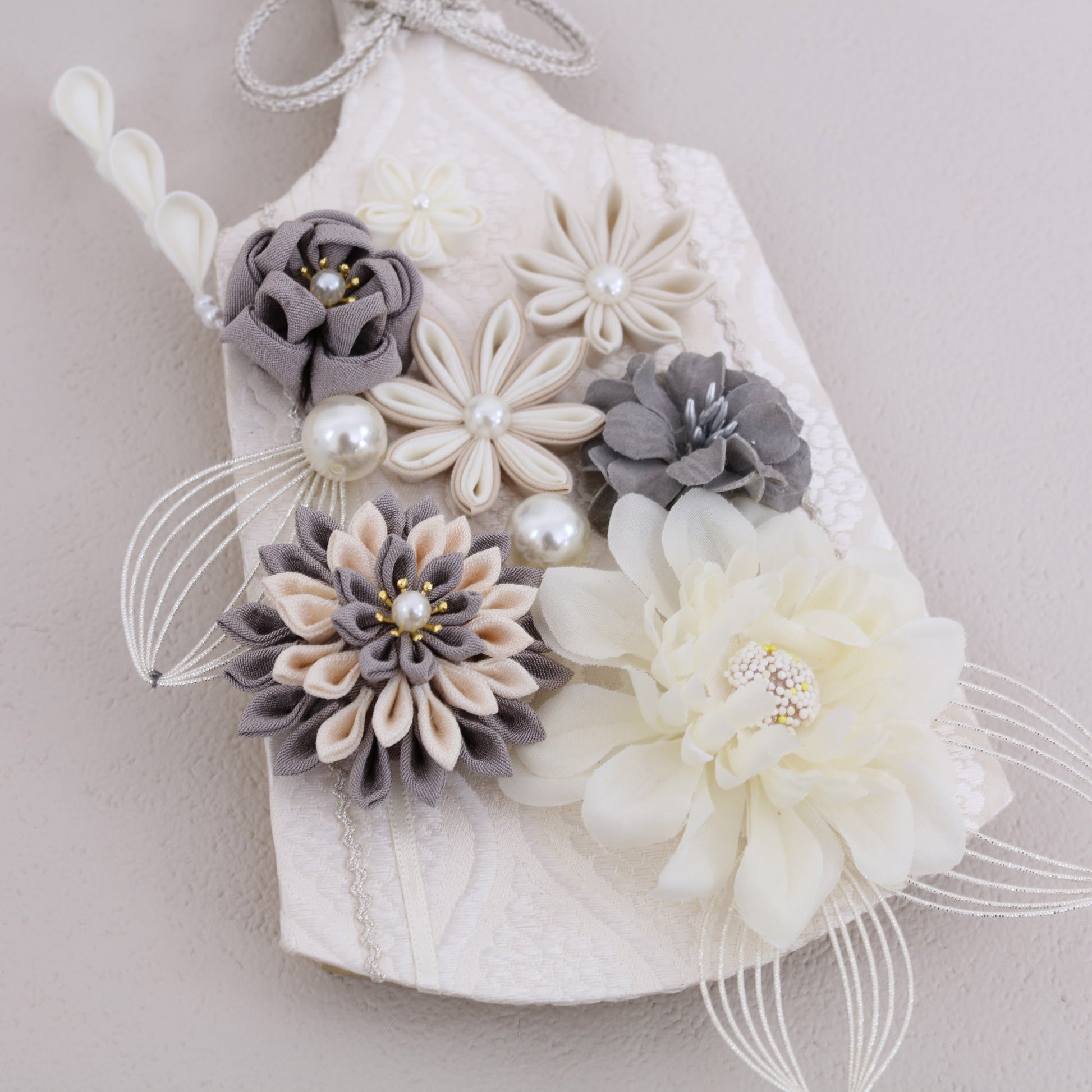 この羽子板は、赤ちゃんの健やかな成長を願ってデザインされています。花飾りにはスモーキーグレーのダリアを使用し、その優雅な色合いは赤ちゃんの成長の静かで穏やかな瞬間を象徴しています。ダリアは堅実さや誇りを表し、未来への希望を感じさせます。