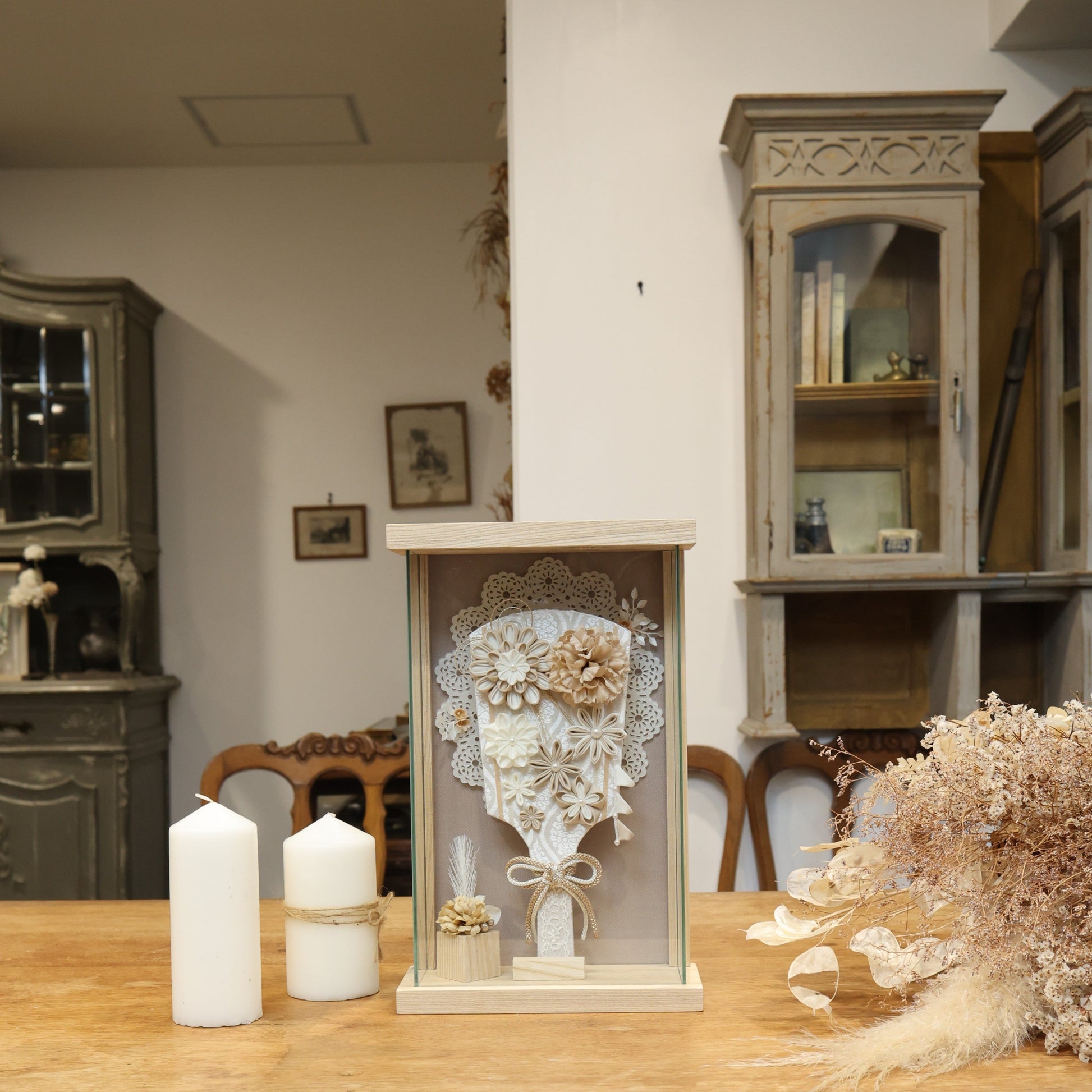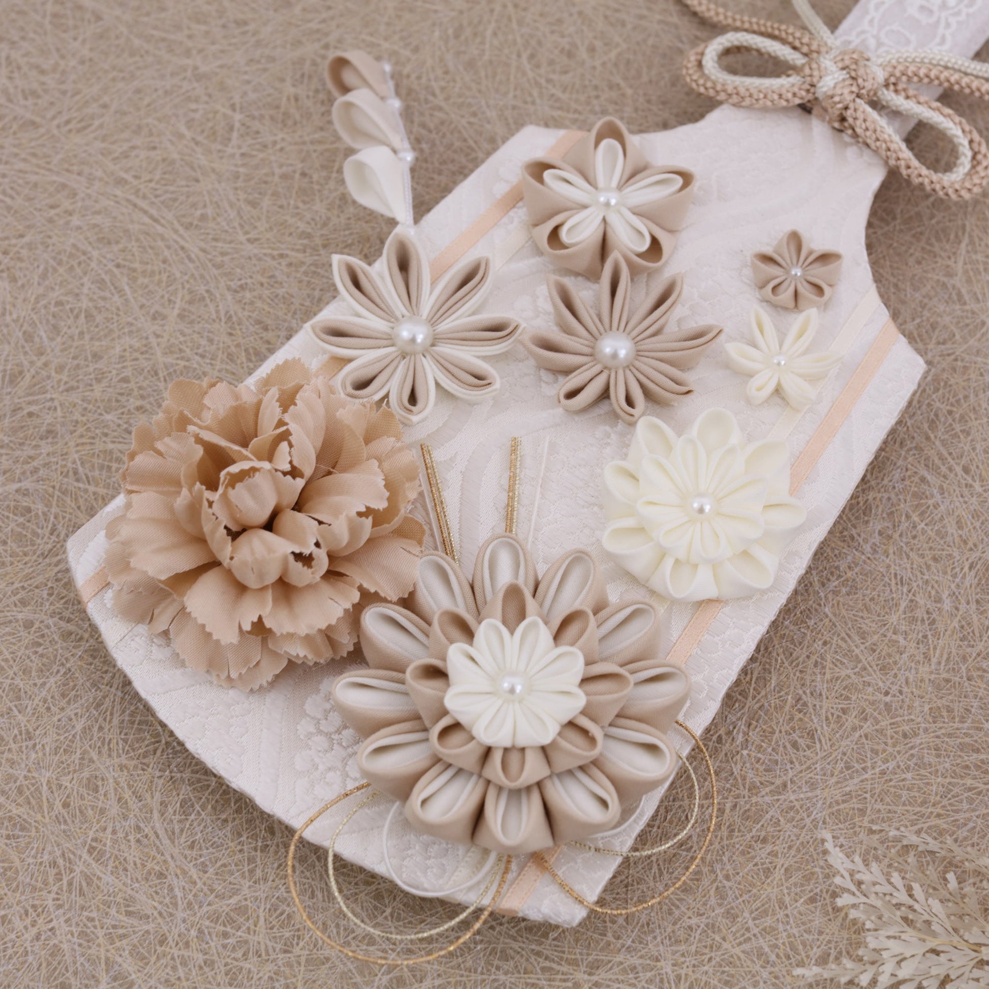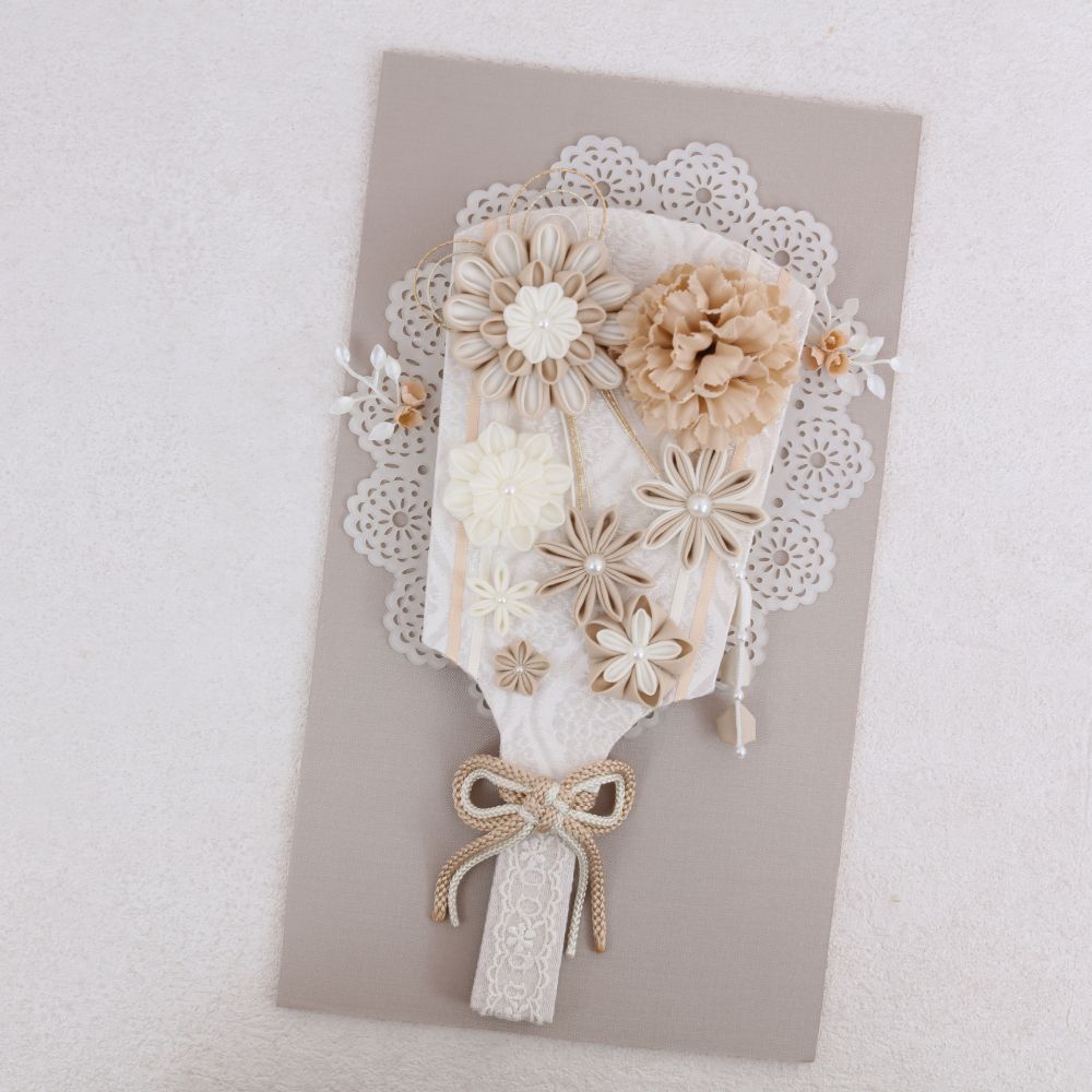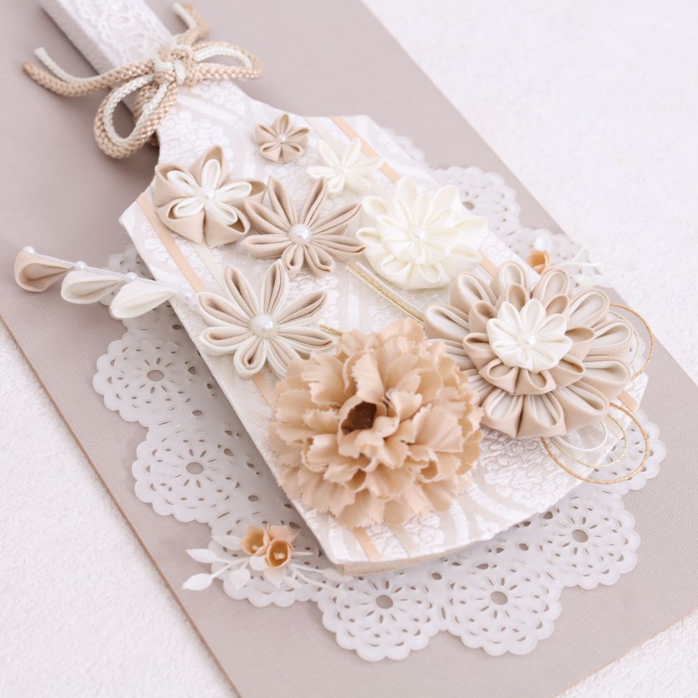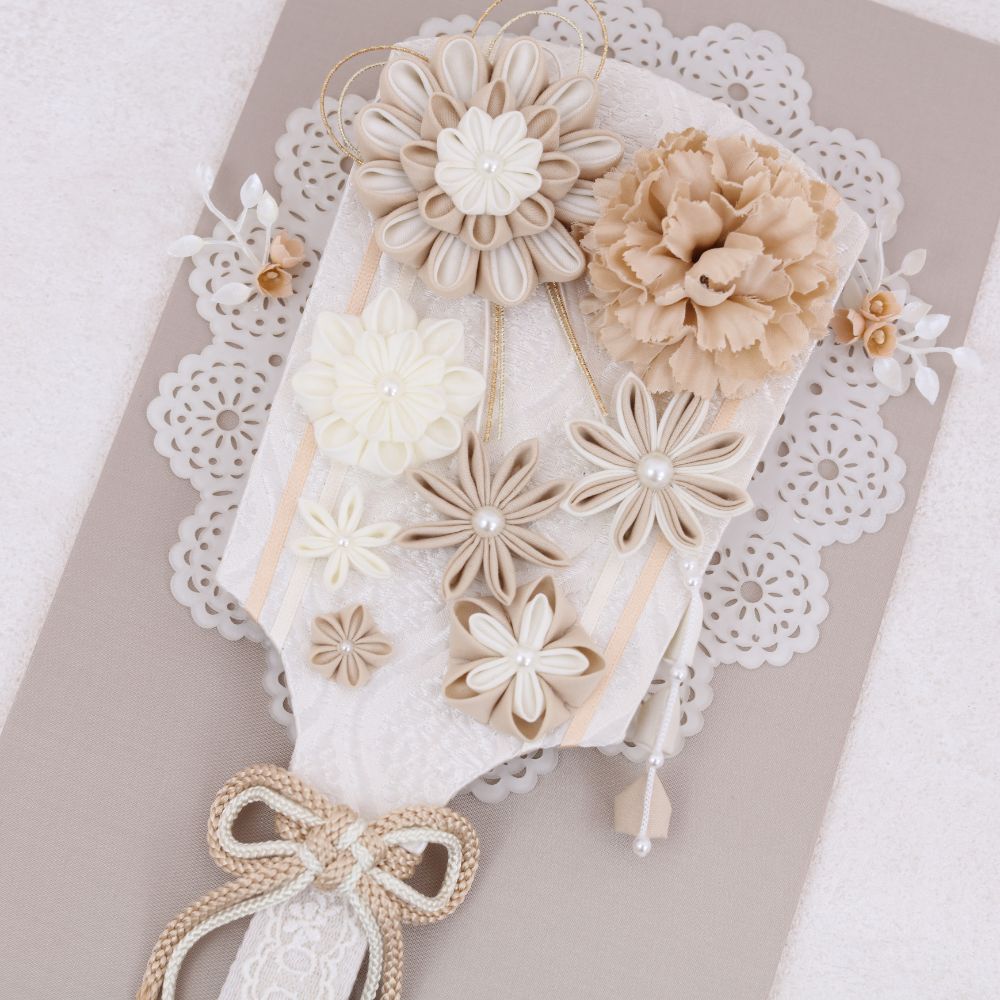 カフェオレのカーネーションを用い、母性愛や優しさを象徴しています。カーネーションは母の日の花としても知られ、赤ちゃんに寄り添う愛情を表現しています。ハートの水引結びを装飾に取り入れることで、家族や愛の絆を強調し、祝福や幸福を象徴します。