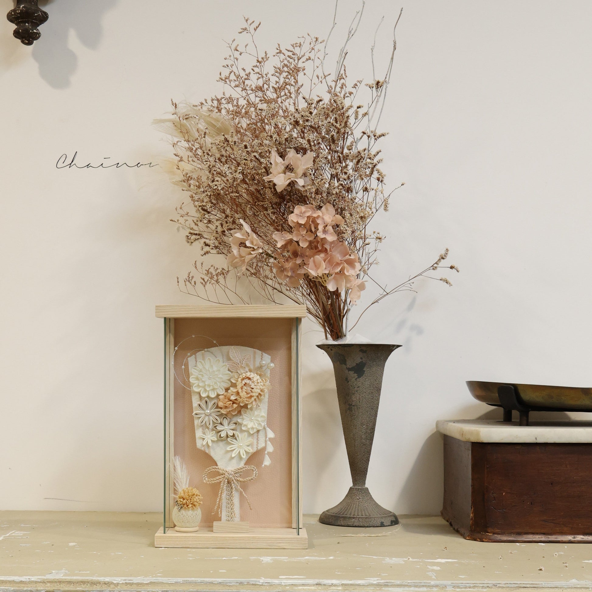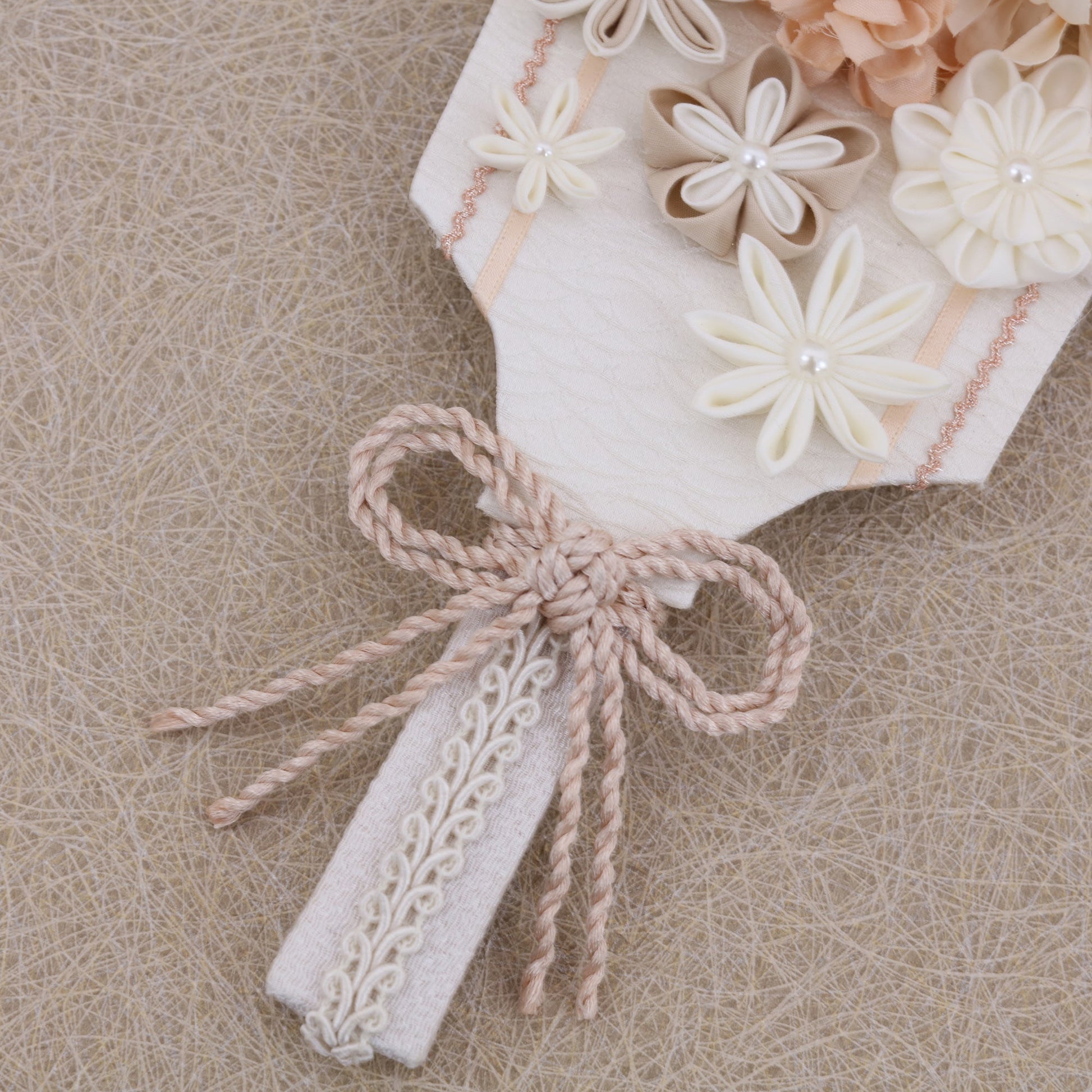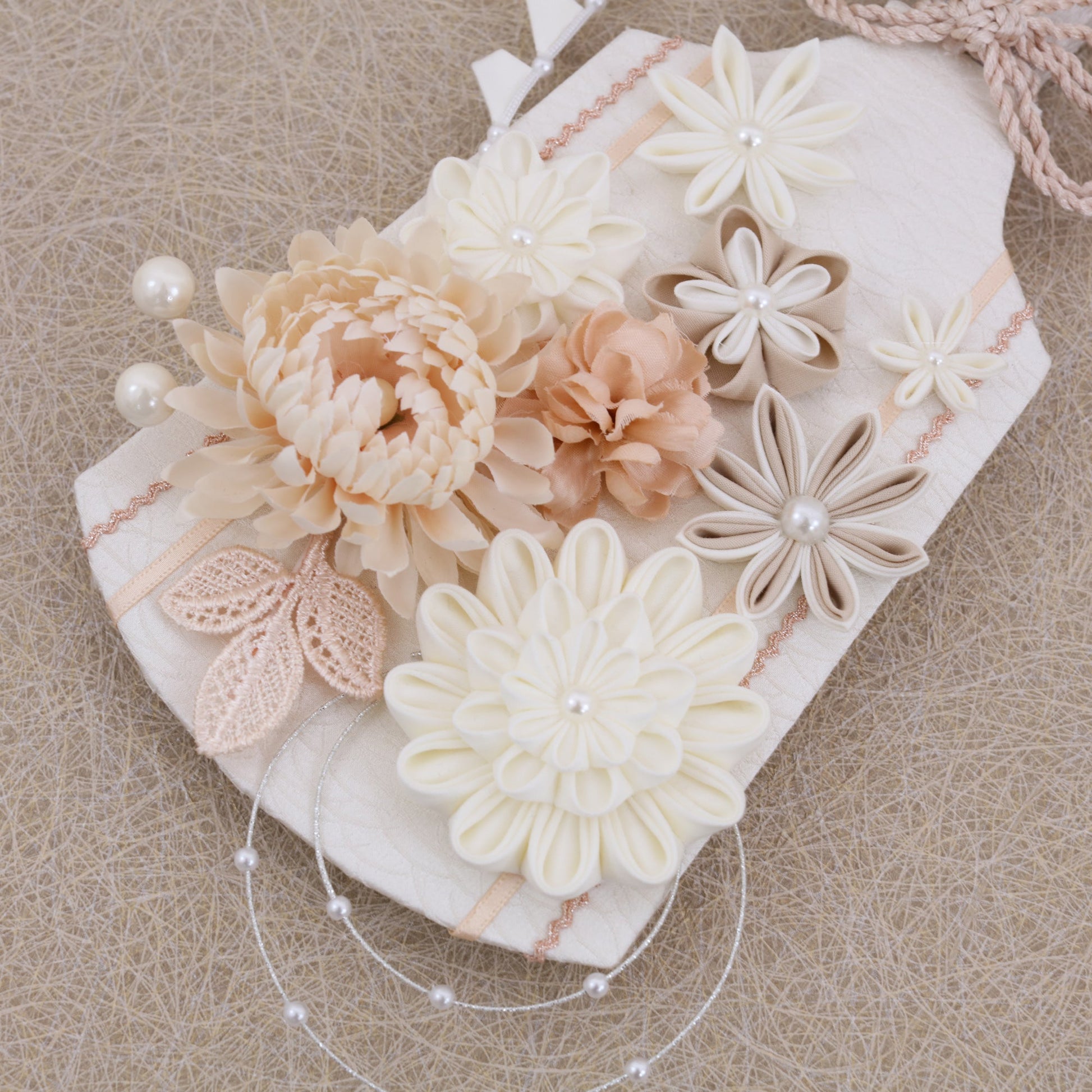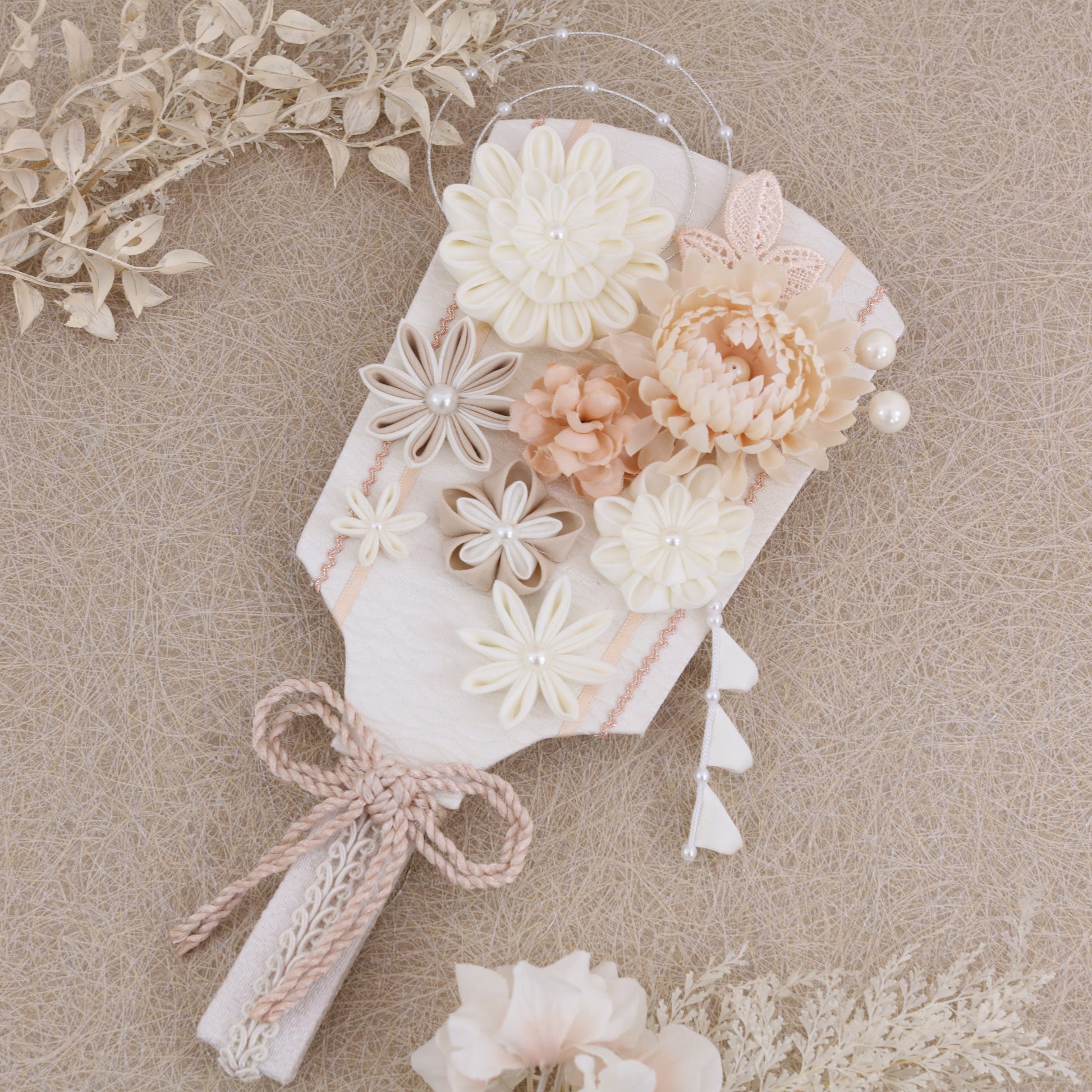 この羽子板は、赤ちゃんの健やかな成長と未来への願いを込めたデザインになっています。中心には、柔らかなサーモンピンクのダリアを配置しました。ダリアの花は「華やかさ」と「優雅さ」を象徴し、サーモンピンクは母親の優しさや温かさ、また、新しい命が芽吹く象徴として用いられました。