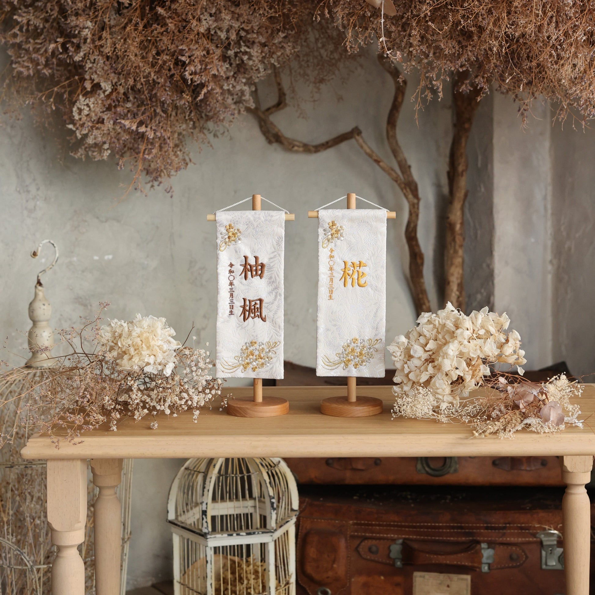 名前旗の刺繍には、京都西陣の由緒ある刺繍工房の技が息づいています。雅やかな柄刺繍は、古来から伝わる日本の美を象徴しています。この伝統を受け継ぎつつ、祈デザイナーの手によってモダンなデザインへと洗練されています。伝統と現代の感性が融合することで、時代を超えて愛される美しさが生まれます。