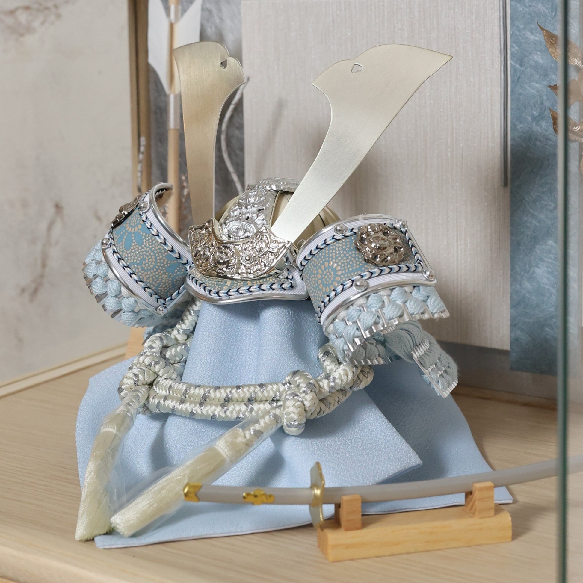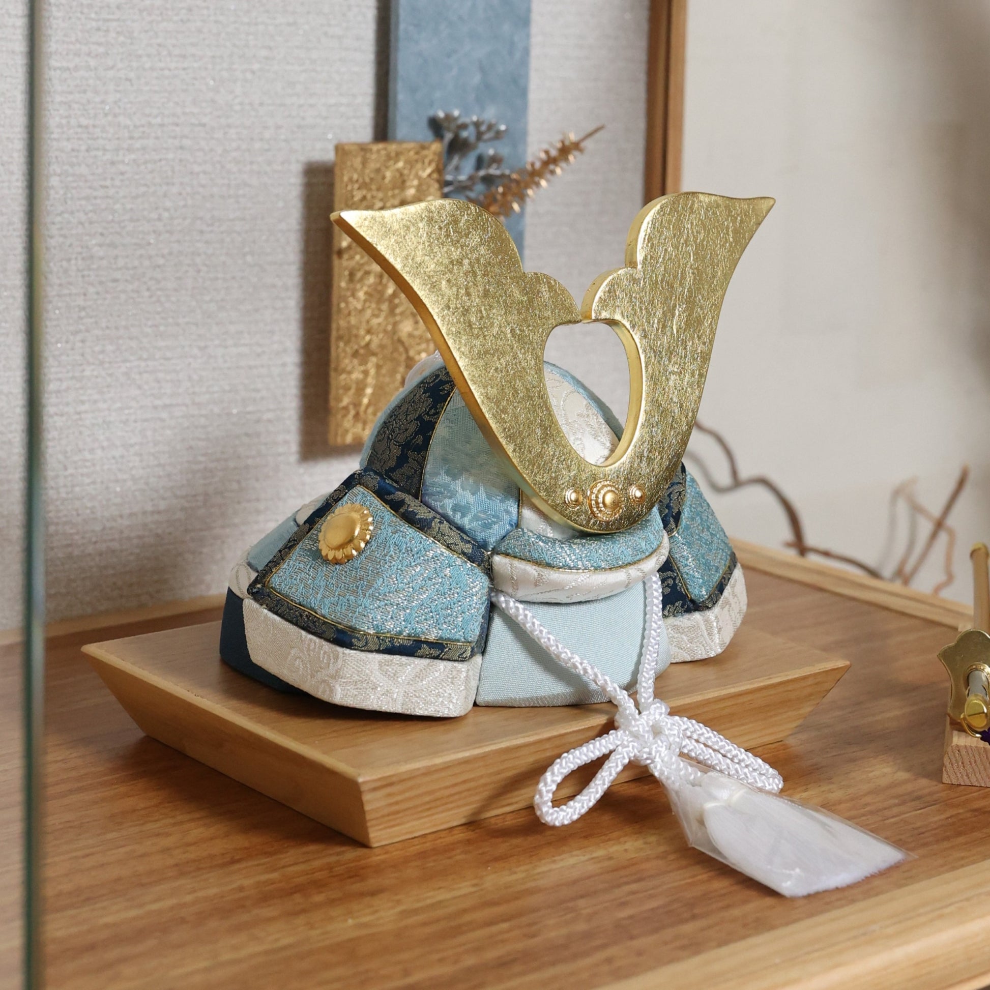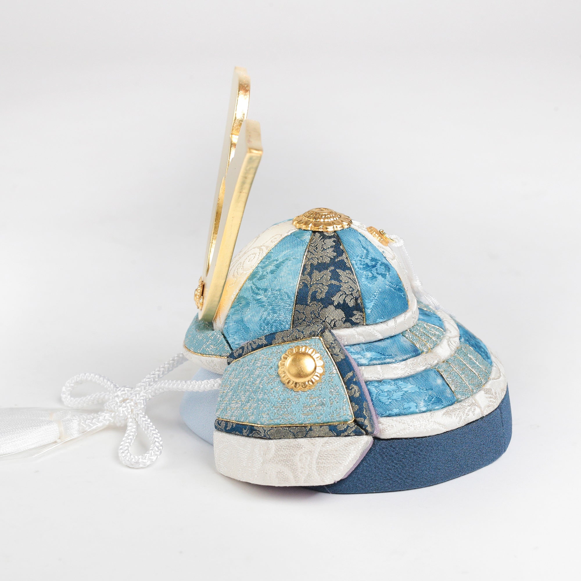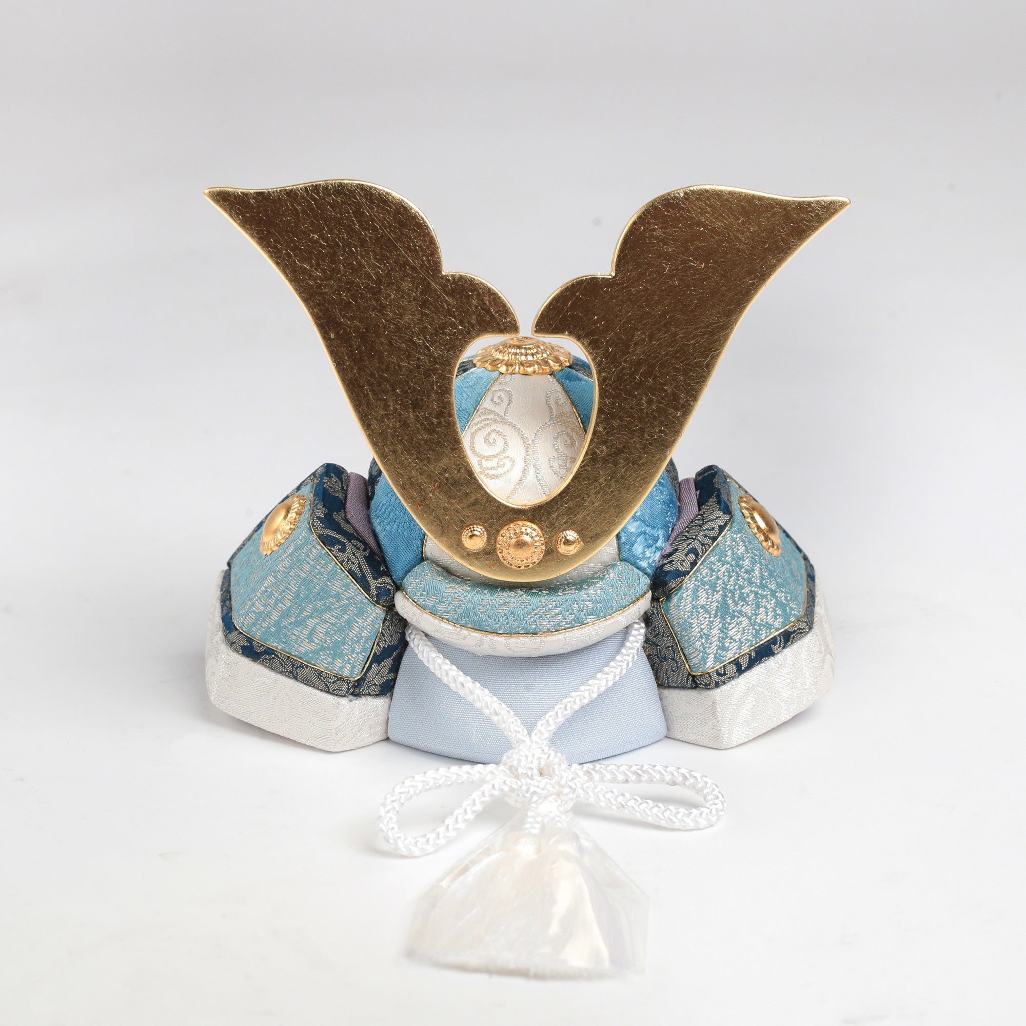やわらかな空色に、上品な金箔の輝きを添えた兜飾り。