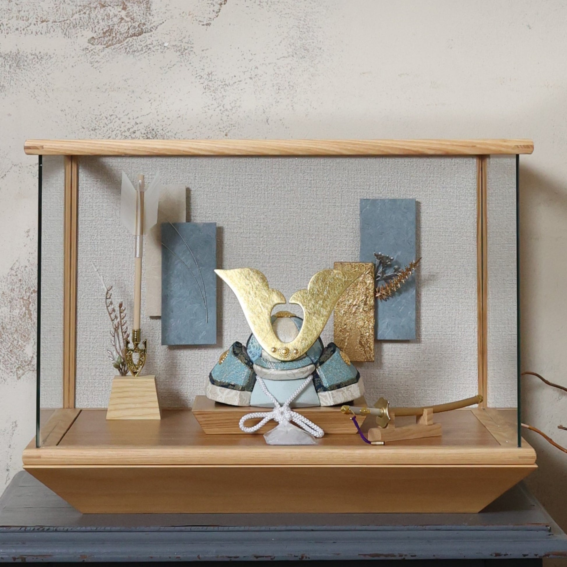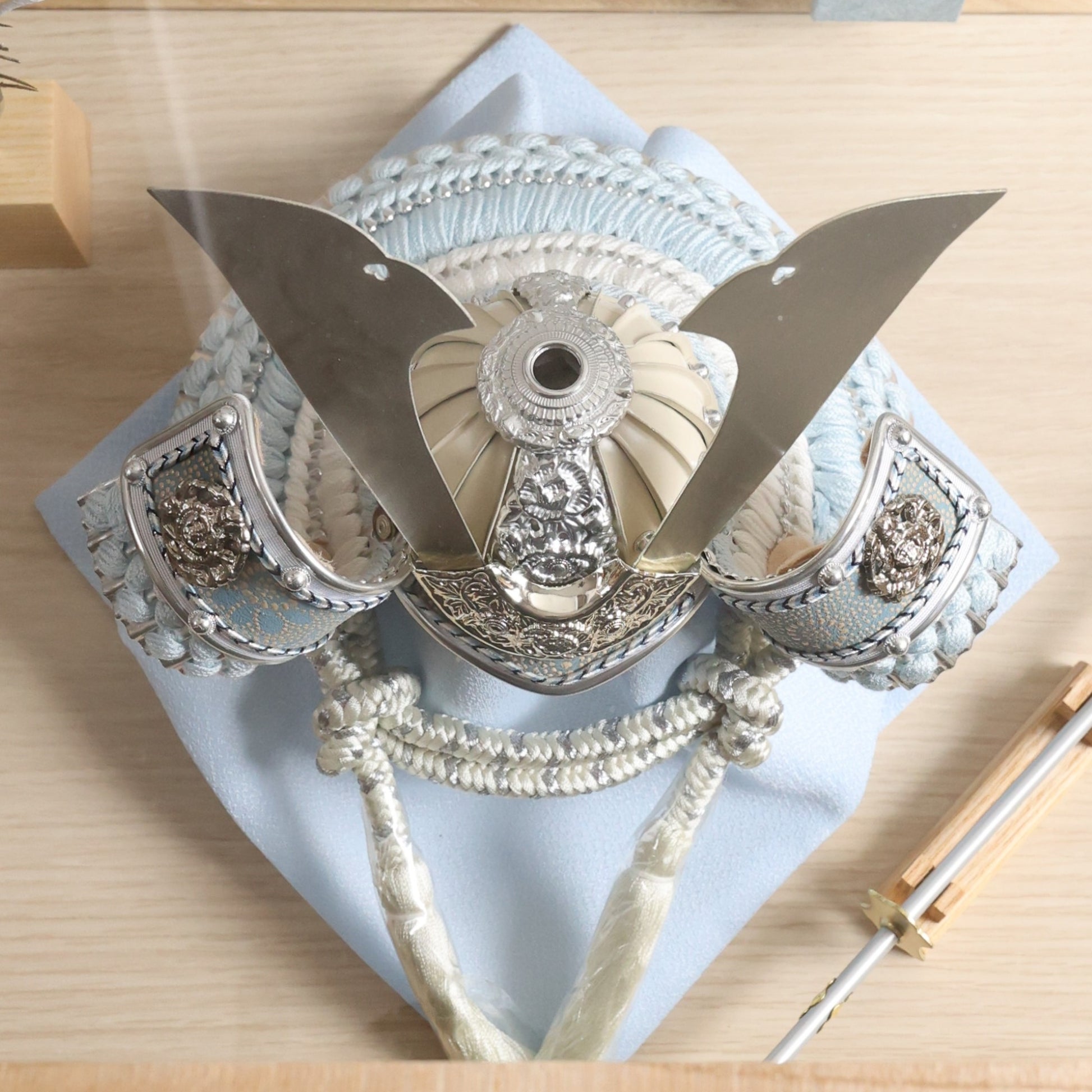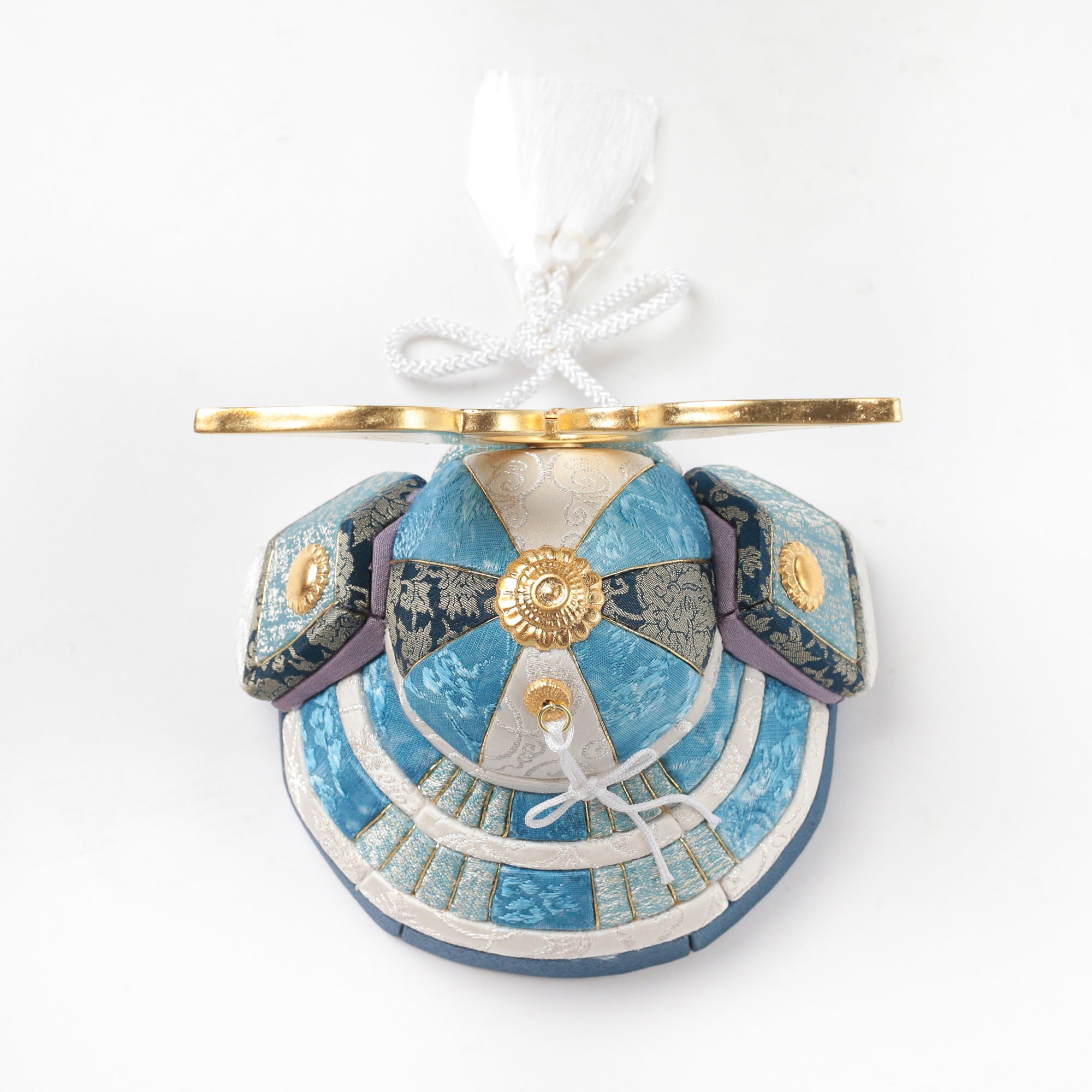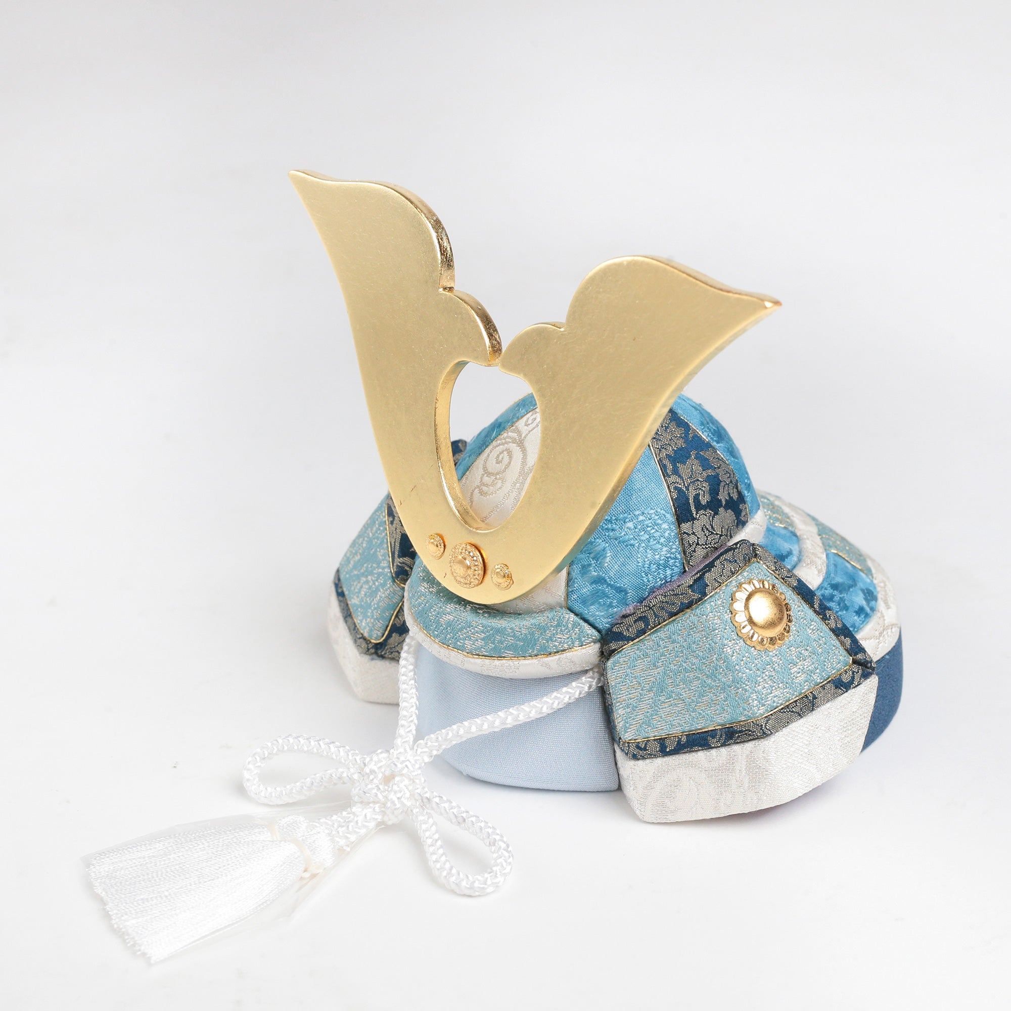 やわらかな空色に、上品な金箔の輝きを添えた兜飾り。