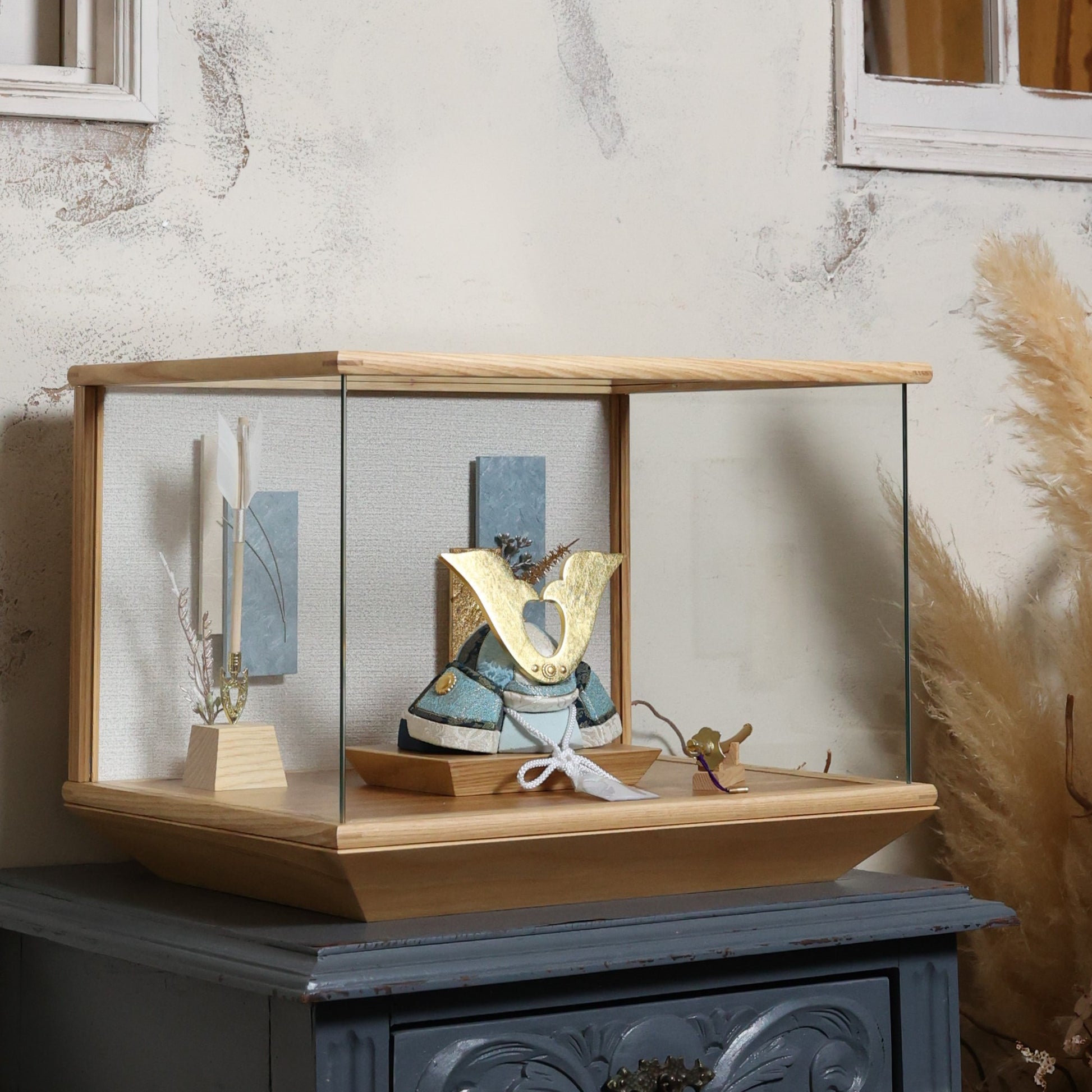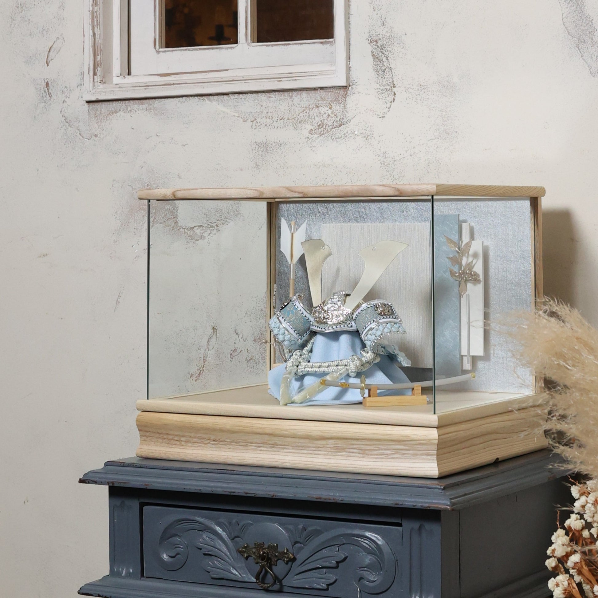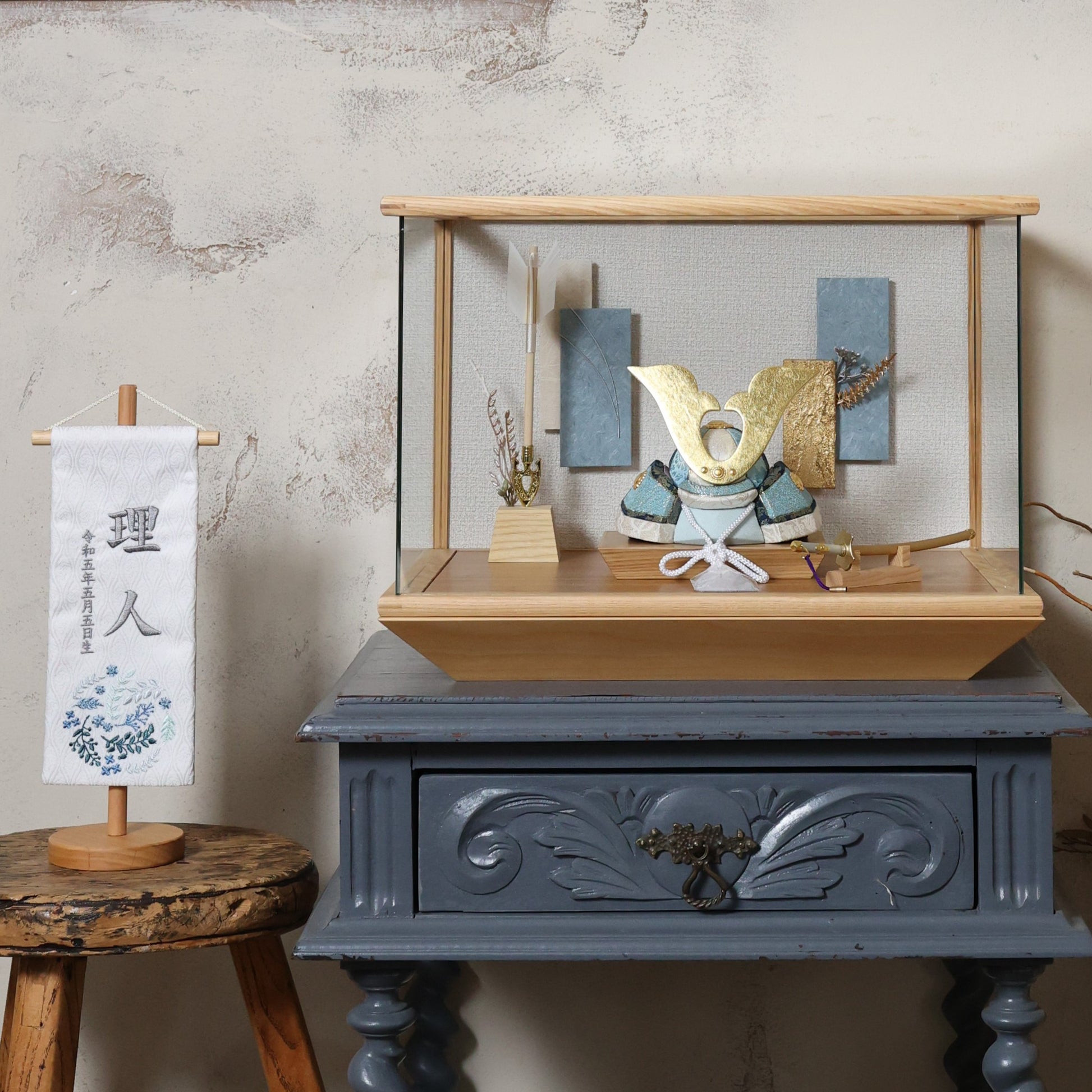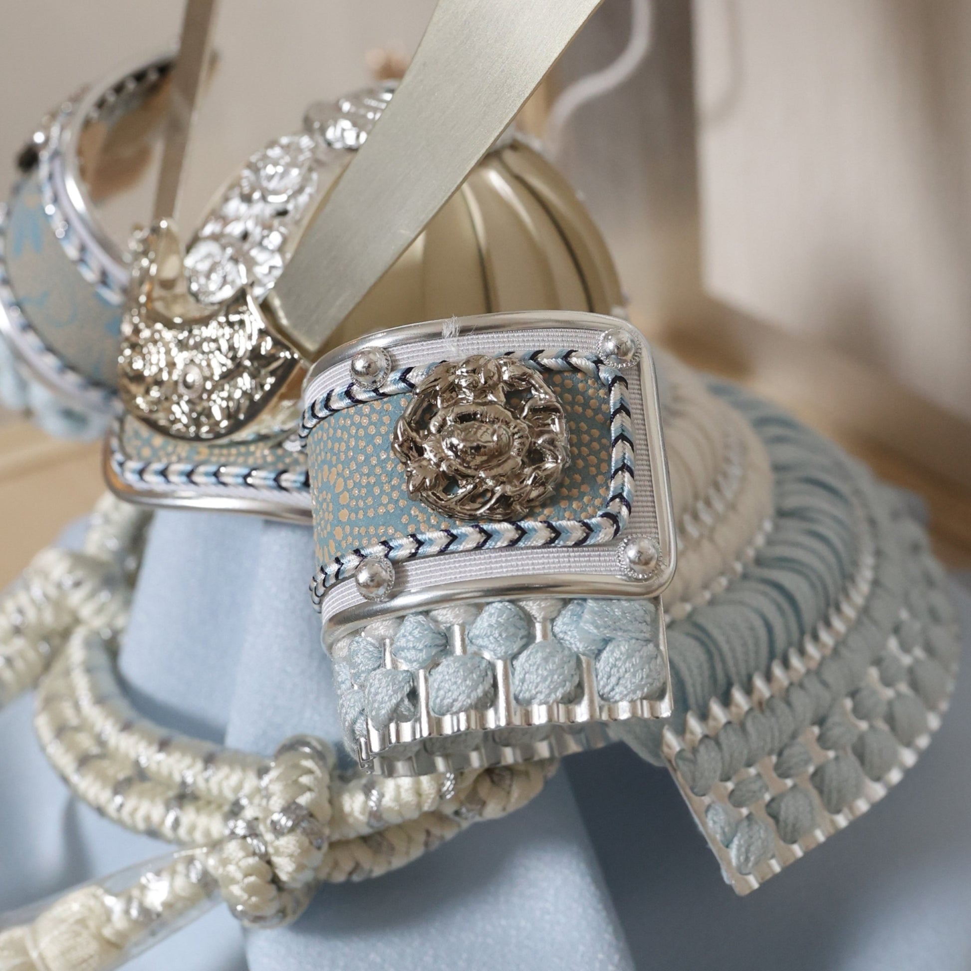やわらかな空色に、上品な金箔の輝きを添えた兜飾り。
