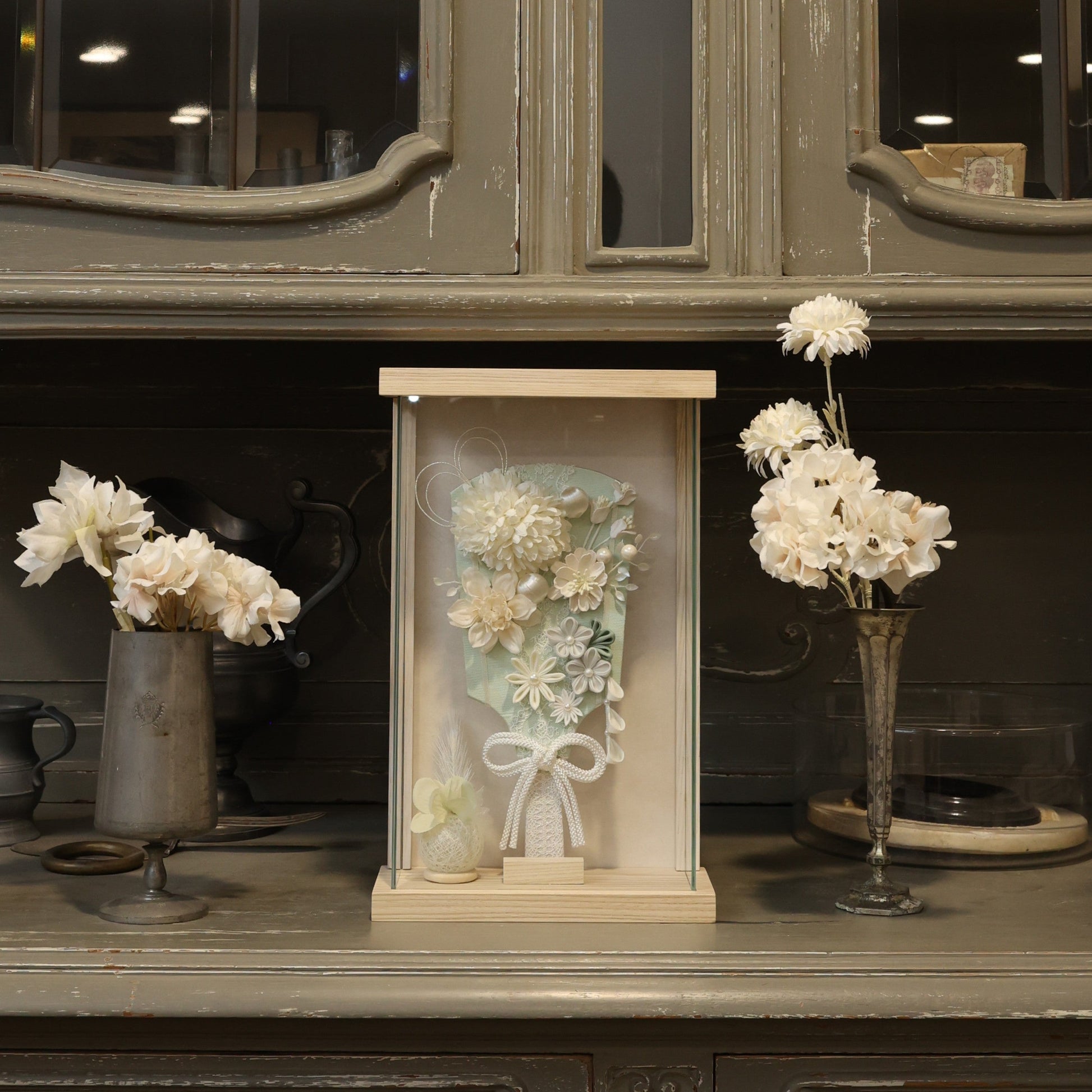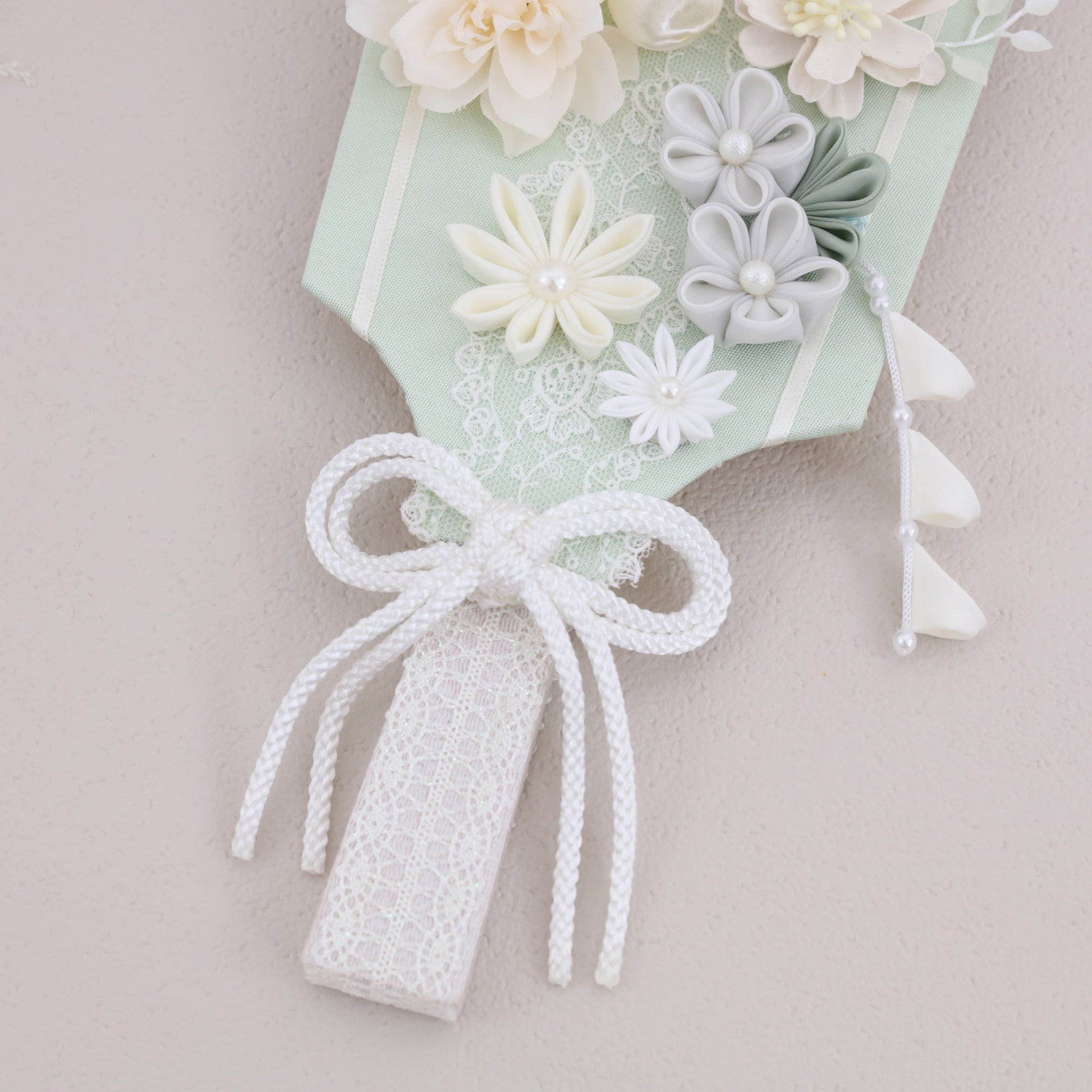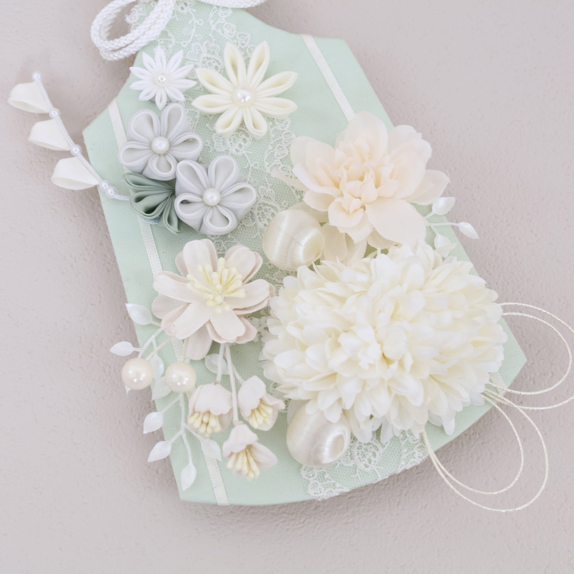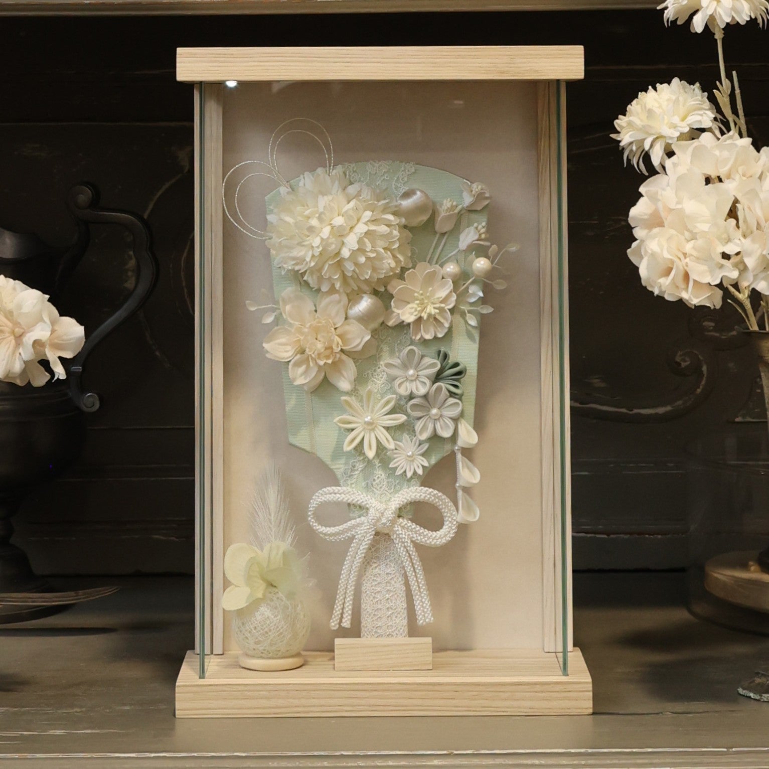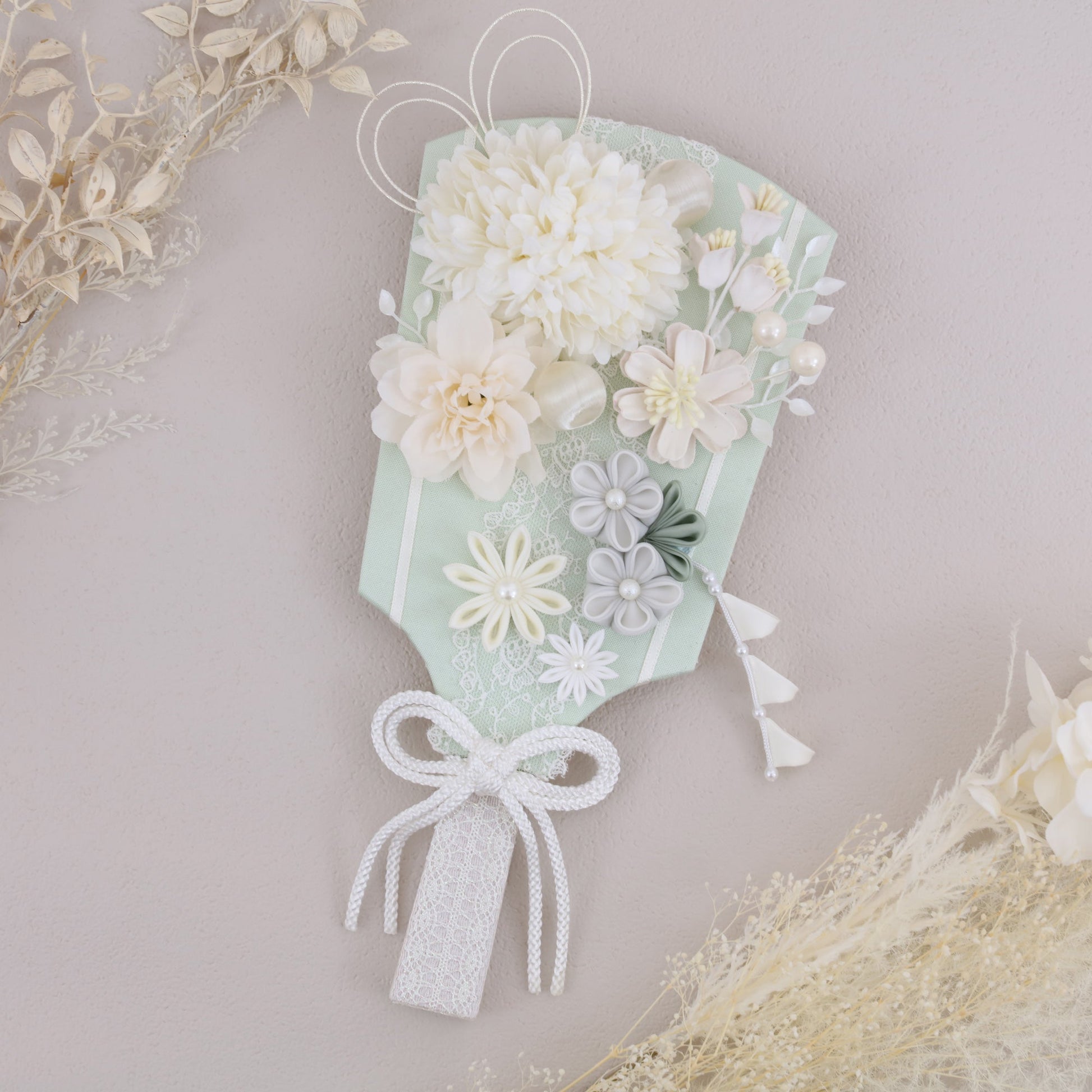 ブランマムをメインにあしらった羽子板飾りです。マムの「長寿」とタイニーサテンピックの華やかさが、子どもの健やかな成長をやさしく祝福します。