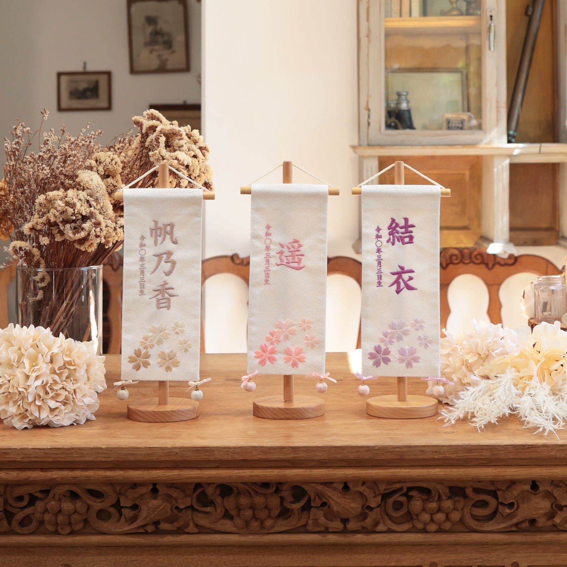 名前旗のデザインには、日本の伝統色を引き立てる洗練された美しさが込められています。祈りと願いを込めたデザイン設計は、祈デザイナーによって細部にまで丁寧に考案されています。生地選びから刺繍糸の色合わせに至るまで、すべてがこだわり抜かれ、一つひとつの要素が調和することで、特別な名前旗が完成します。
