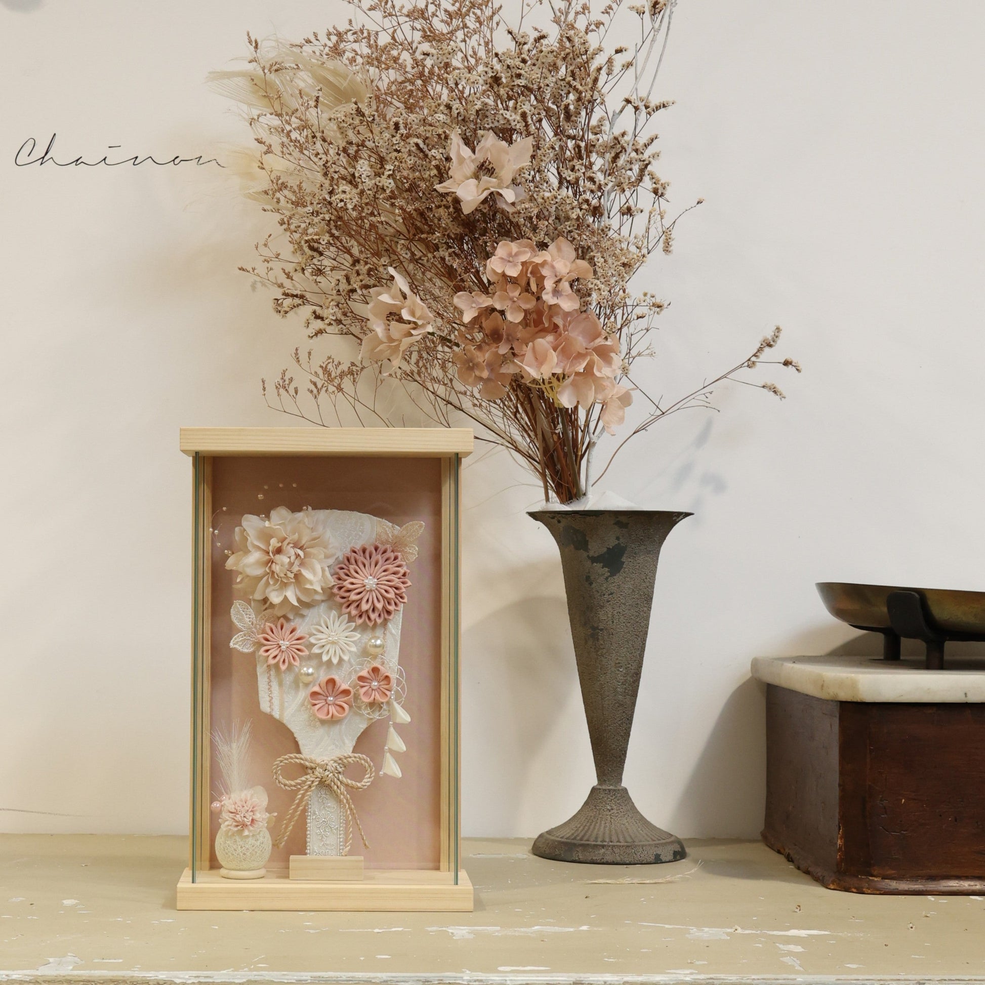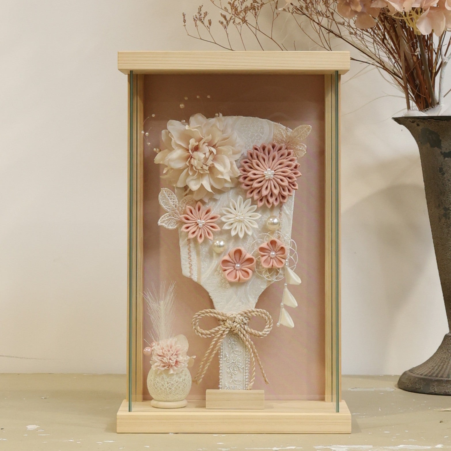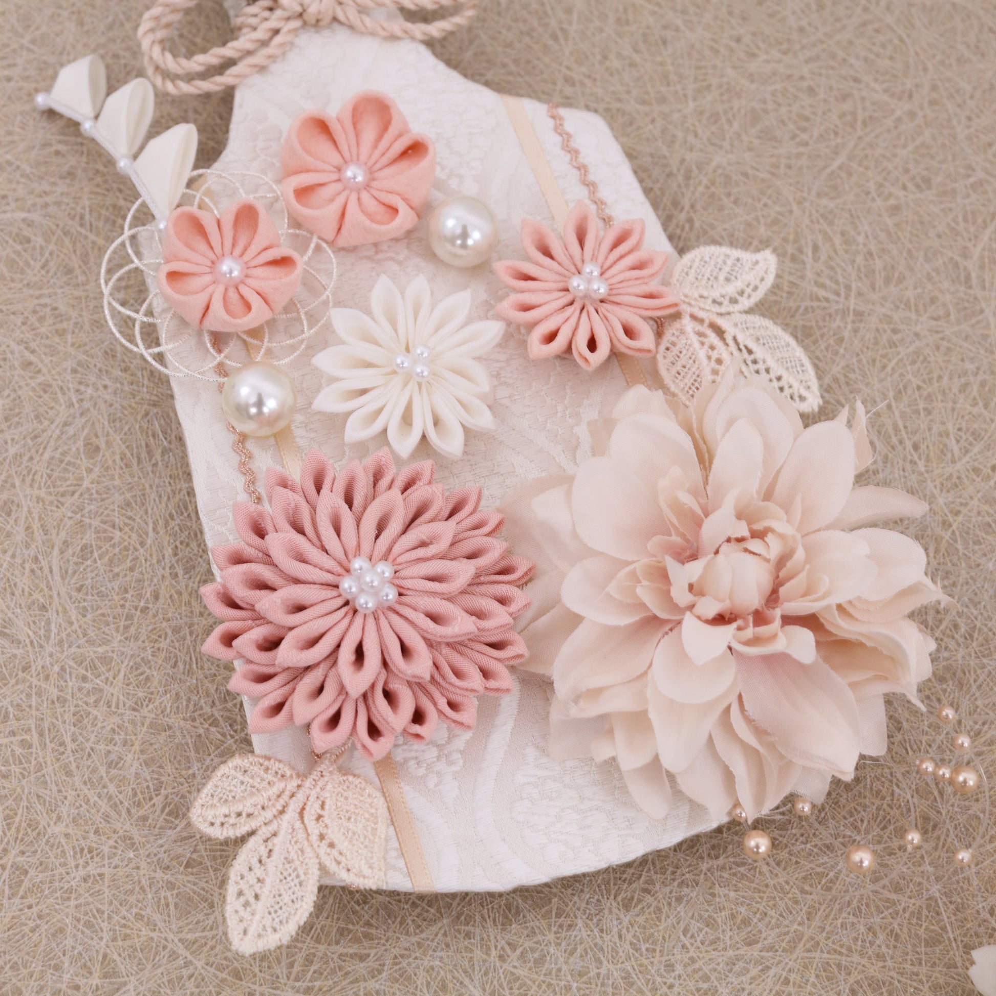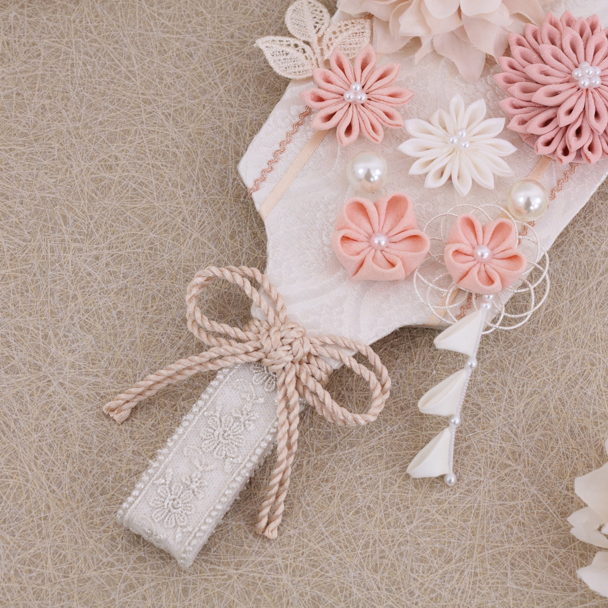 ダリアを中心にあしらった羽子板飾りです。ダリアの「華麗」が、ペールピンクとレースリーフ、パール、水引の柔らかな彩りで、子どもの健やかな日々を穏やかに祝福します。