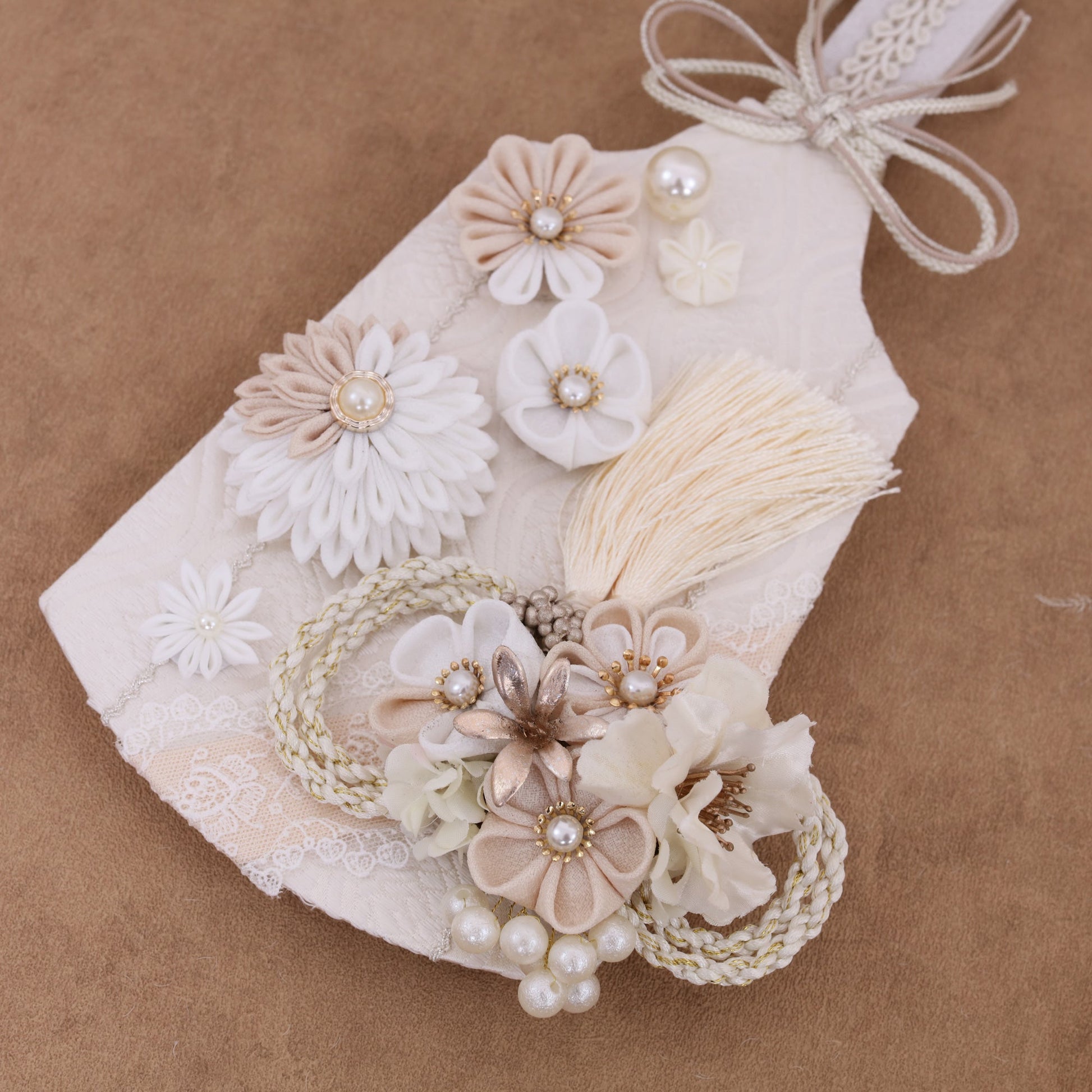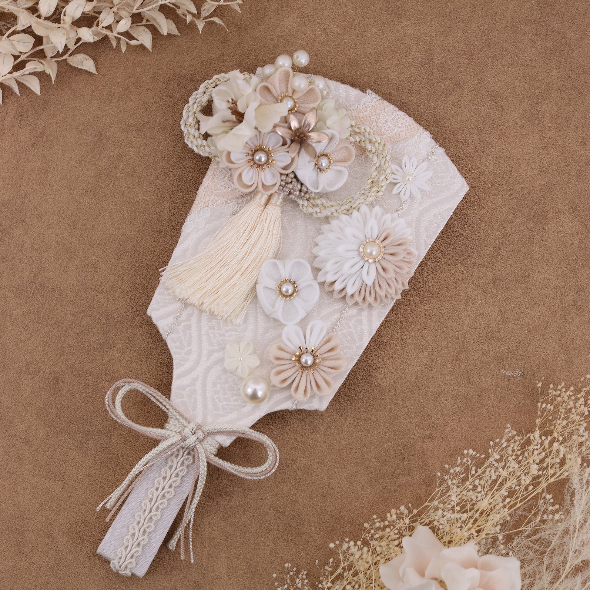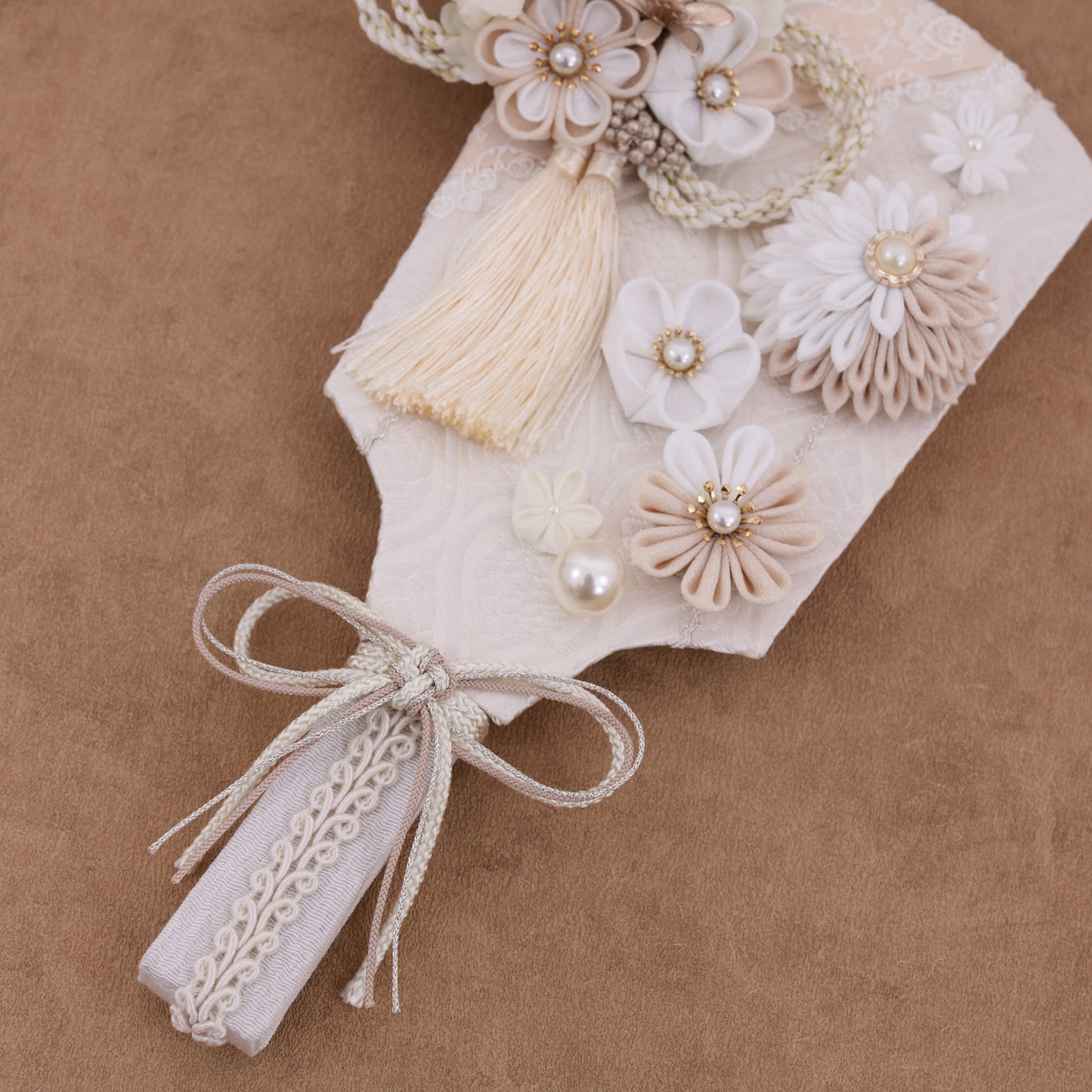 マムをメインにあしらった羽子板飾りです。マムの「長寿」とやさしいペールピンク、ホワイトの色合いが、子どもの健やかな成長を穏やかに見守ります。髪飾りとしても楽しめます。