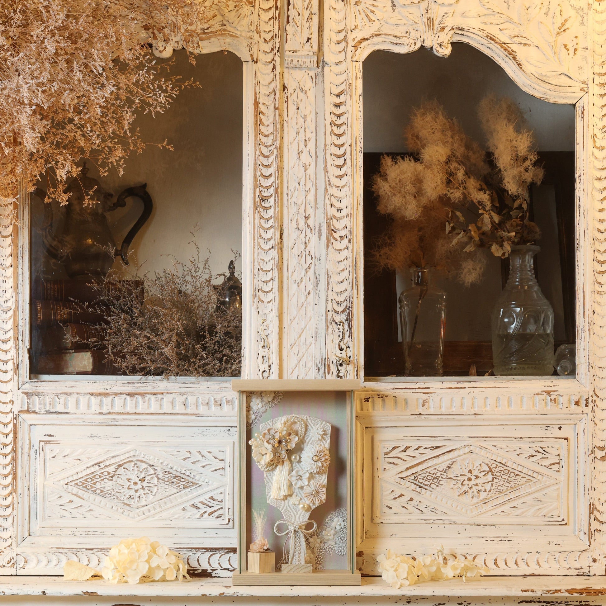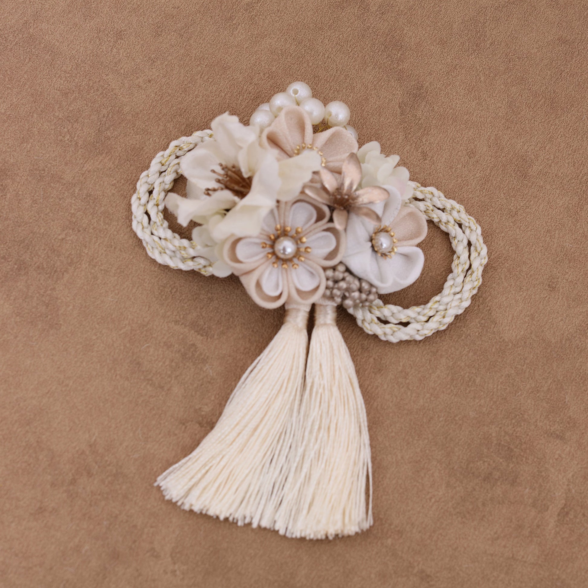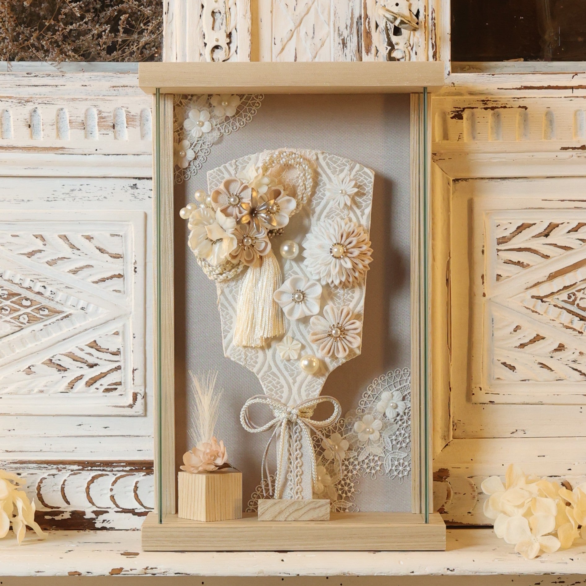 マムをメインにあしらった羽子板飾りです。マムの「長寿」とやさしいペールピンク、ホワイトの色合いが、子どもの健やかな成長を穏やかに見守ります。髪飾りとしても楽しめます。