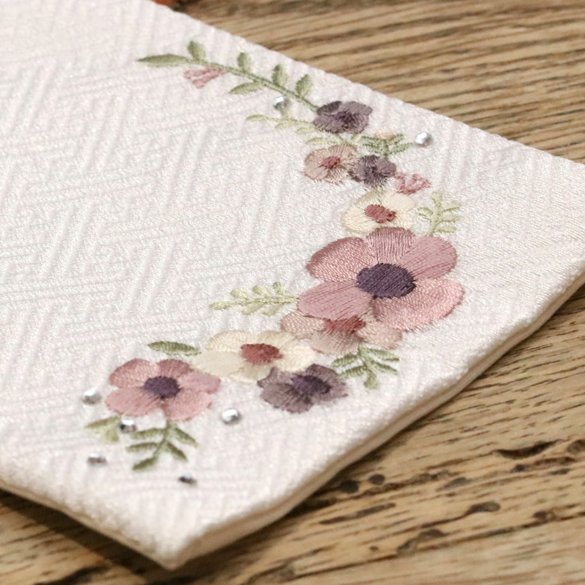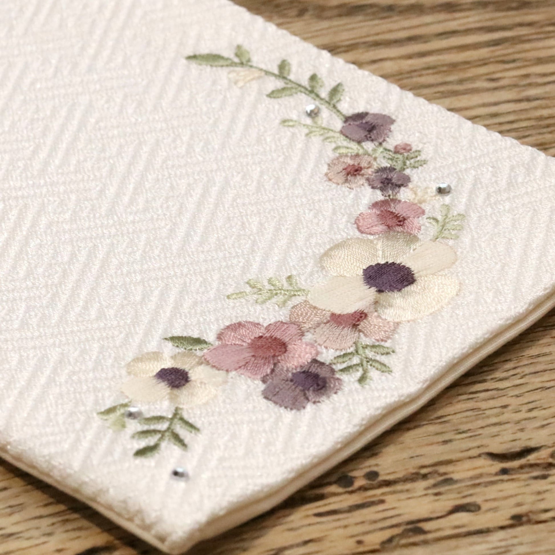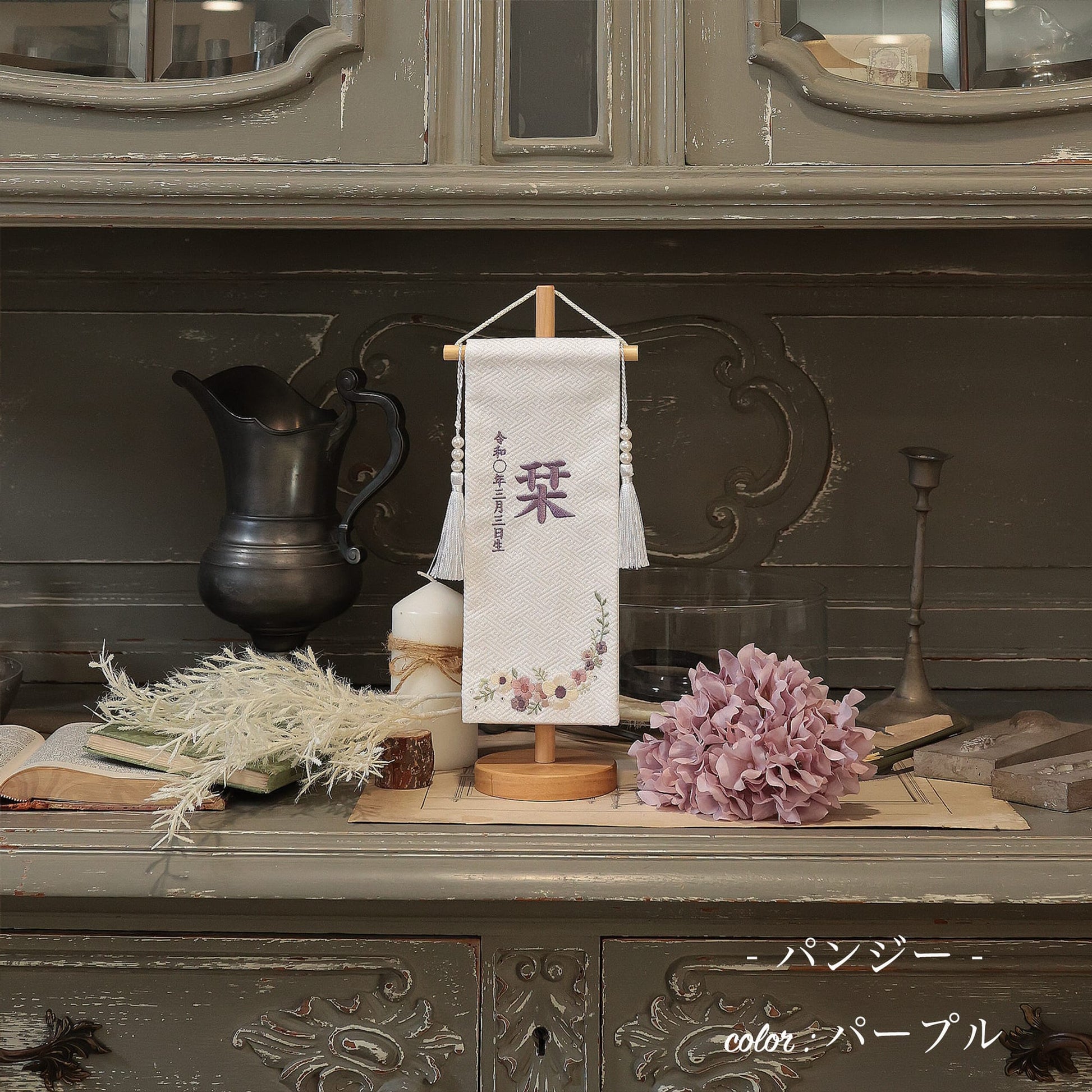 愛と深い思いを象徴するパンジーが使われています。パンジーは「心の平和」「思い出」という花言葉を持ち、赤ちゃんの健やかな成長を見守る存在としてぴったりです。さらに、輝きを放つスワロフスキーを取り入れることで、美しさを引き立てています。生地には伝統的な紗綾形文様を使用し、和の優雅さを演出。紗綾形は「無限」を意味し、赤ちゃんの未来が豊かに広がっていく様子を表しています。赤ちゃんに対する深い愛情と希望を込めた特別な贈り物です。