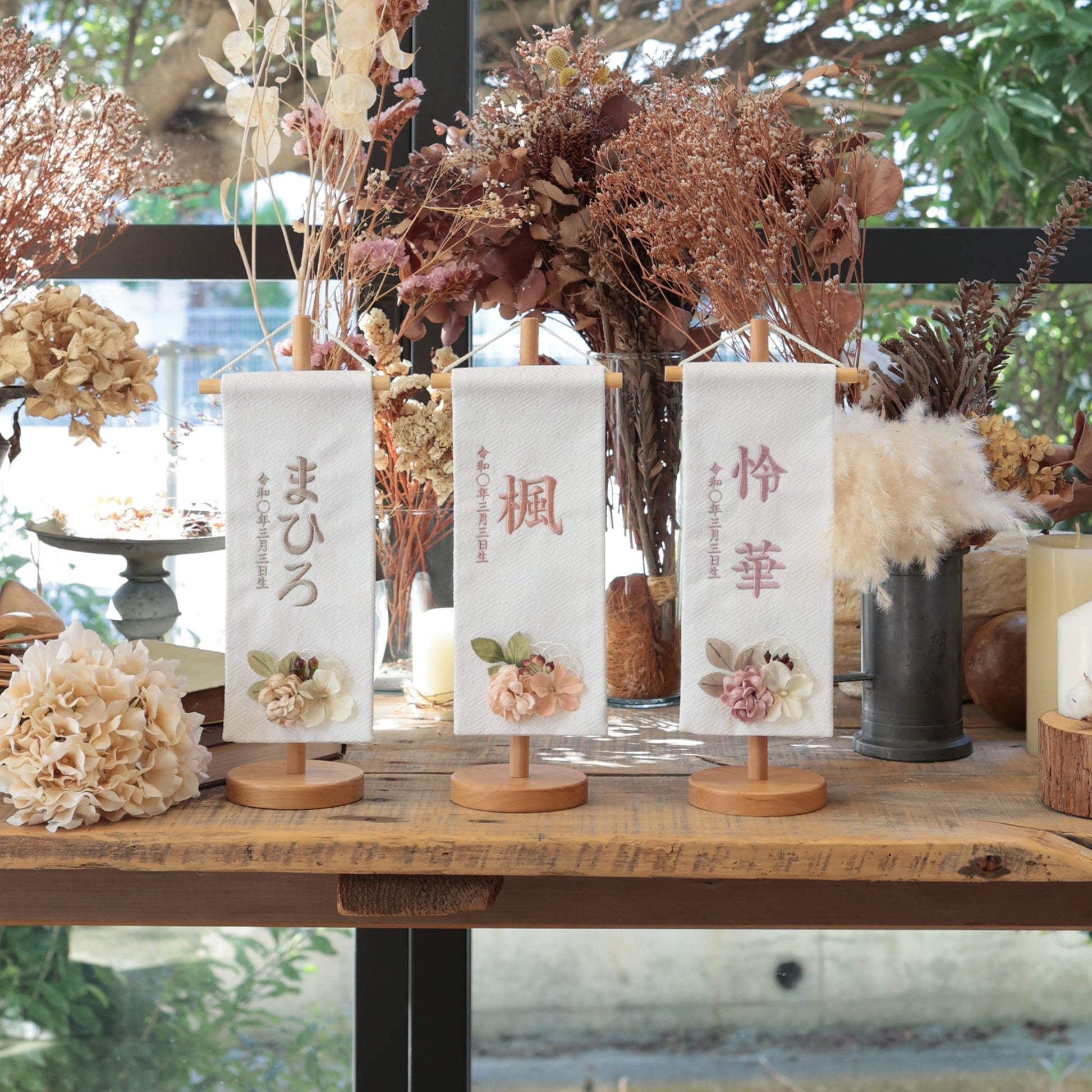 名前旗のデザインには、日本の伝統色を引き立てる洗練された美しさが込められています。祈りと願いを込めたデザイン設計は、祈デザイナーによって細部にまで丁寧に考案されています。生地選びから刺繍糸の色合わせに至るまで、すべてがこだわり抜かれ、一つひとつの要素が調和することで、特別な名前旗が完成します。