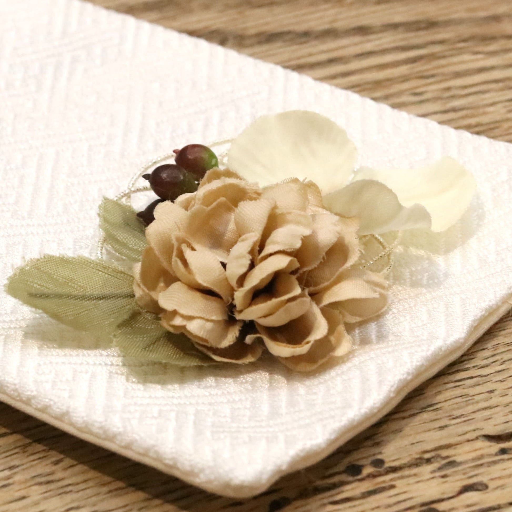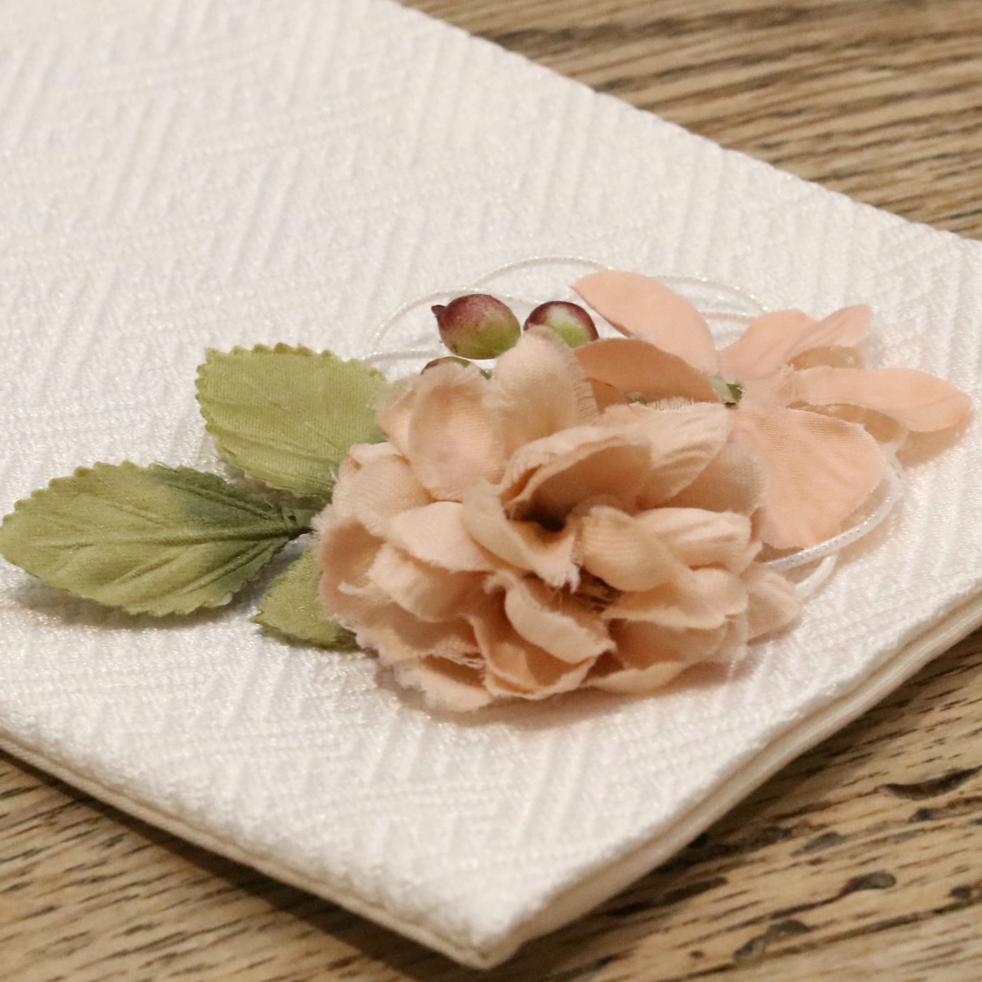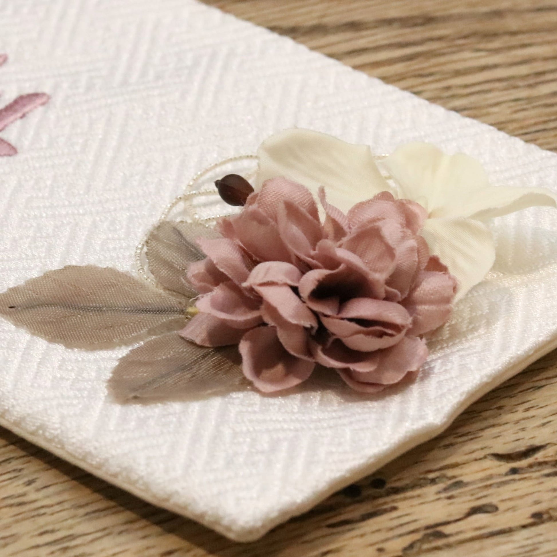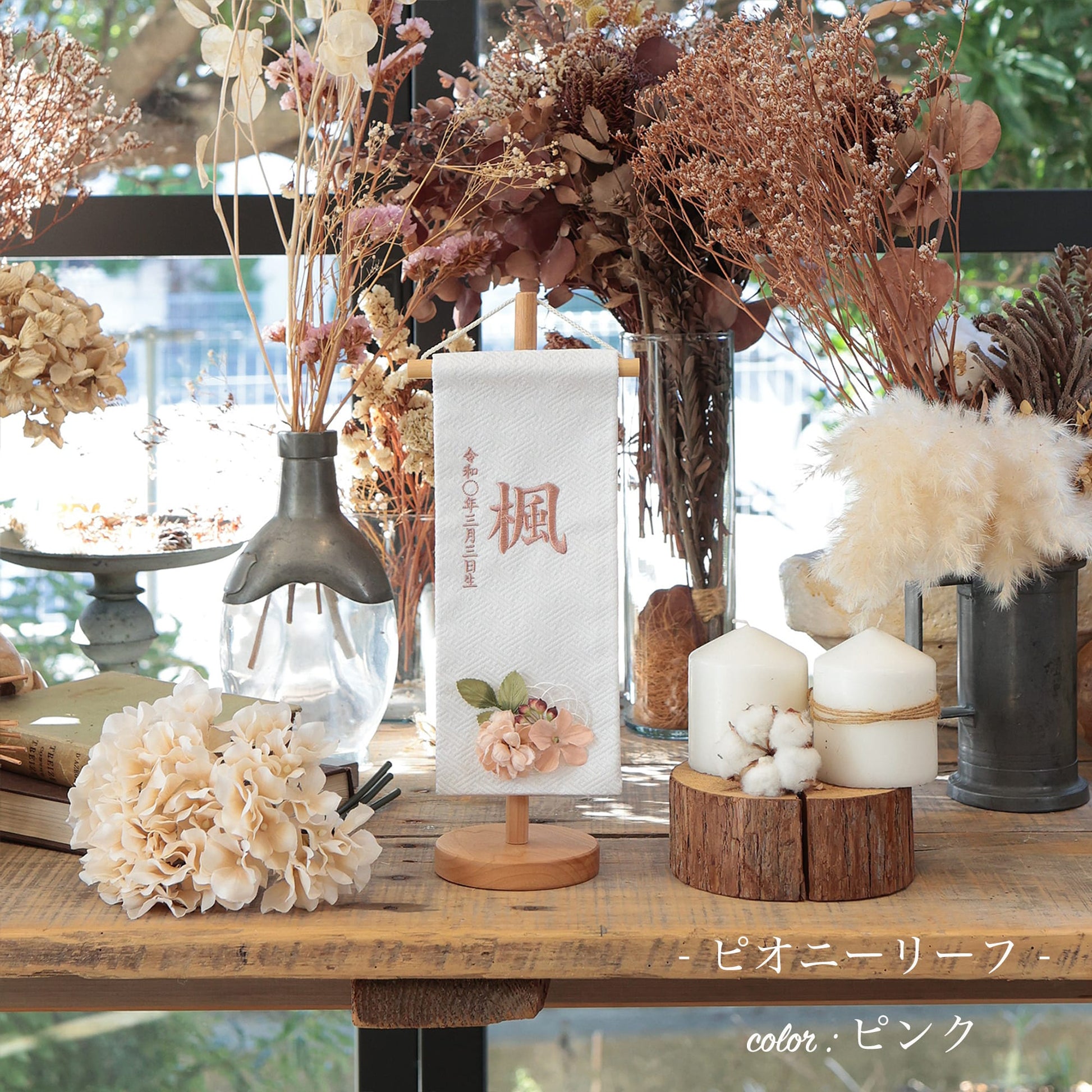 愛らしい赤ちゃんの成長を願う気持ちを込めて、厳選した花々や美しい生地でデザインされています。主役の「シャクヤク」は「恵まれた未来」を象徴し、これからの希望に満ちた人生を祝福します。「アジサイ」は「家族の絆」や「友情」を表し、いつまでも温かいつながりを持つことを願います。