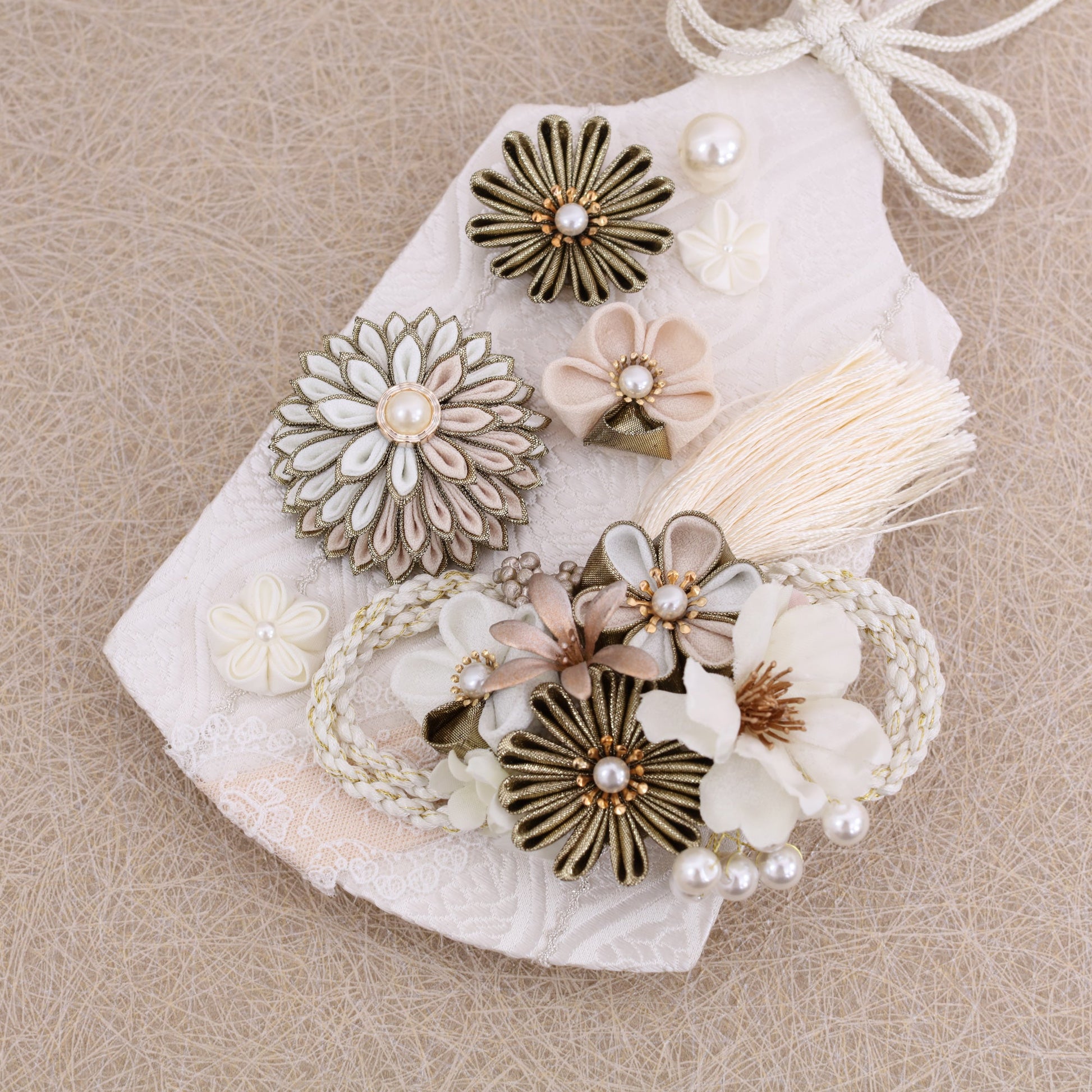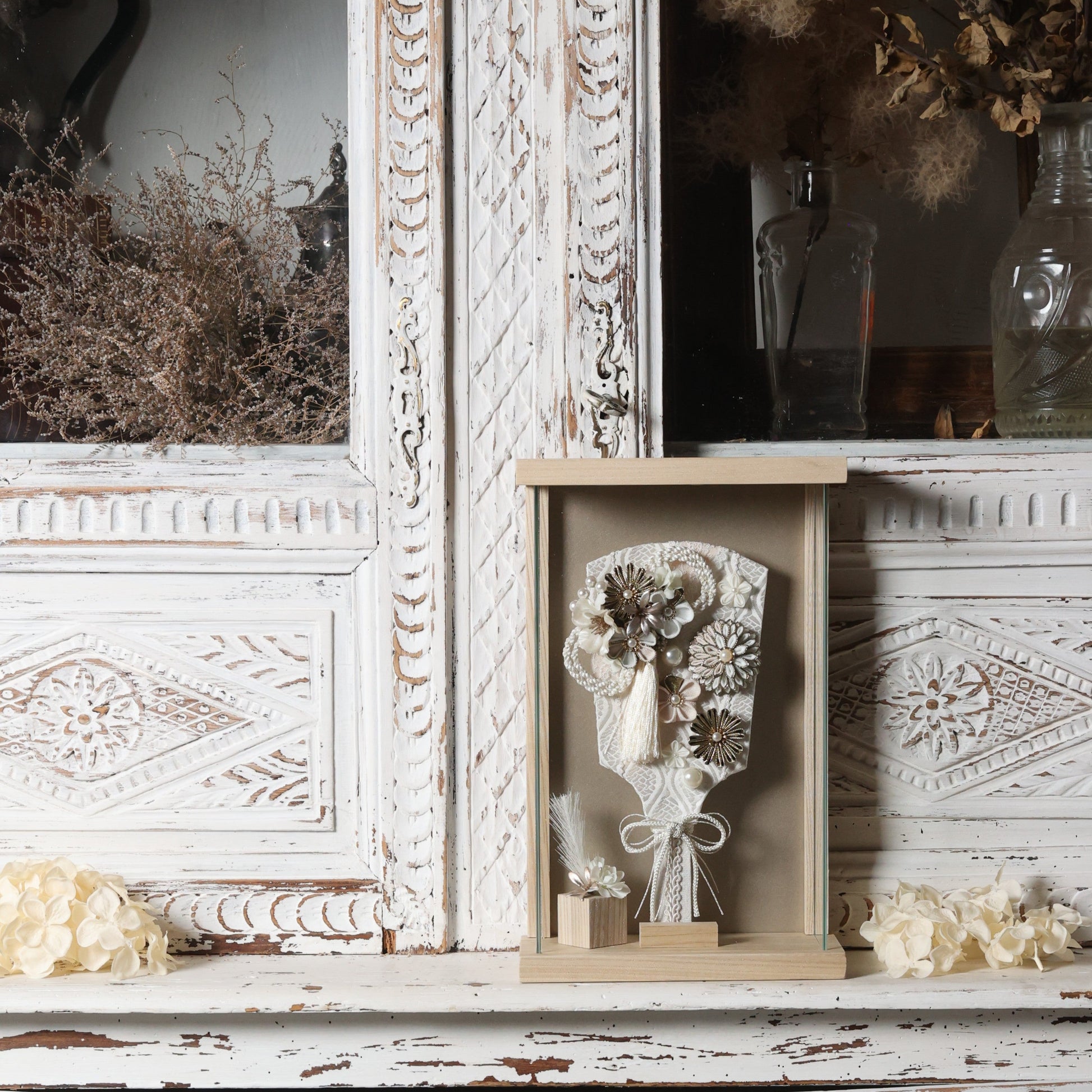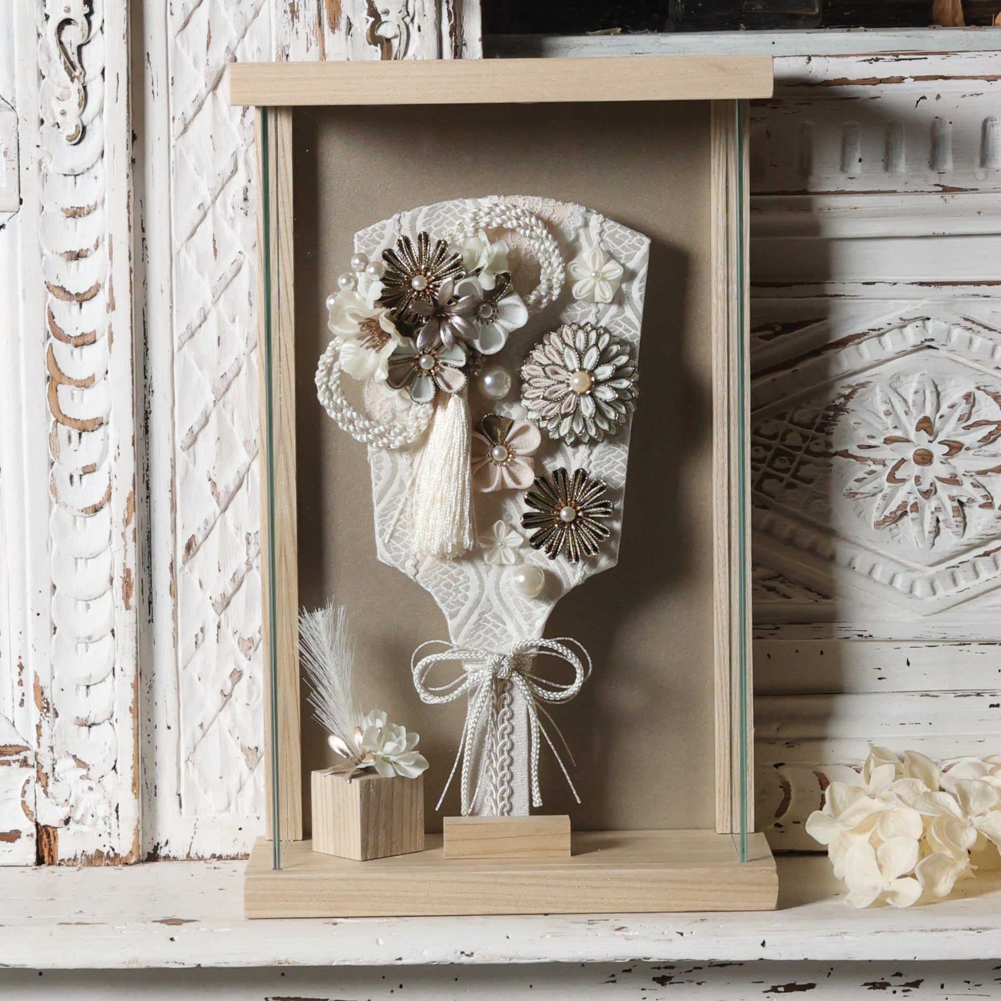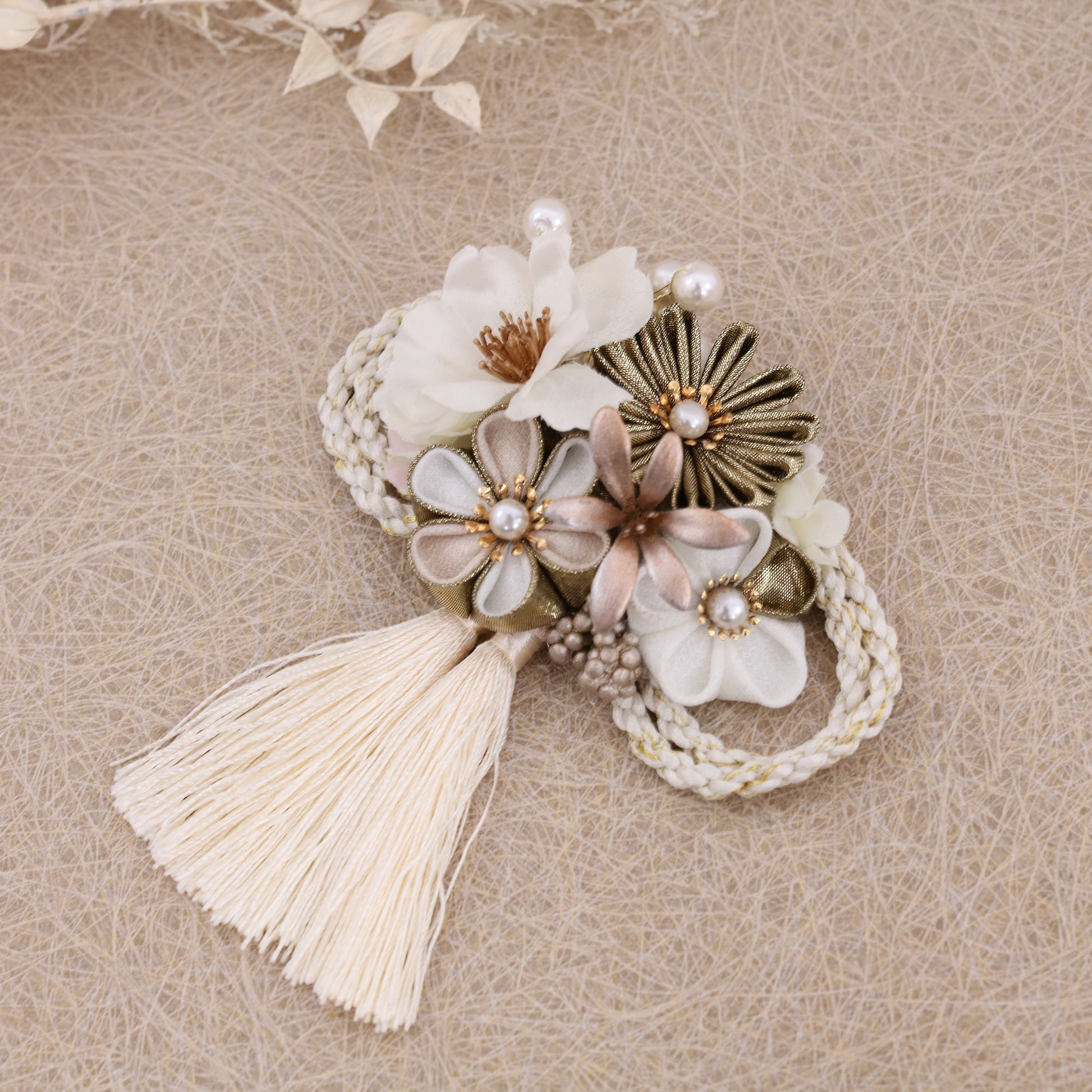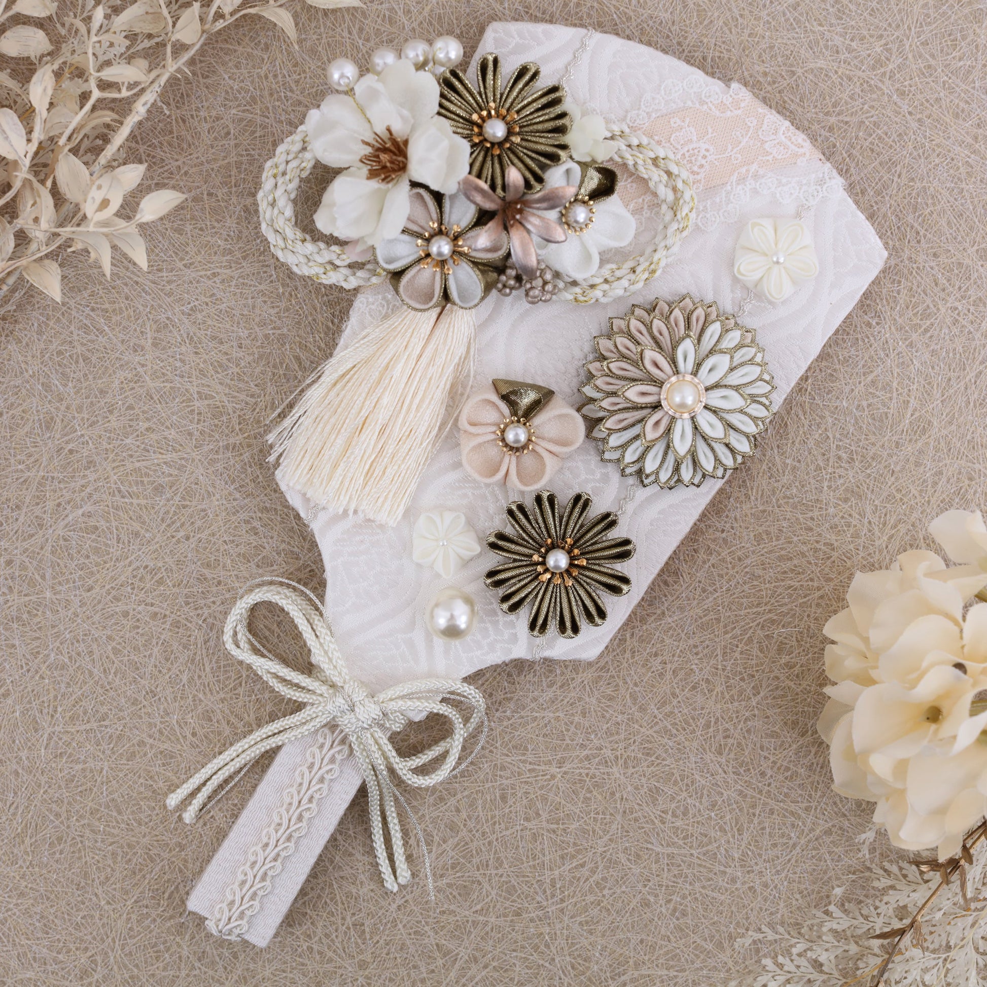 マムを中心にあしらった羽子板飾りです。ホワイトとペールピンク、ゴールドの華やかな彩りが、子どもの健やかな日々と幸せをそっと祝福します。髪飾りとしても使える特別な一品です。