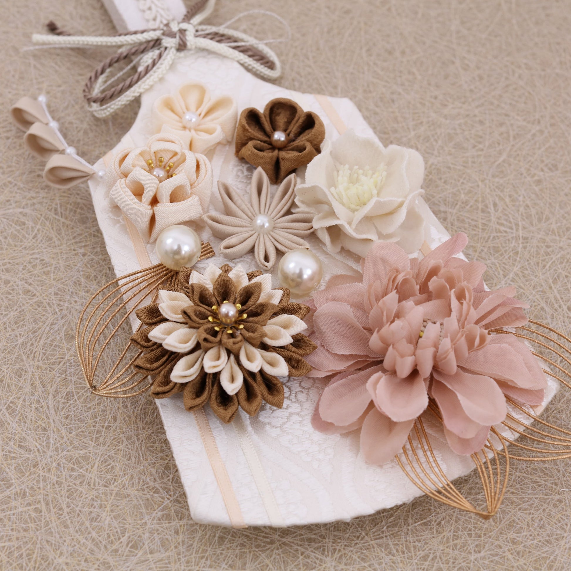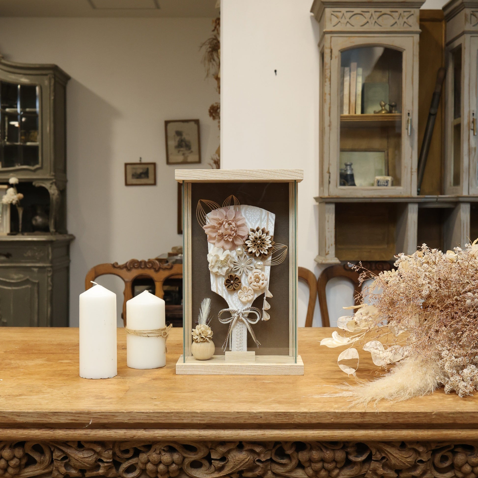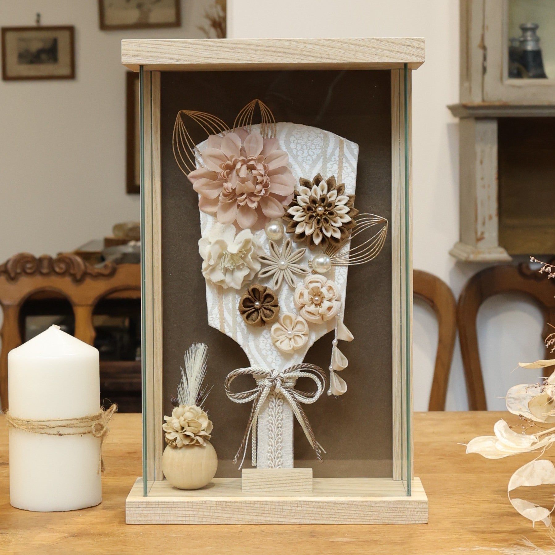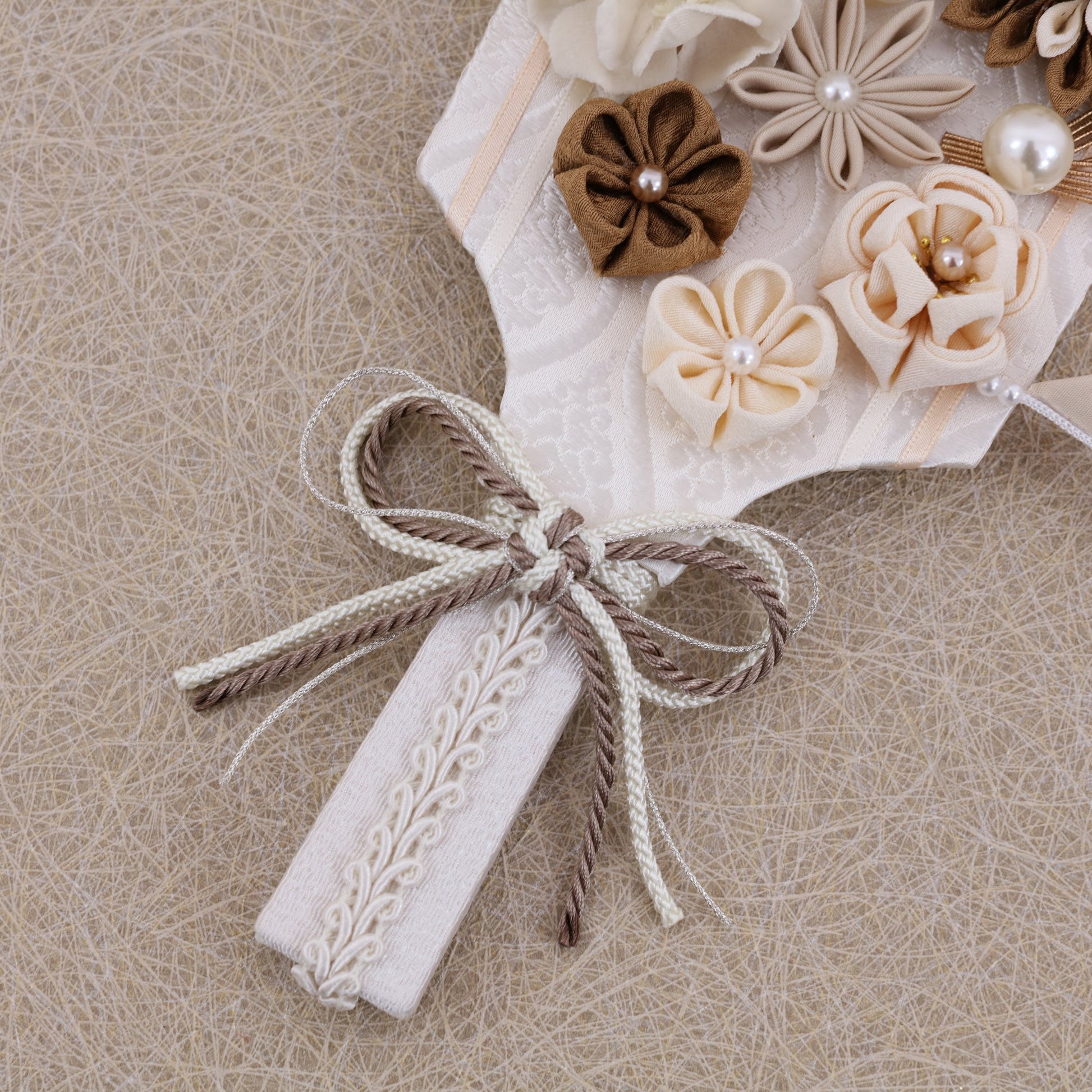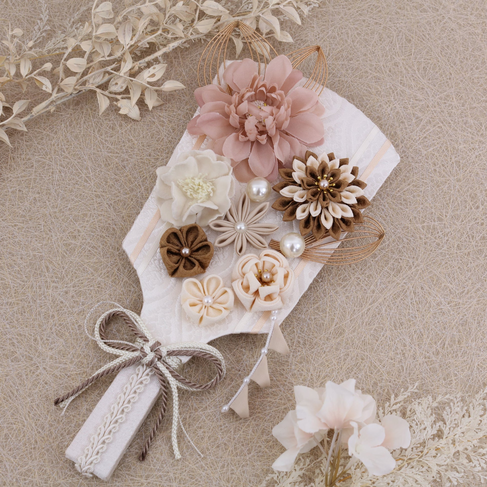 この羽子板は、「カフェオレのダリア」という優雅な花飾りで、温かみのあるブラウンとクリーム色の配色が特徴です。ダリアは豊穣や華やかさを象徴し、赤ちゃんの健やかな成長を祈願するデザインとして選ばれました。 装飾には、ハートの水引結びが施されており、愛情と絆の意味を込めています。
