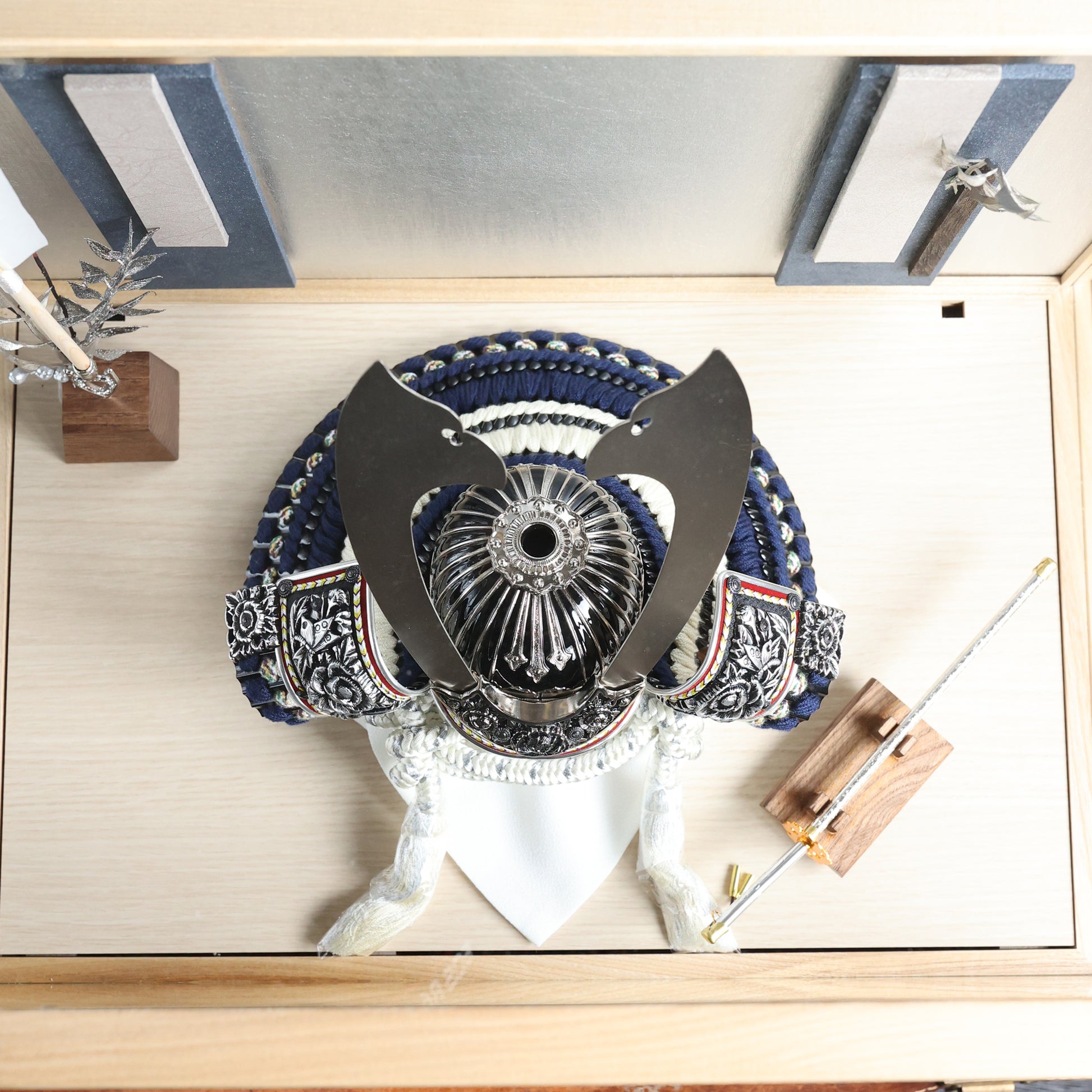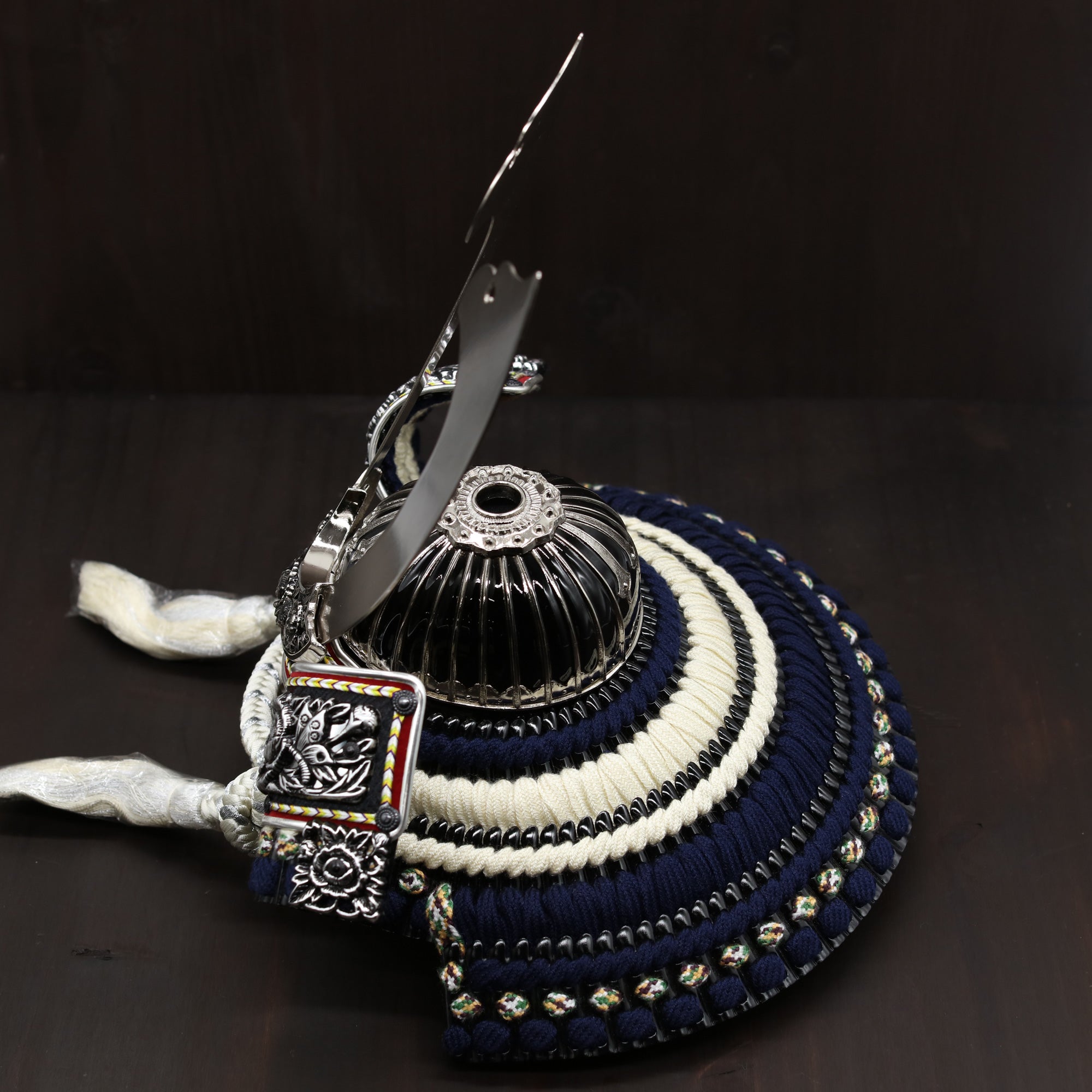 兜の後ろ姿には、白紺色の威し糸が丁寧に施されており、伝統と気品を感じさせる仕上がりとなっています。この深みのある色合いの糸が、兜全体に落ち着いた華やかさを添え、背面からも美しい印象を与えます。細部までこだわった職人の技が光る後ろ姿は、見る人の心を惹きつける存在感を放っています。