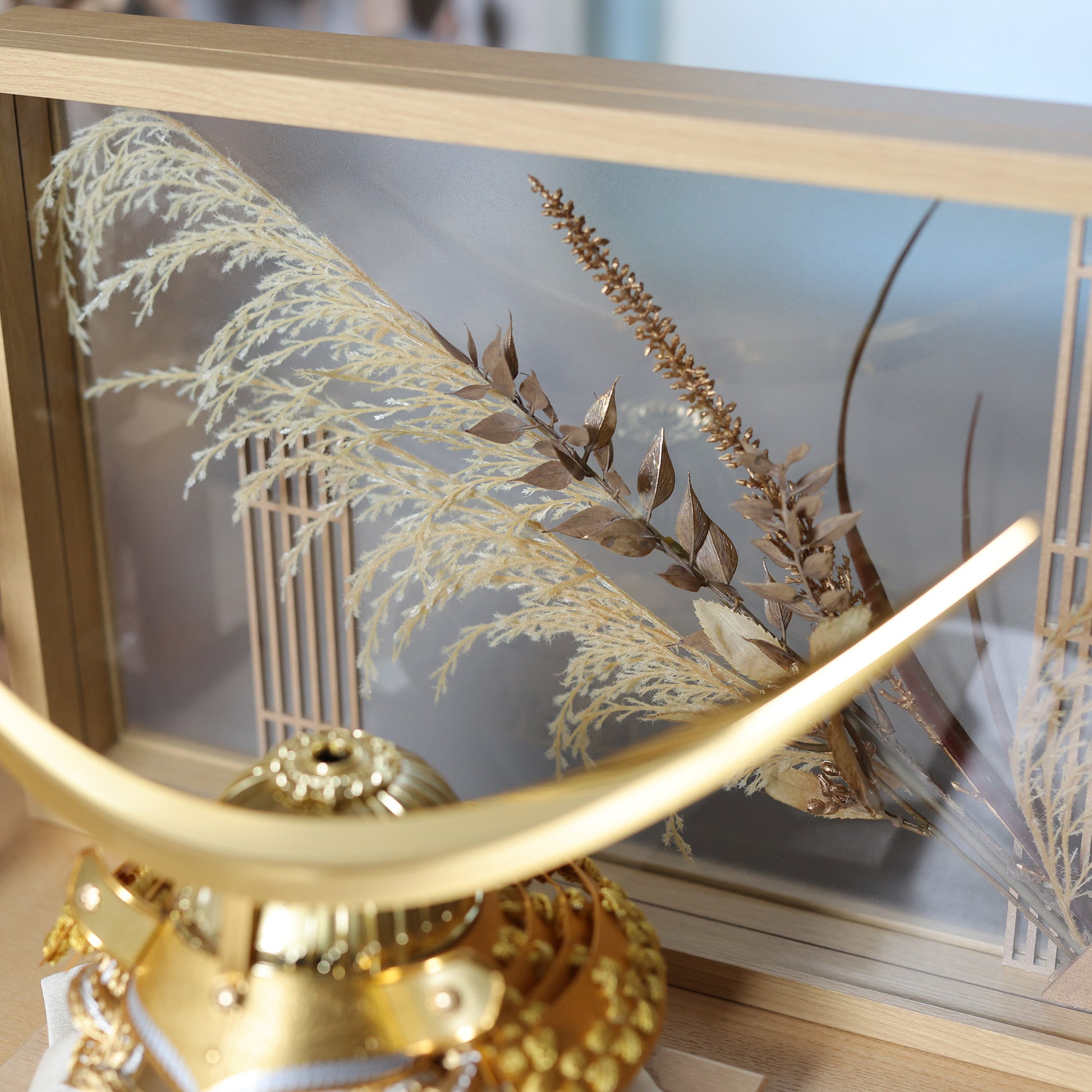 光を受けて柔らかく立ち上がり、兜に凛とした威厳と品格を添えます。