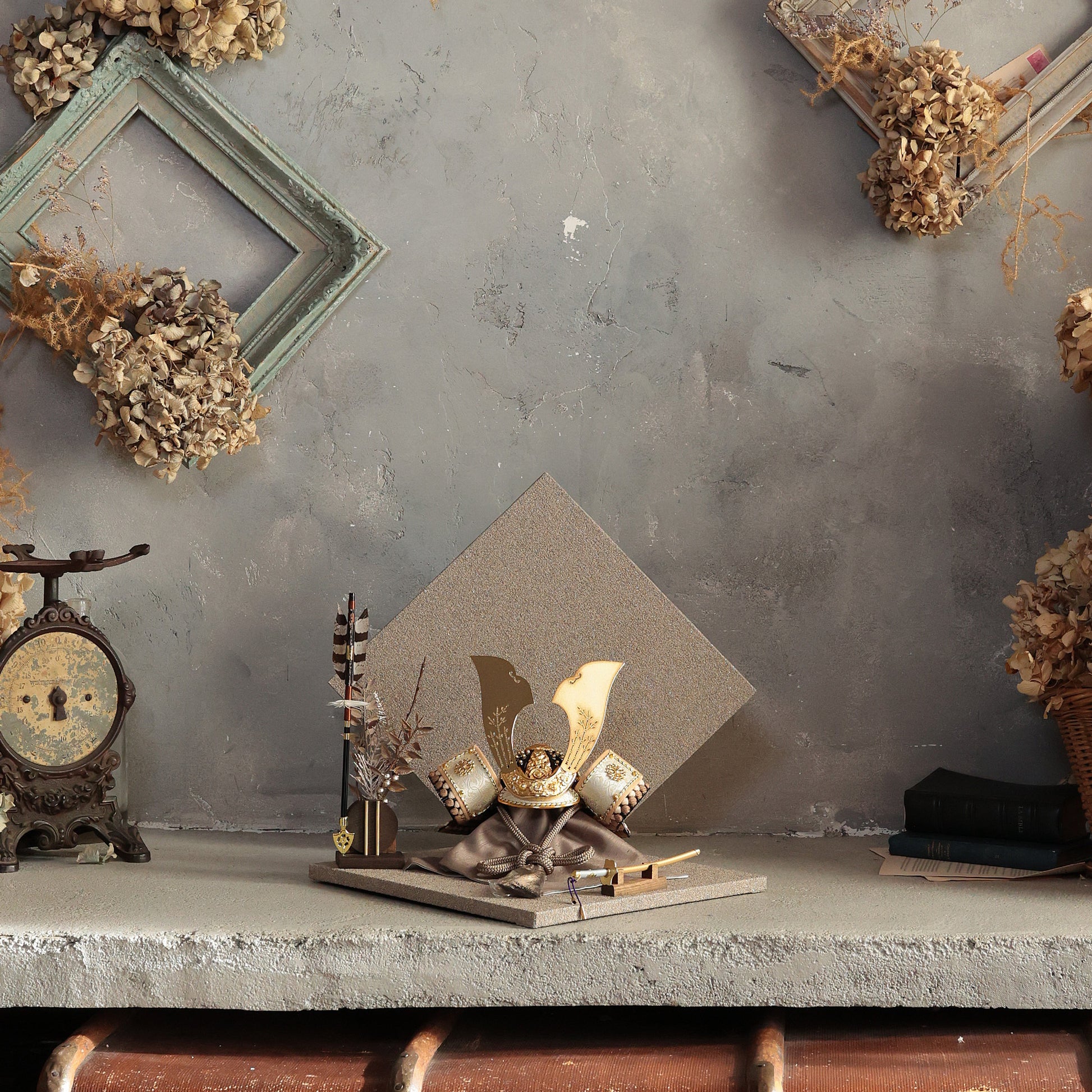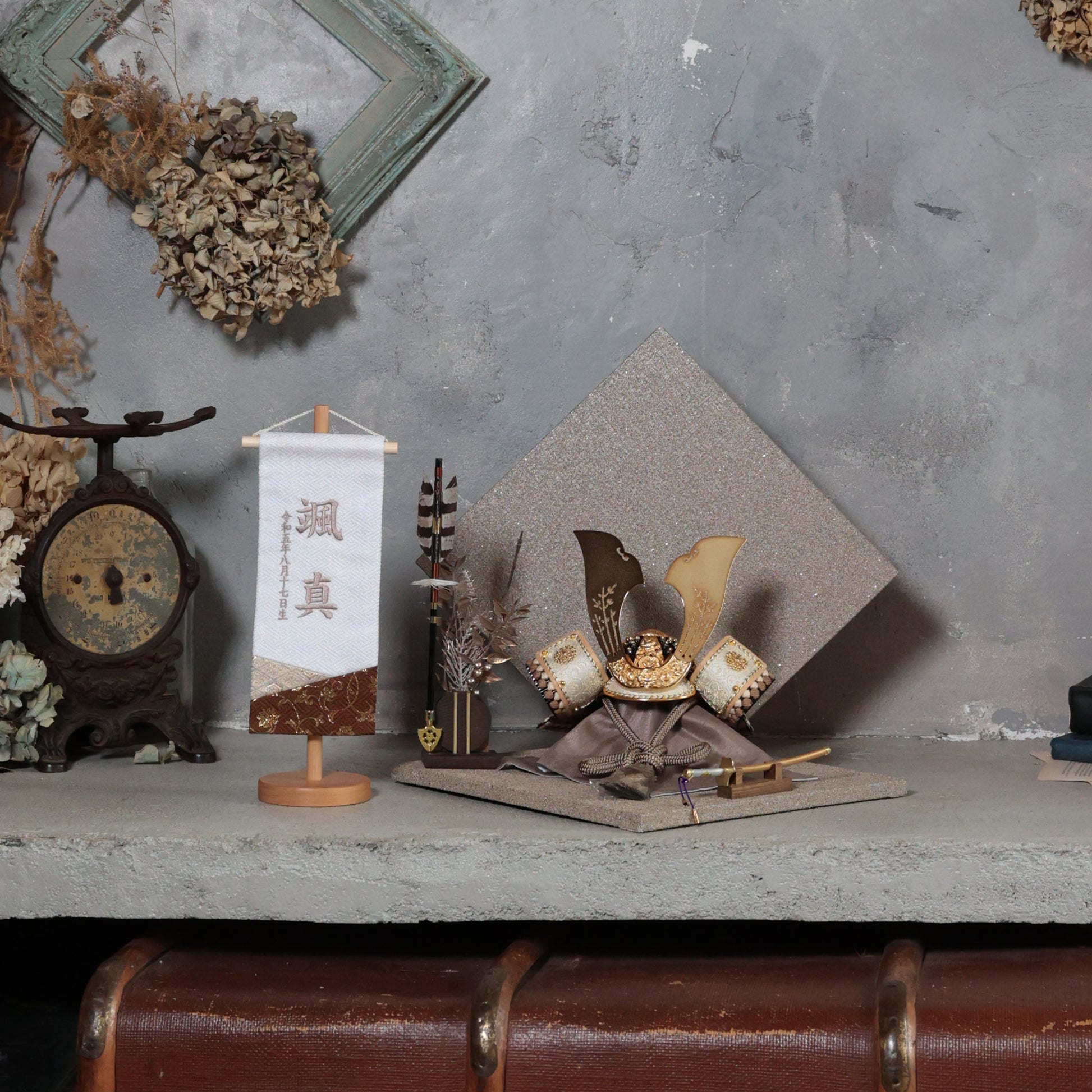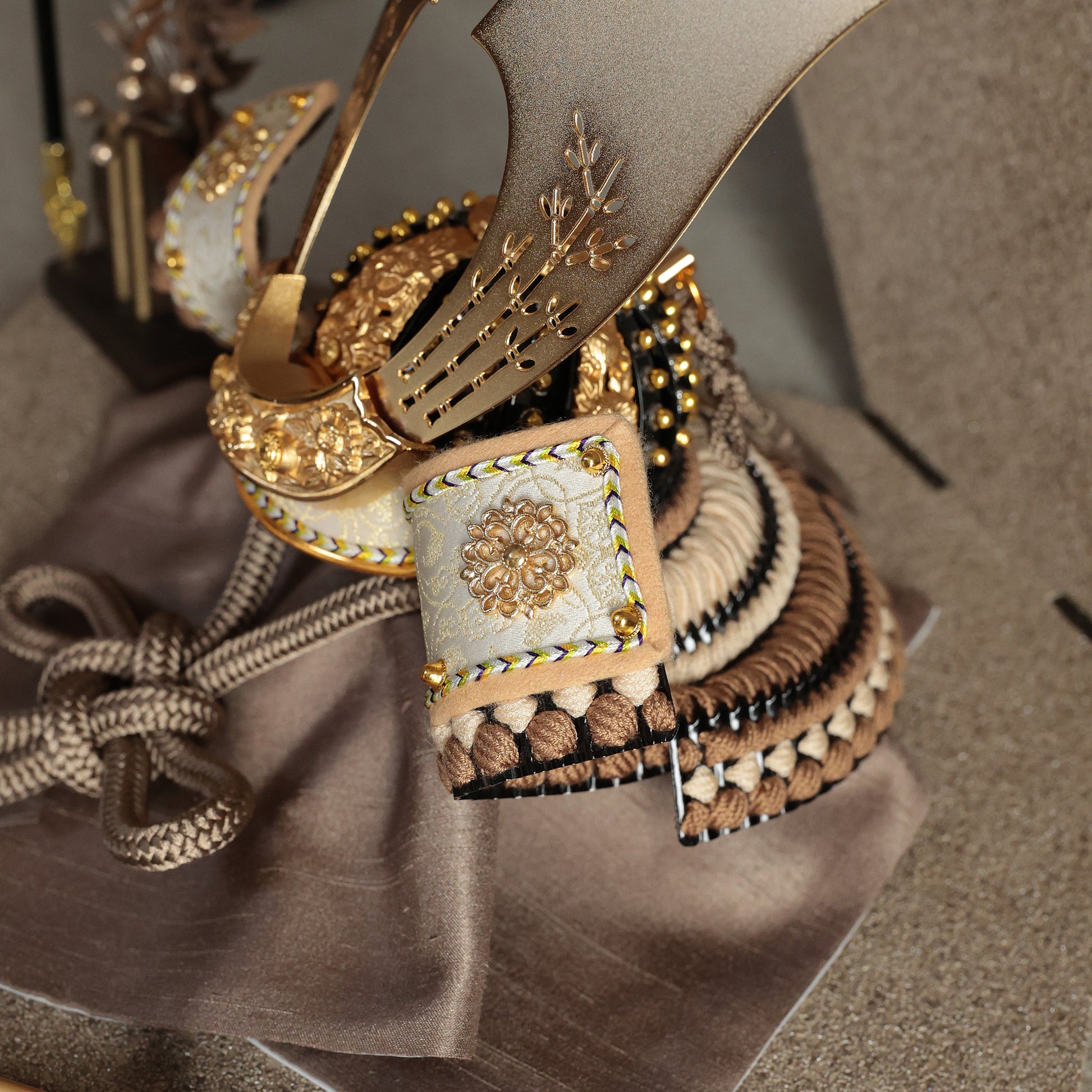 吹き返しには、生成りを基調とした繊細な織柄を合わせ、兜全体をやわらかく上品にまとめました。