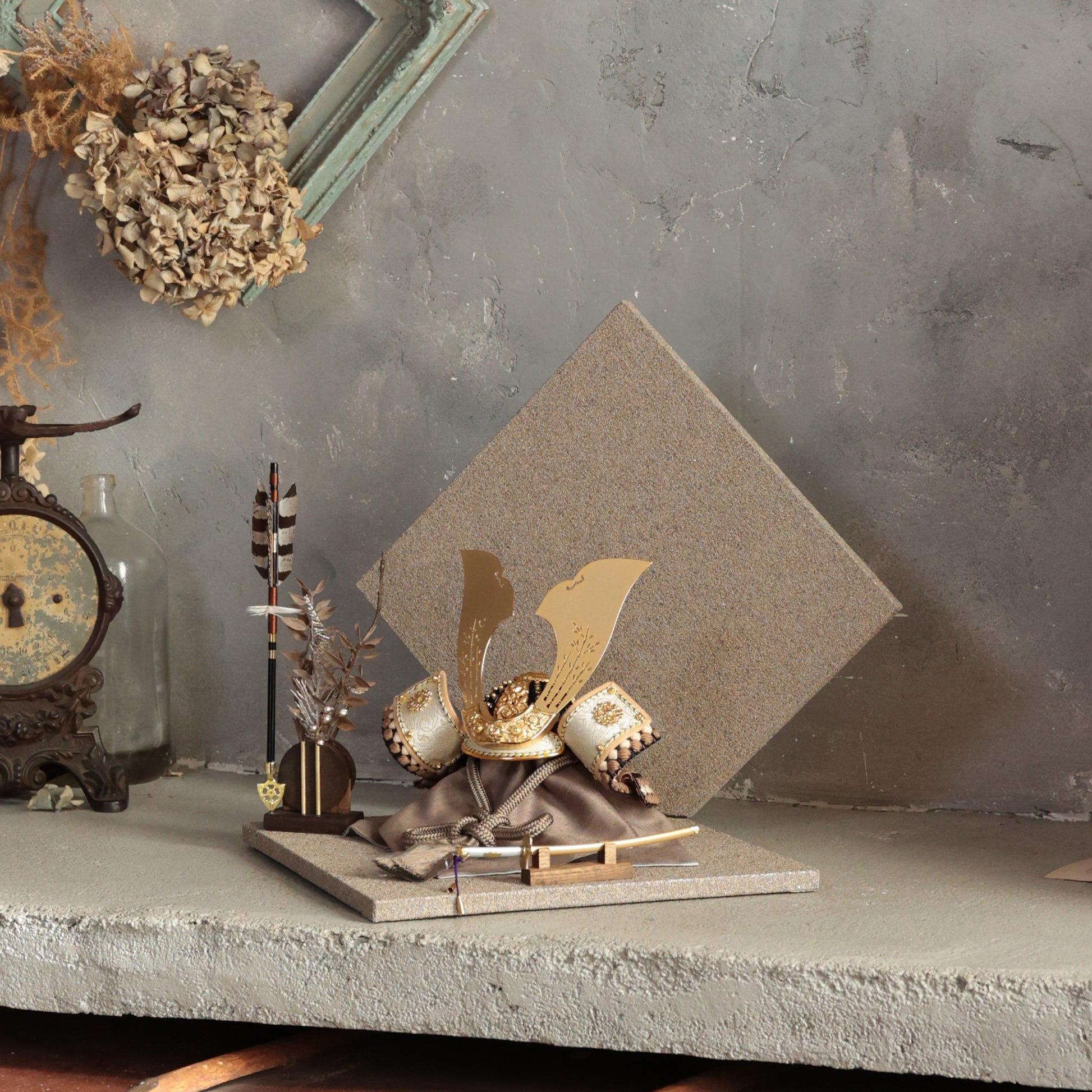 深い青緑の装いと金具の煌めきに寄り添い、上品で洗練された存在感を放つ鍬形です。
