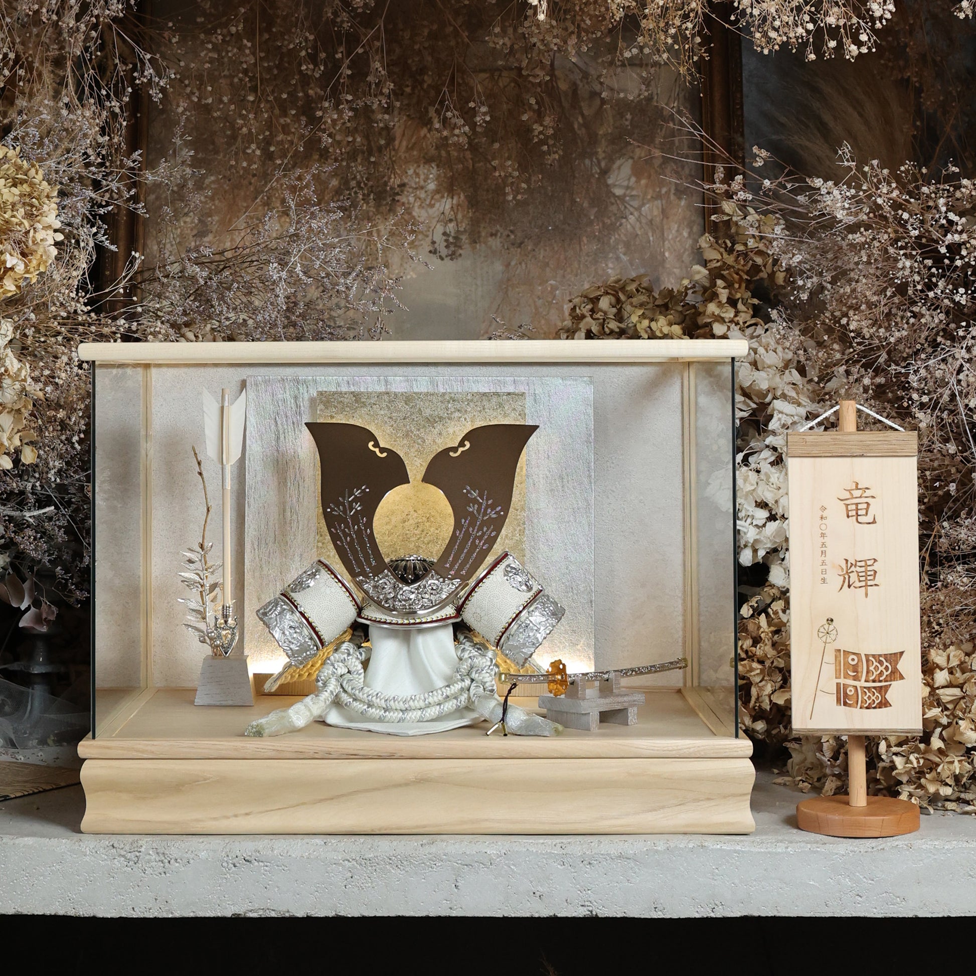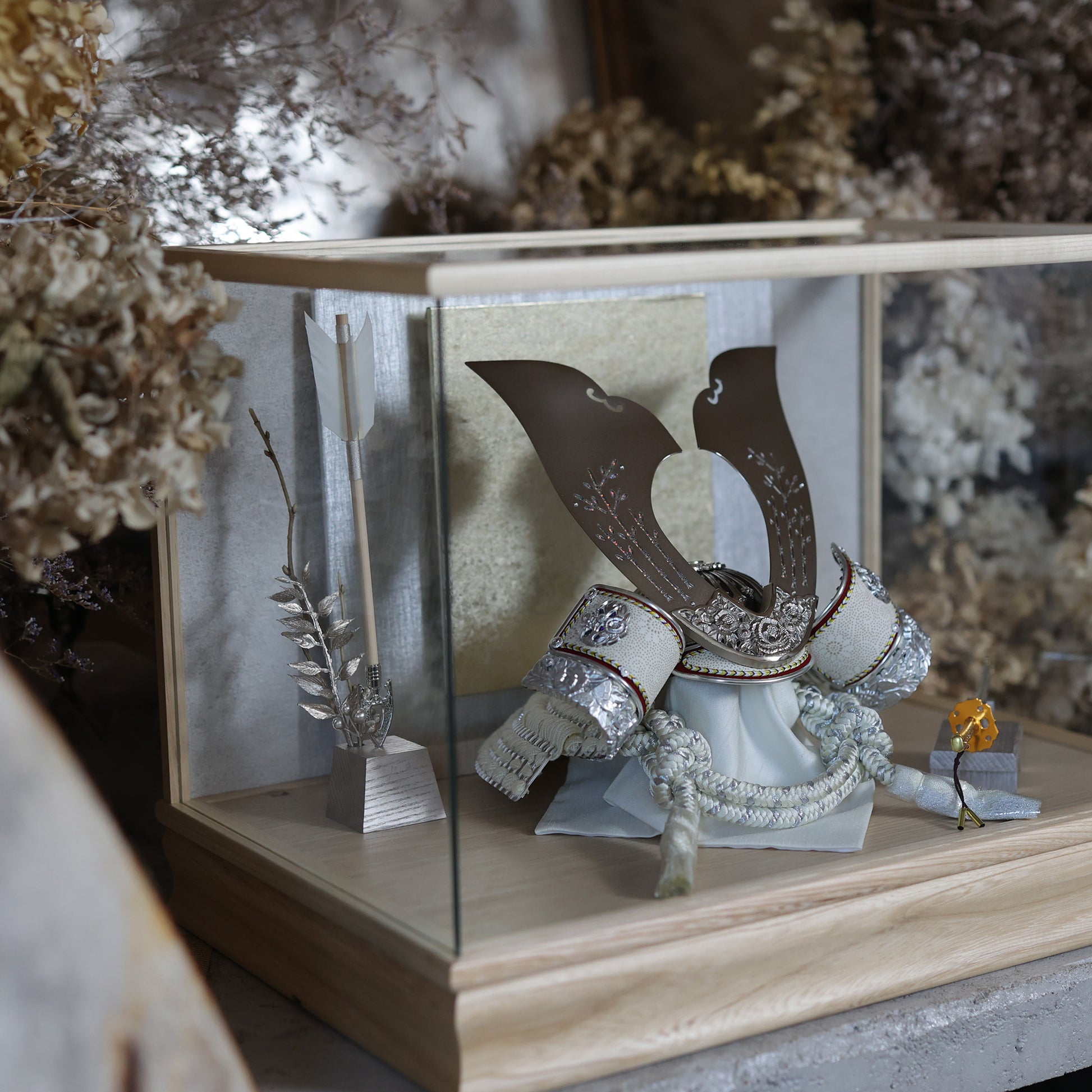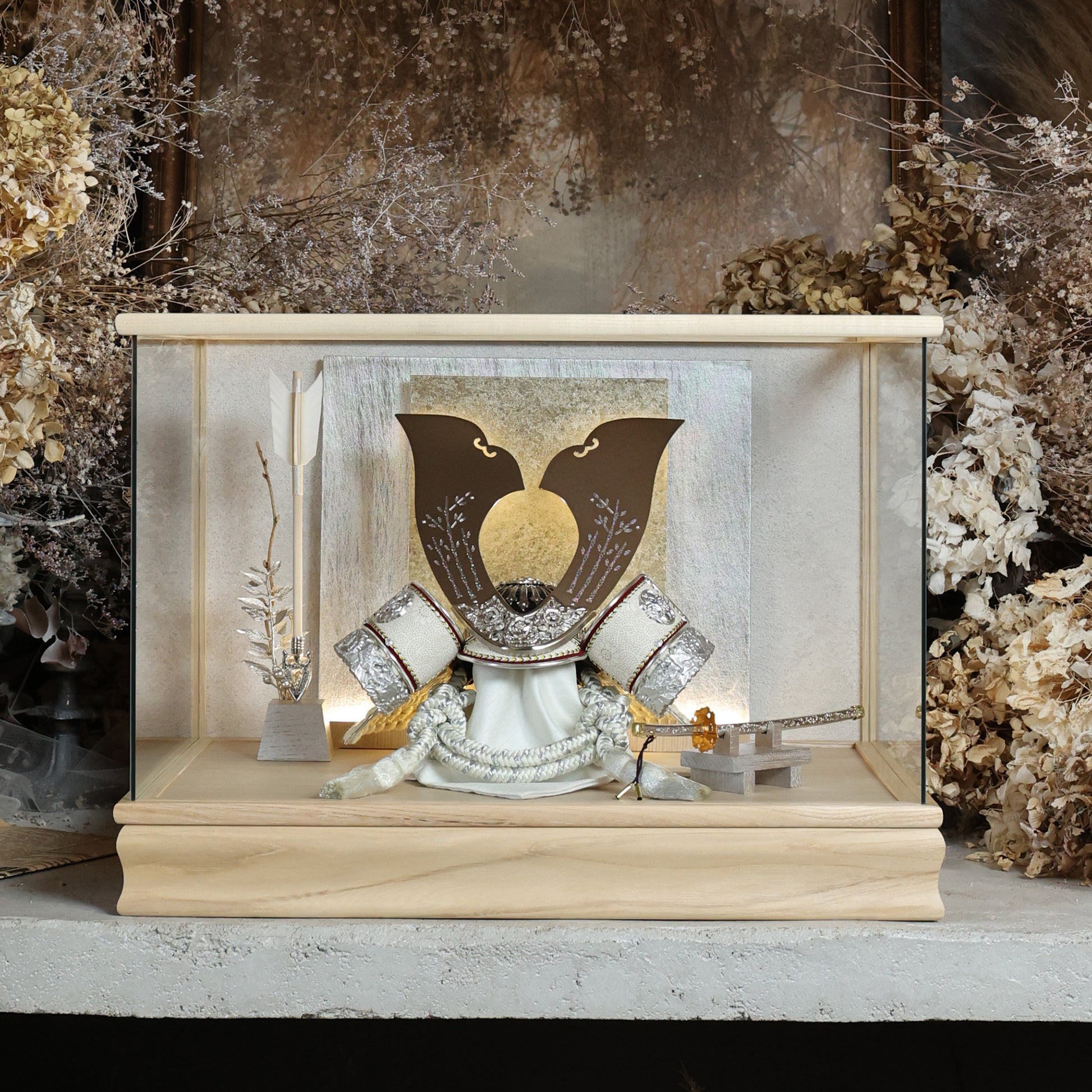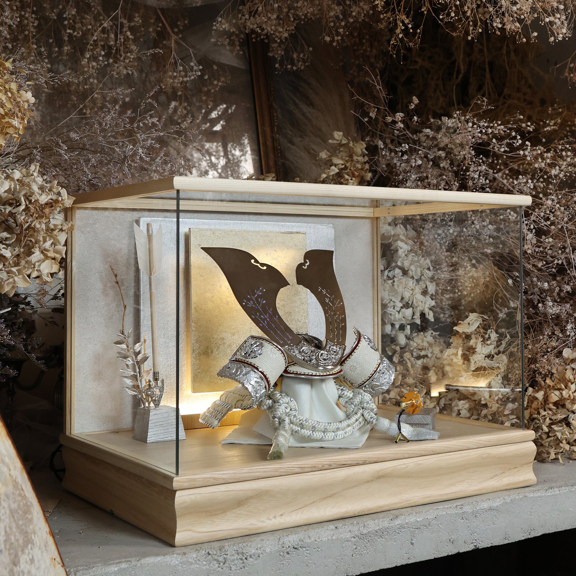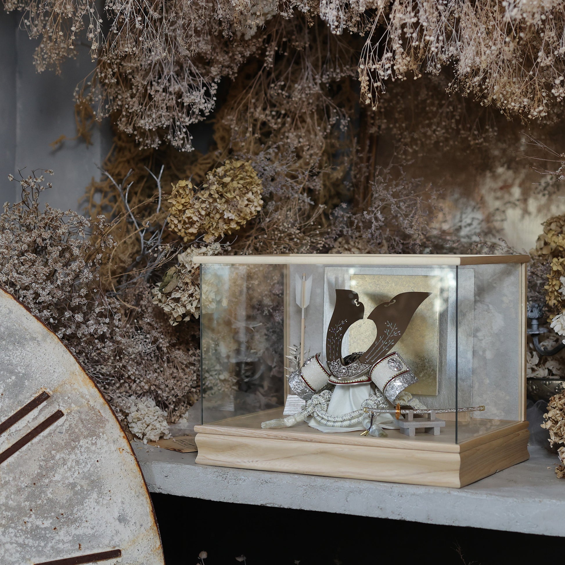 ケースの灯りとも美しく調和し、静けさの中に凛とした存在感を宿す鍬形です。