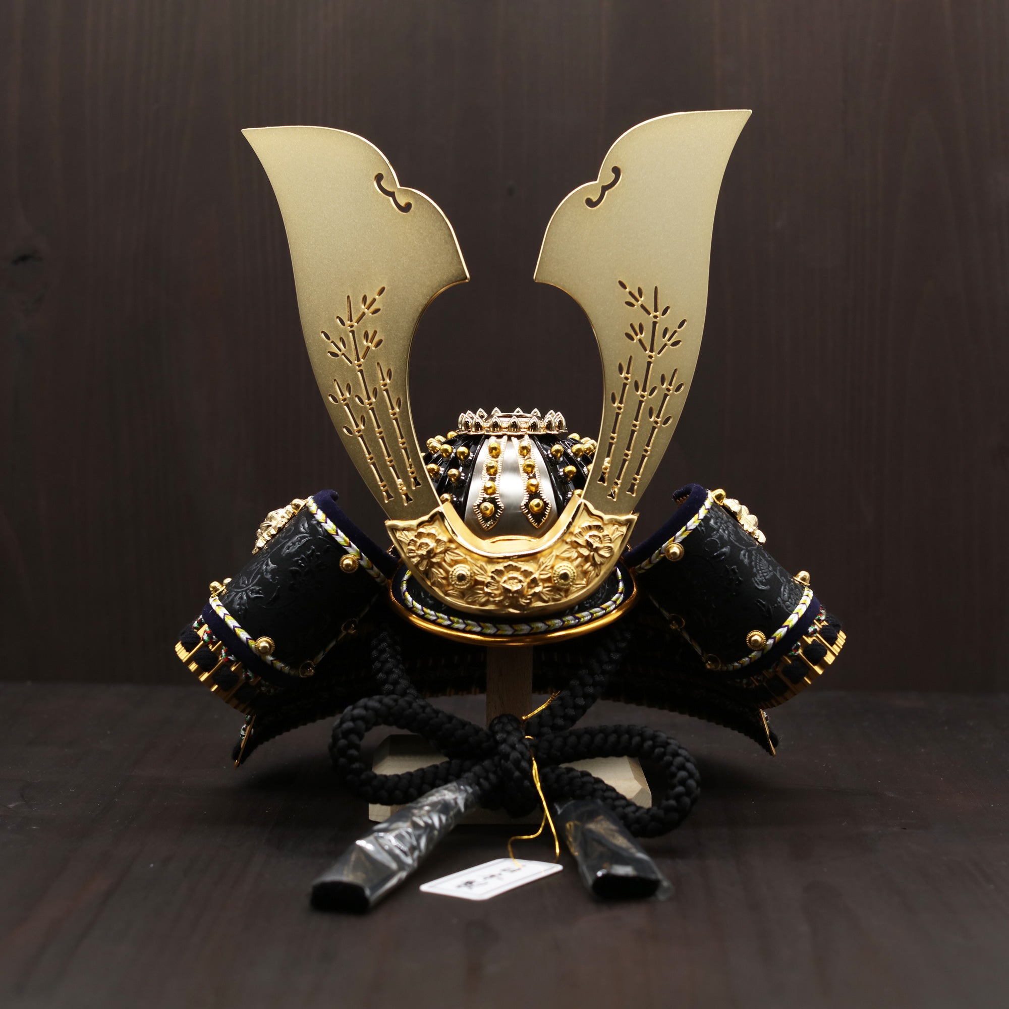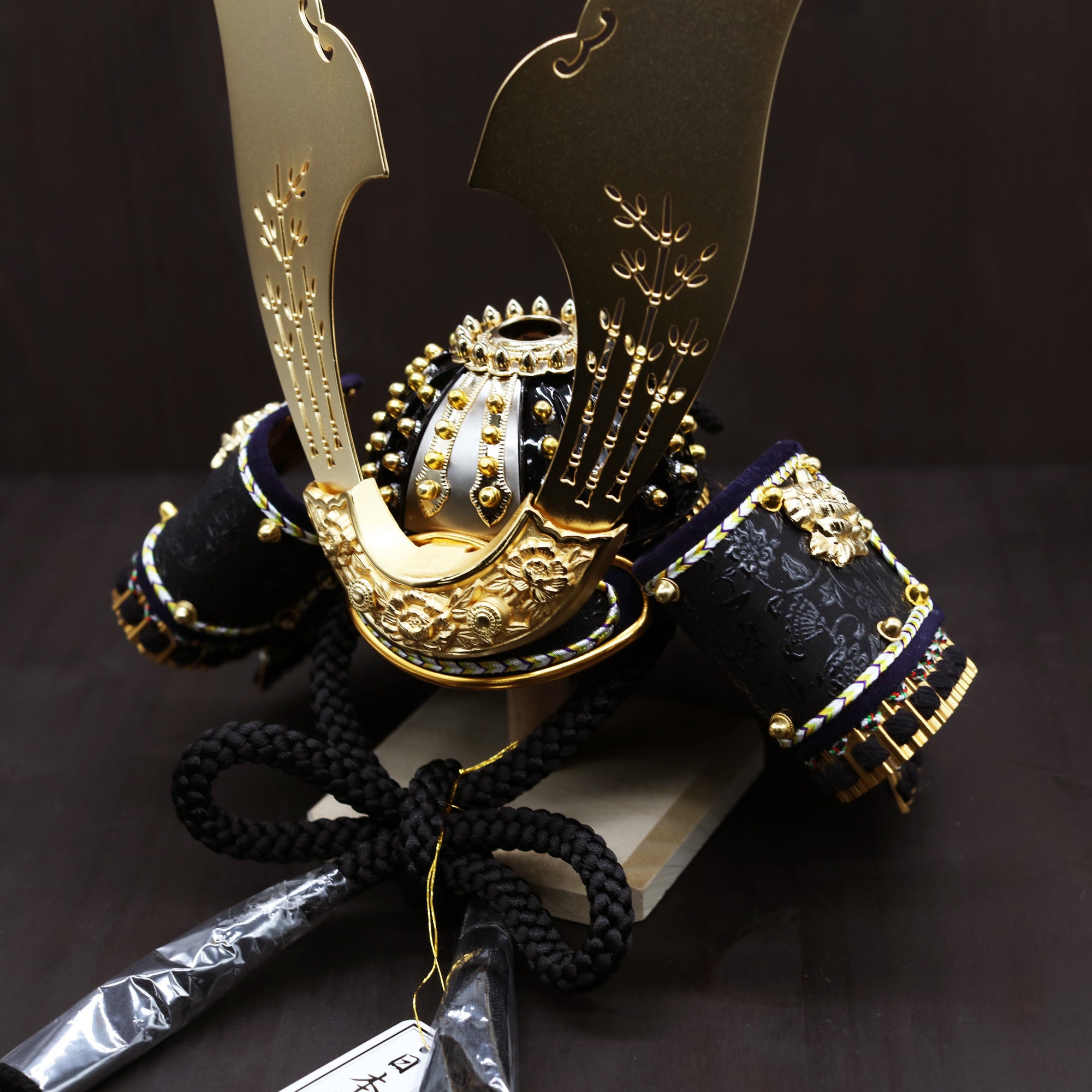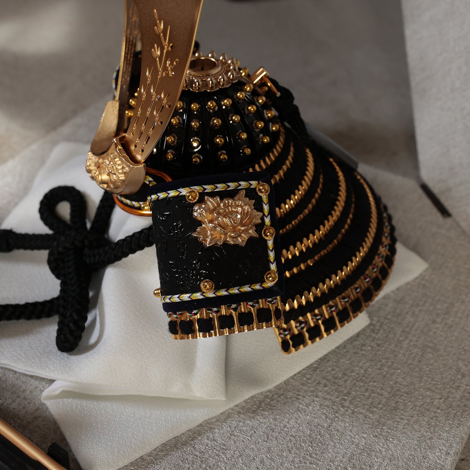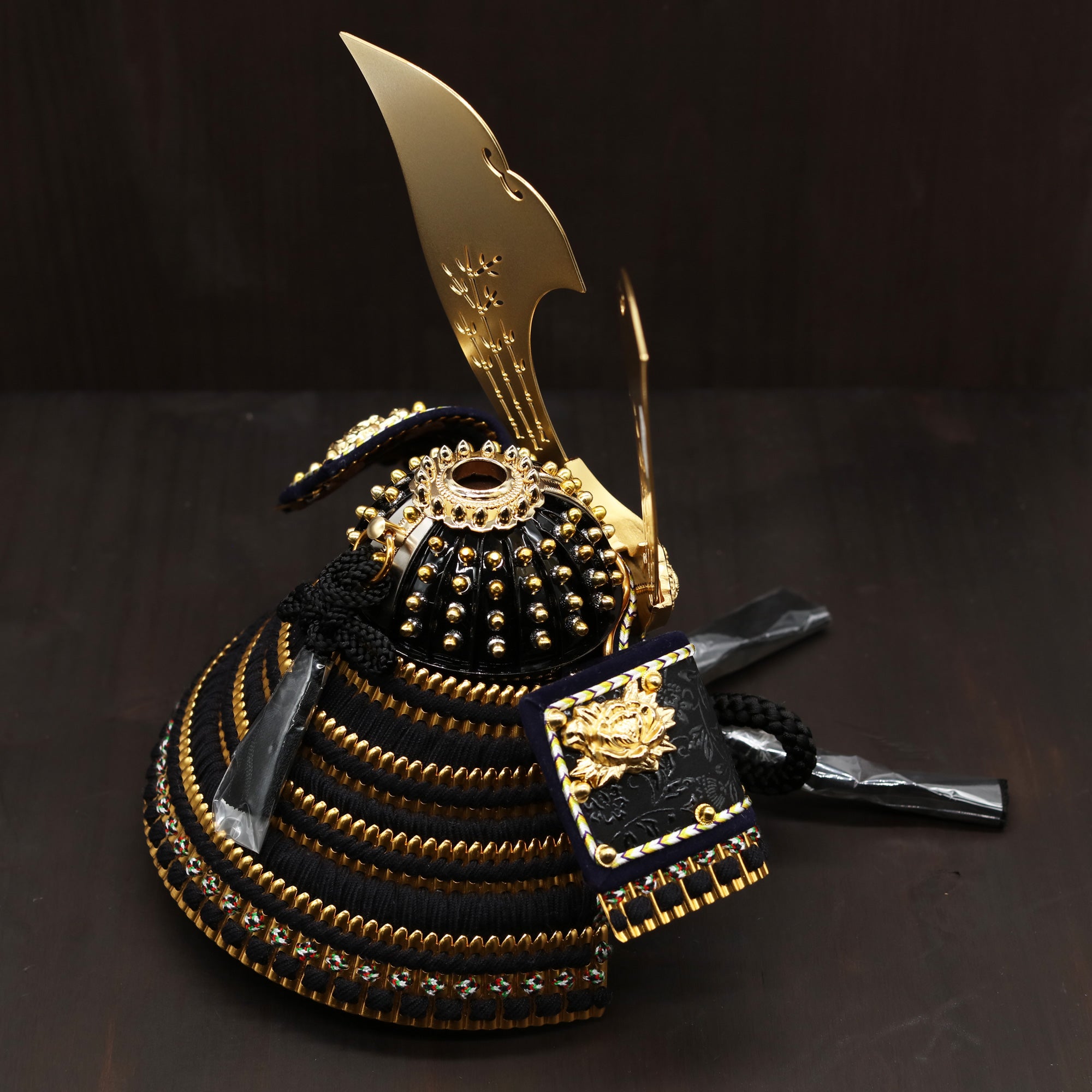 黒糸で威した兜の後ろ姿は、重厚で引き締まった印象を与えます。首元を守る錣(しころ)部分には、黒糸が丁寧に通され、小札(こざね)を結び合わせています。この精緻な作りにより、武士の威厳と気品が際立ちます。
