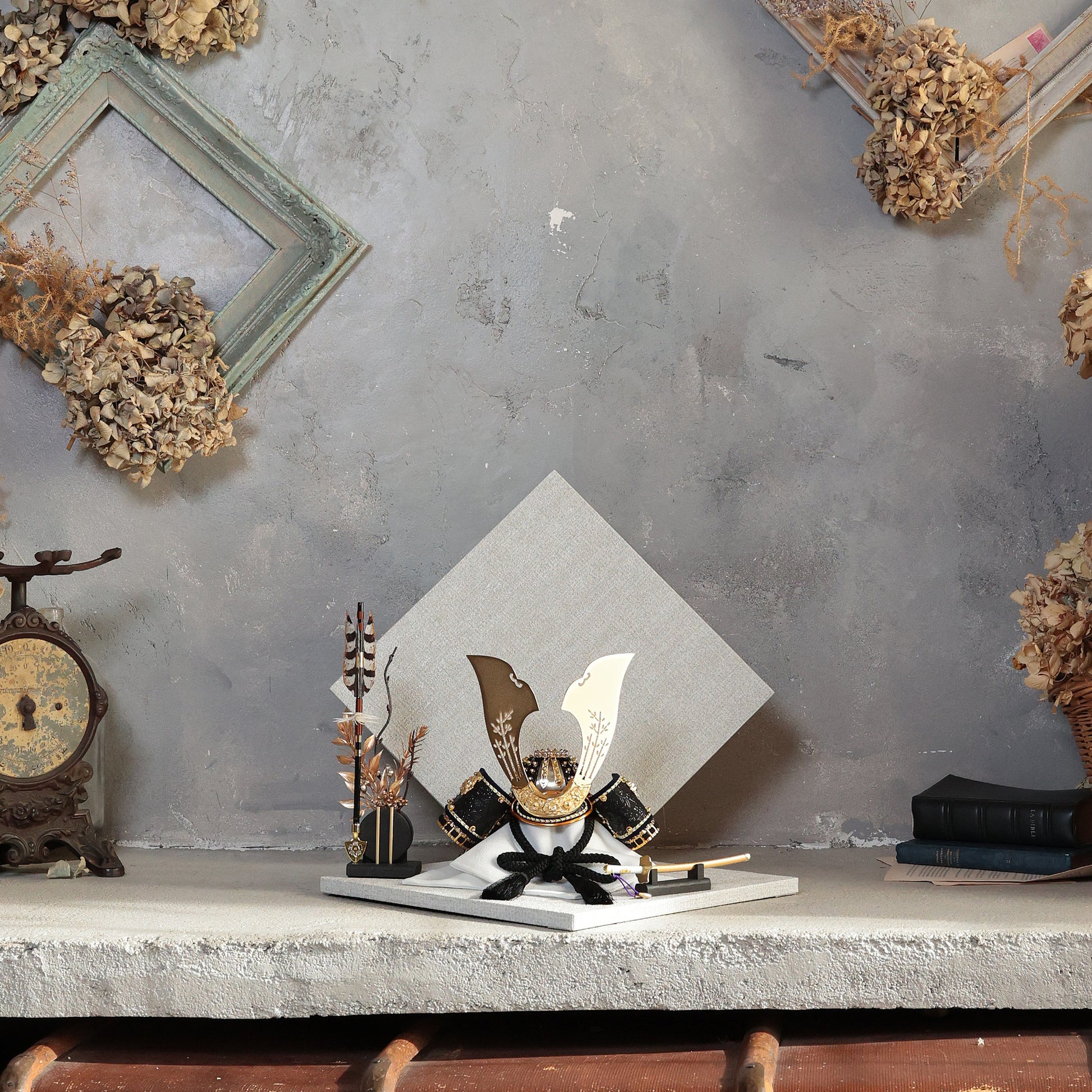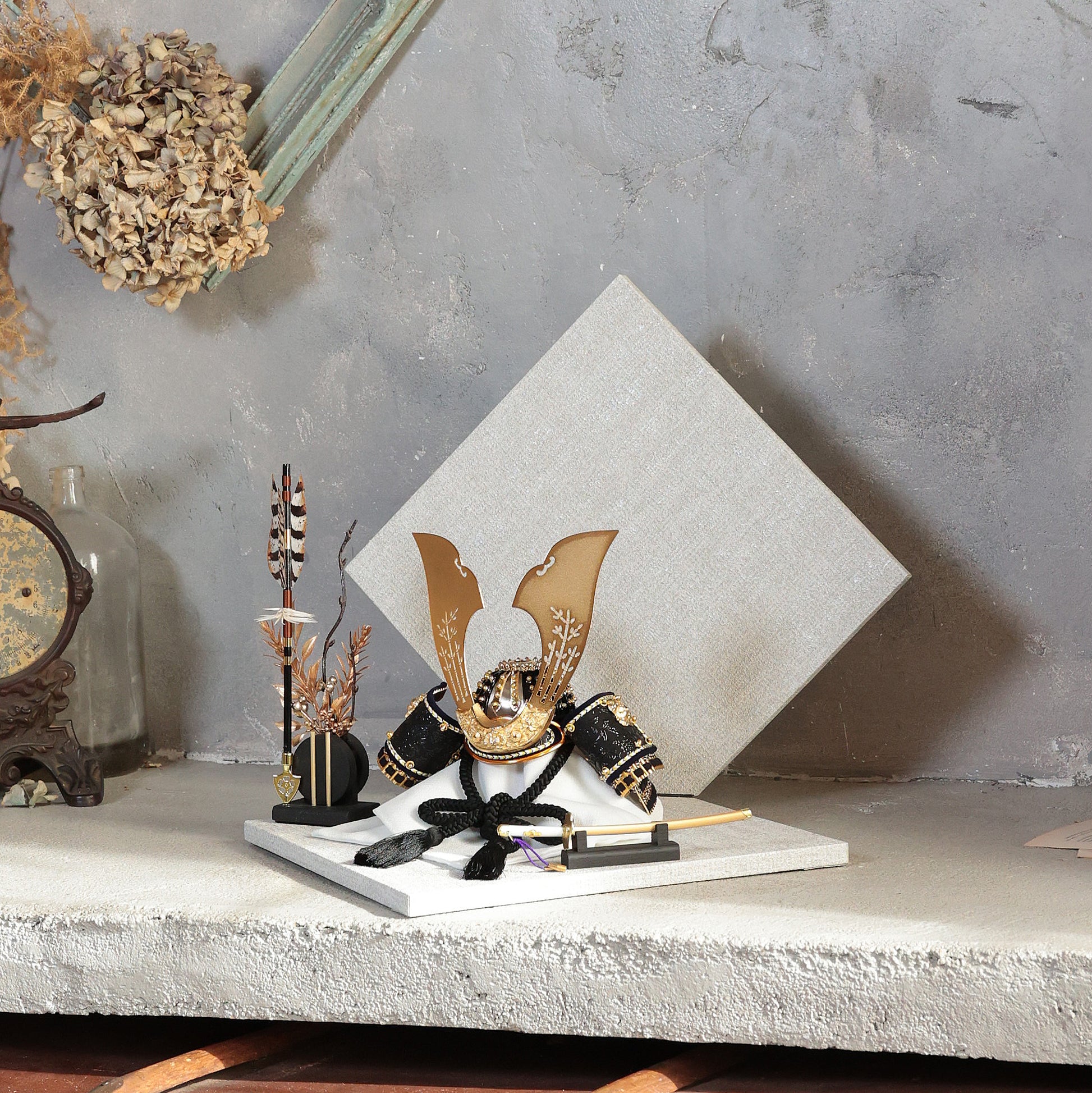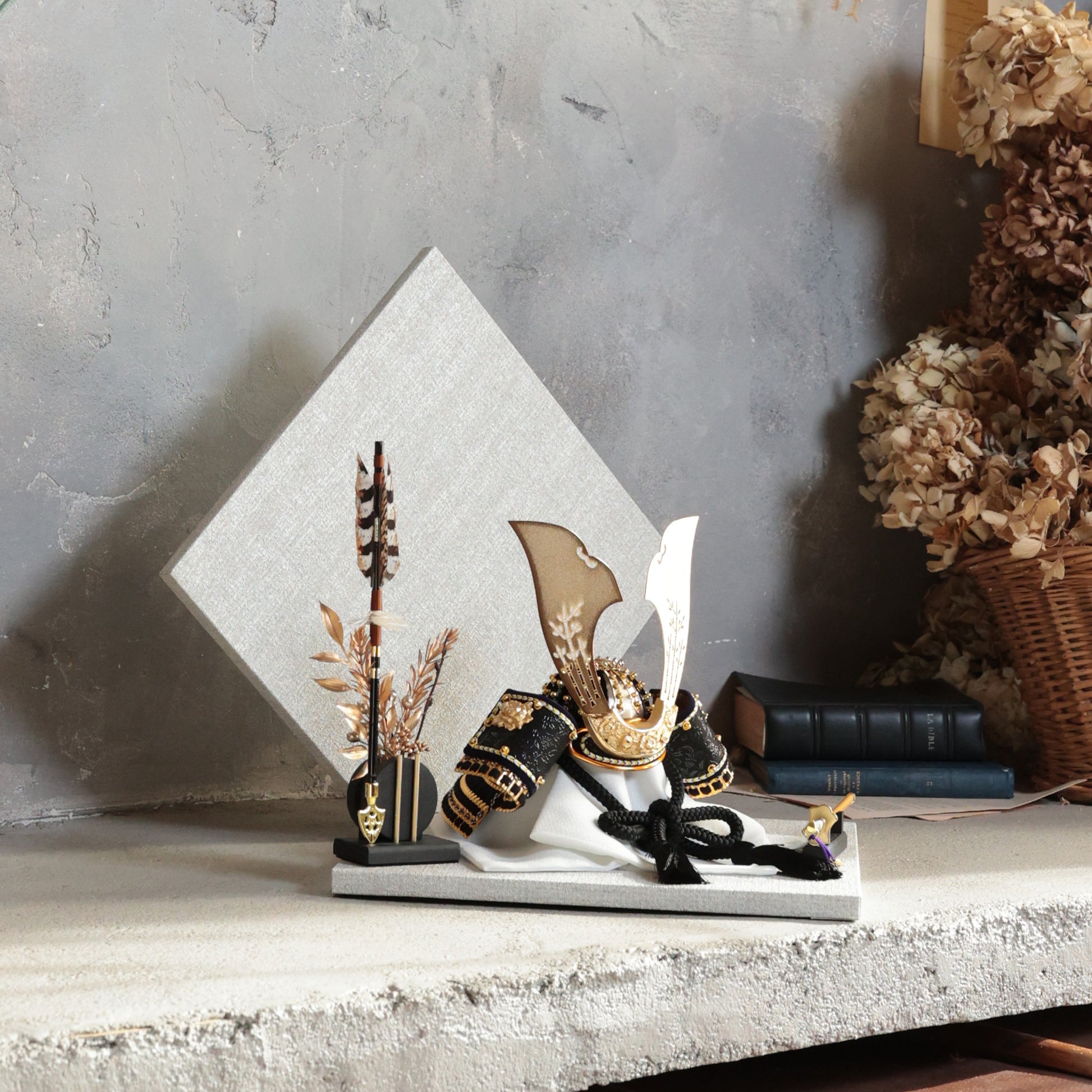 深い青緑の装いと金具の煌めきに寄り添い、上品で洗練された存在感を放つ鍬形です。