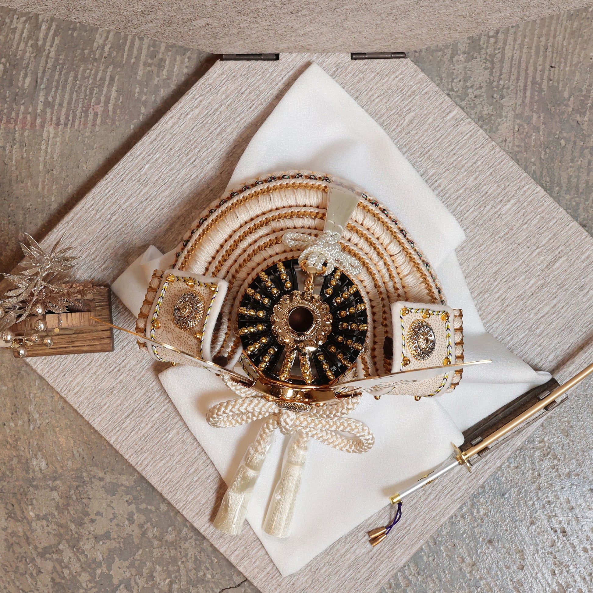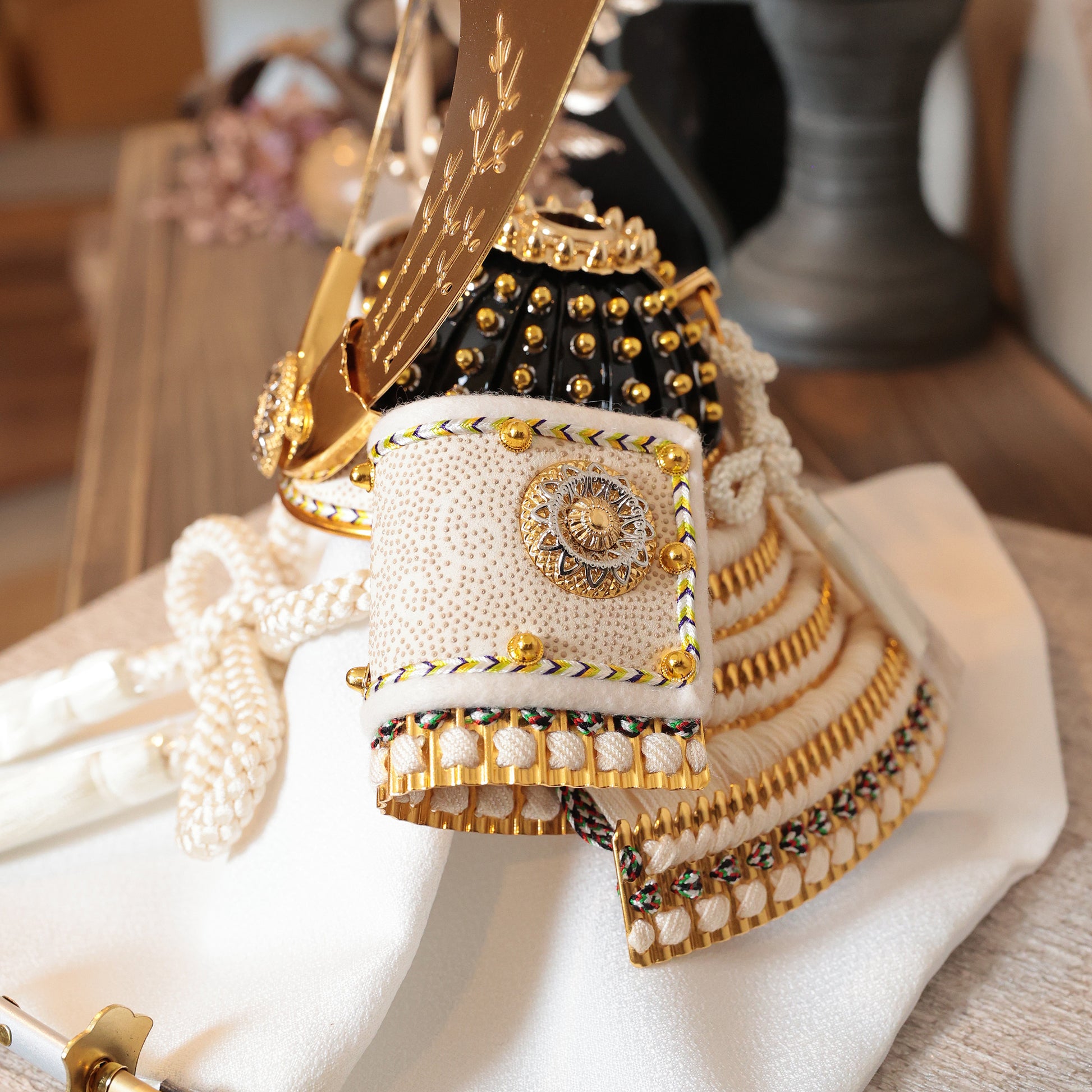 白色の威糸で仕上げた兜の後ろ姿は、品のある美しさが特徴です。白糸が整然と並んだ垂れ部分は、全体に清潔感と高貴な印象を与えます。また、他の素材や色との調和が美しく、シンプルながらも伝統美を感じさせる仕上がりになっています。