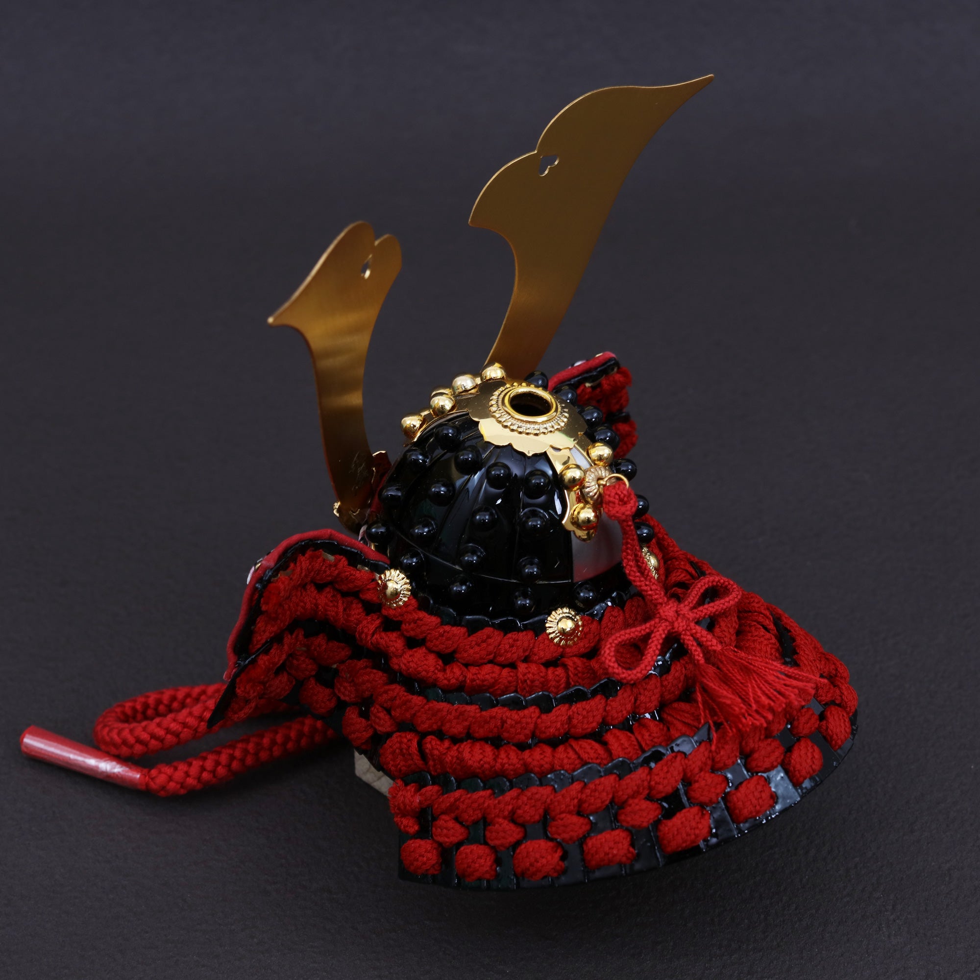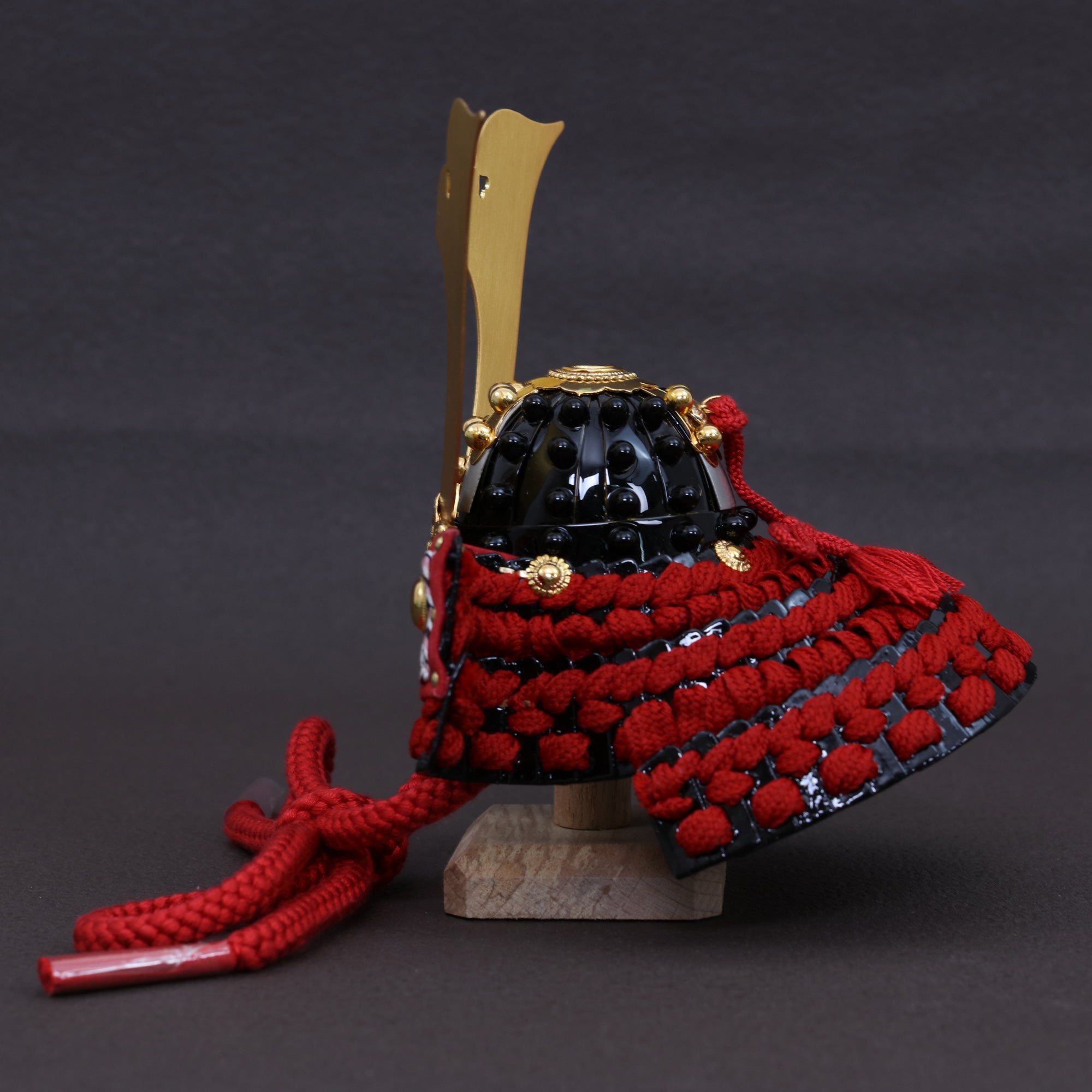 黒小札に深紅の威しを重ね、しころに凛とした品格と奥行きを与えました。