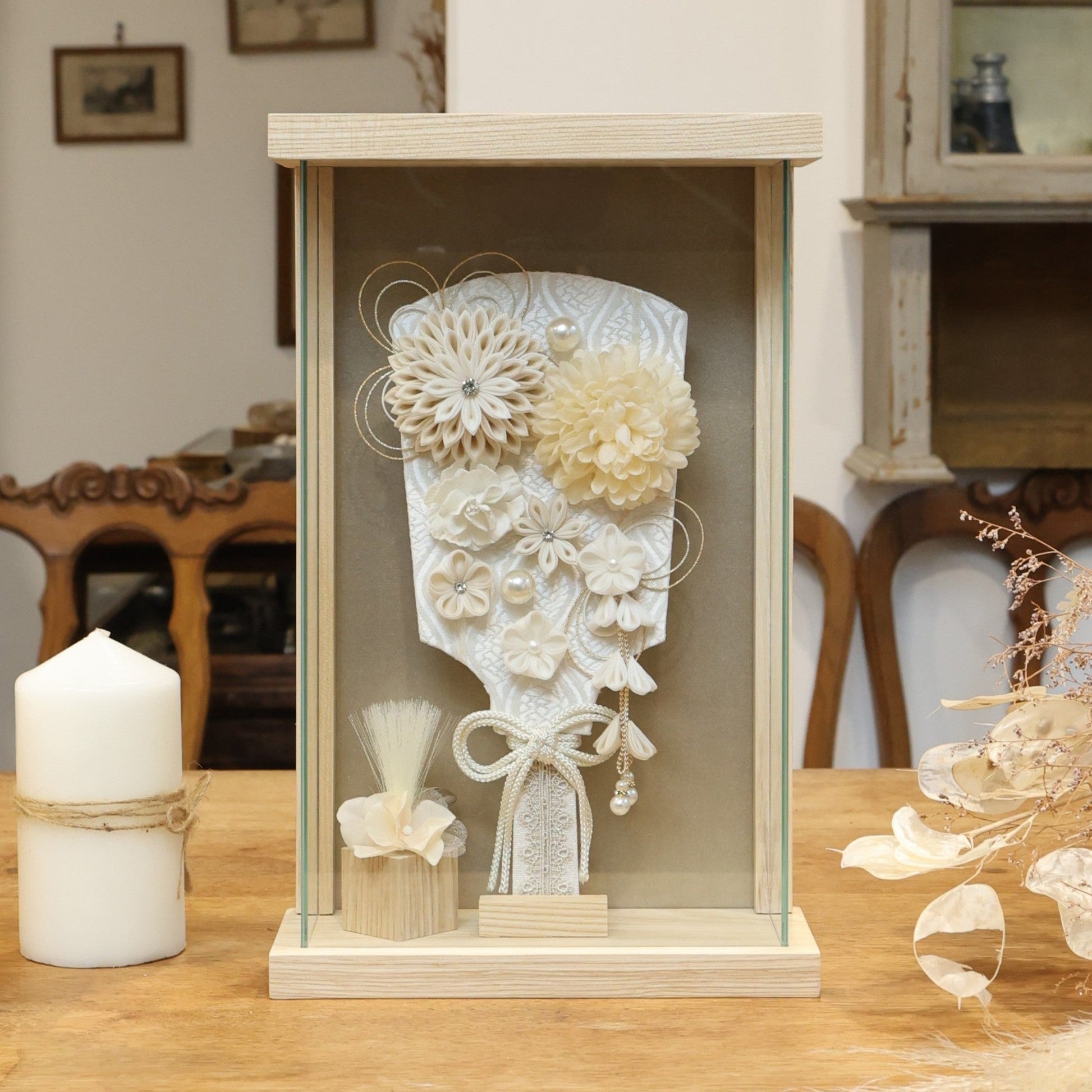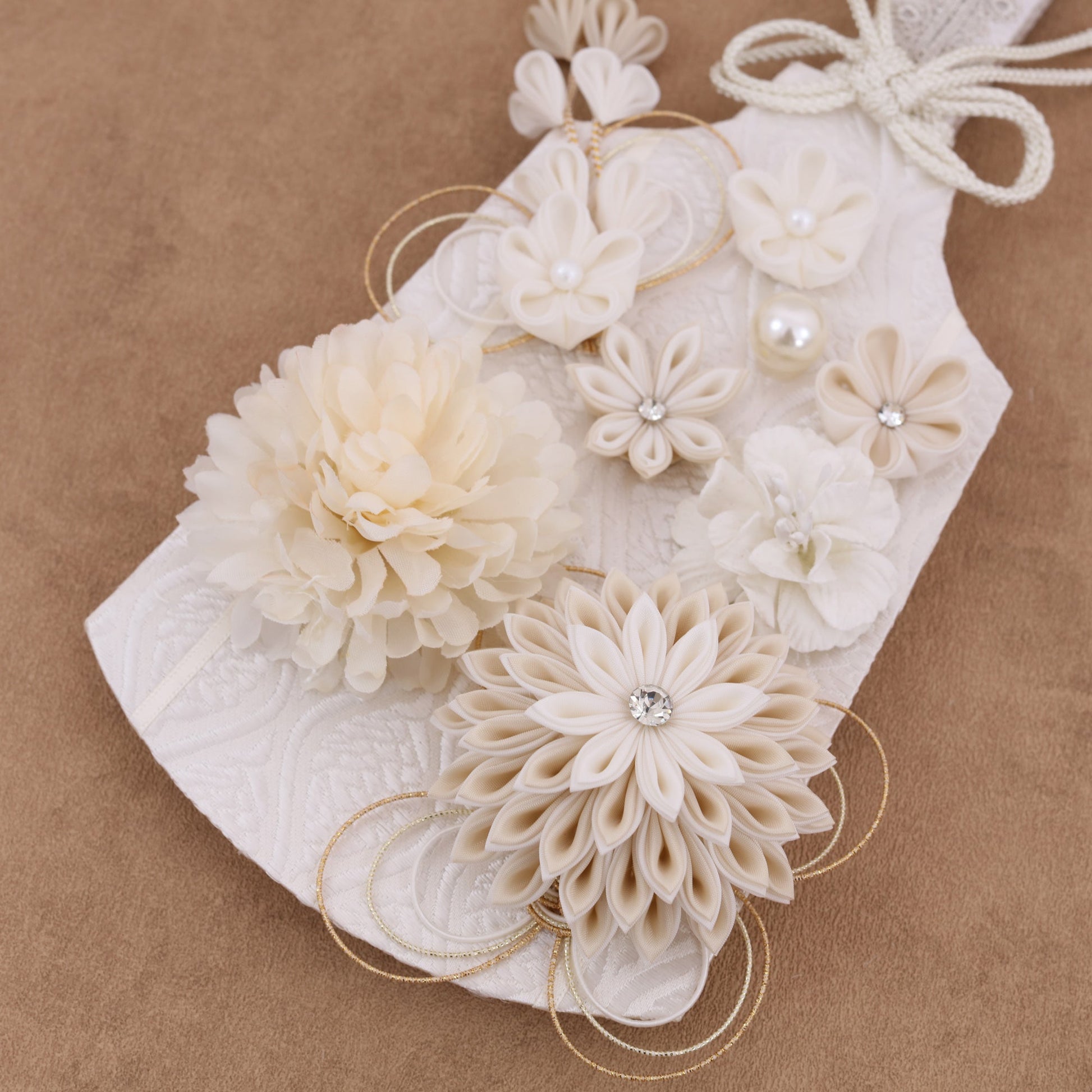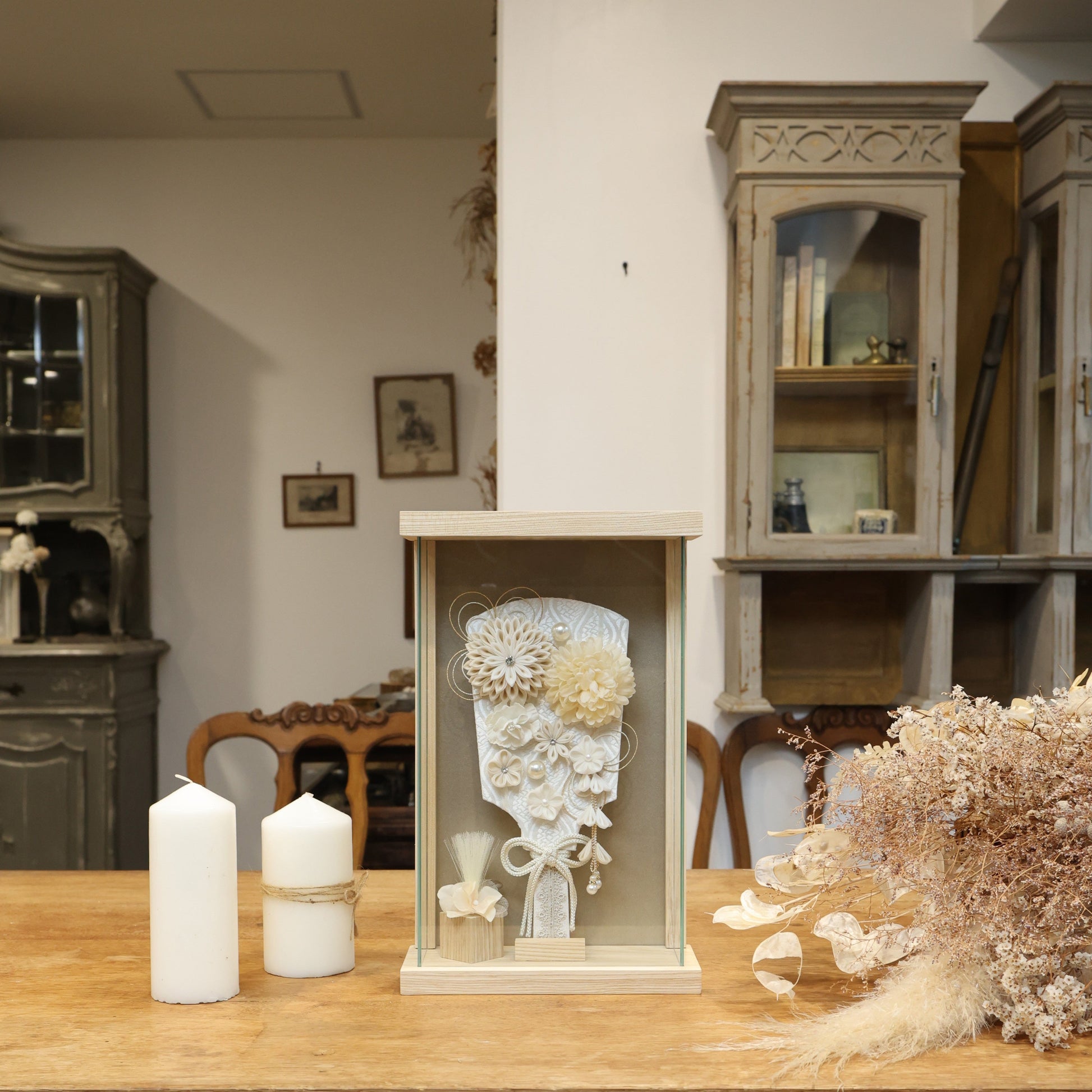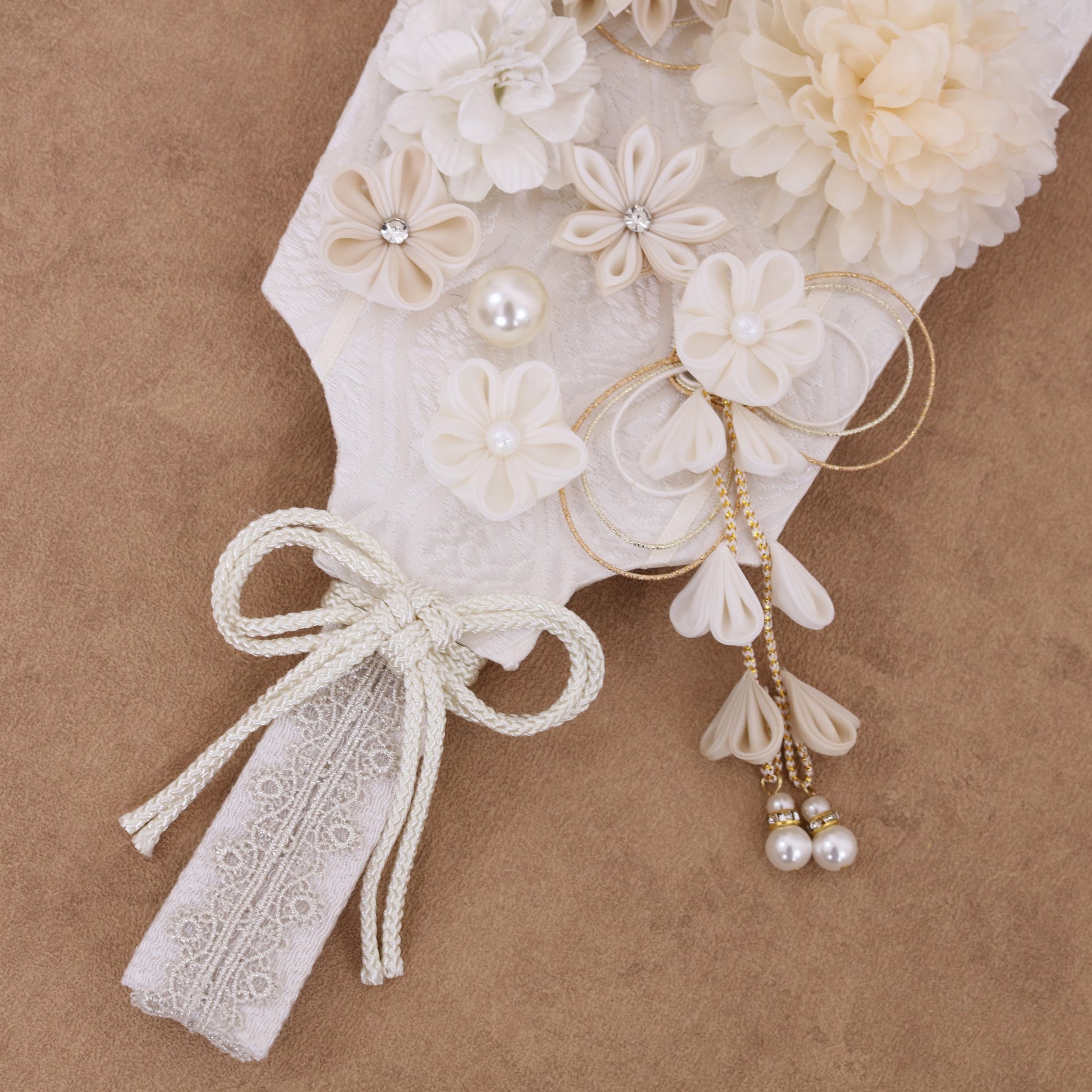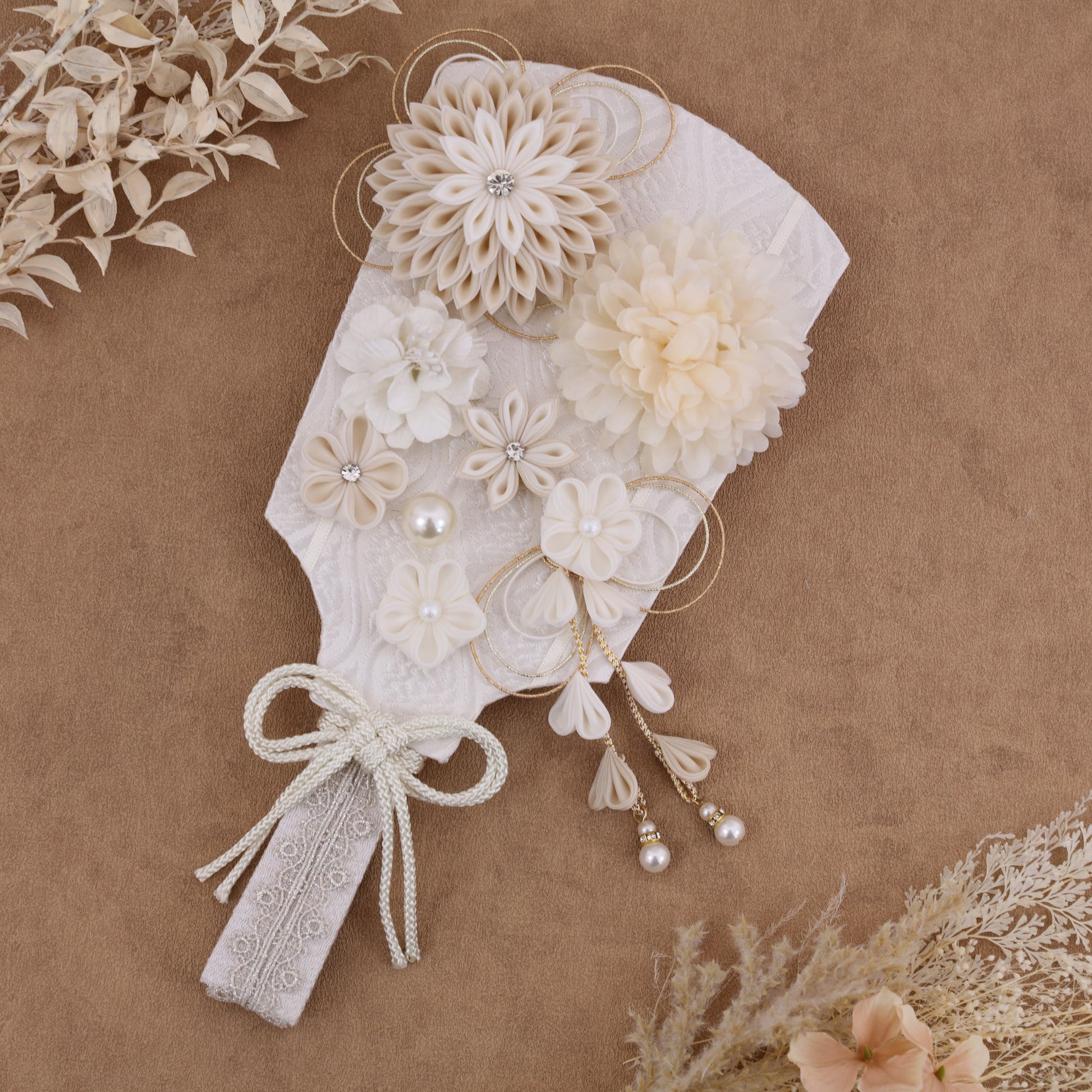 この羽子板は、新しい命の誕生を祝う特別な意味を込めてデザインされました。使用した花飾りにはホワイトのダリアとベージュのマムを選びました。ホワイトのダリアは純粋さや無垢を象徴し、生まれたばかりの赤ちゃんの純真さを表現しています。一方、ベージュのマムは、日本では長寿や幸福の象徴であり、赤ちゃんが健康で幸せに成長することを願っています。