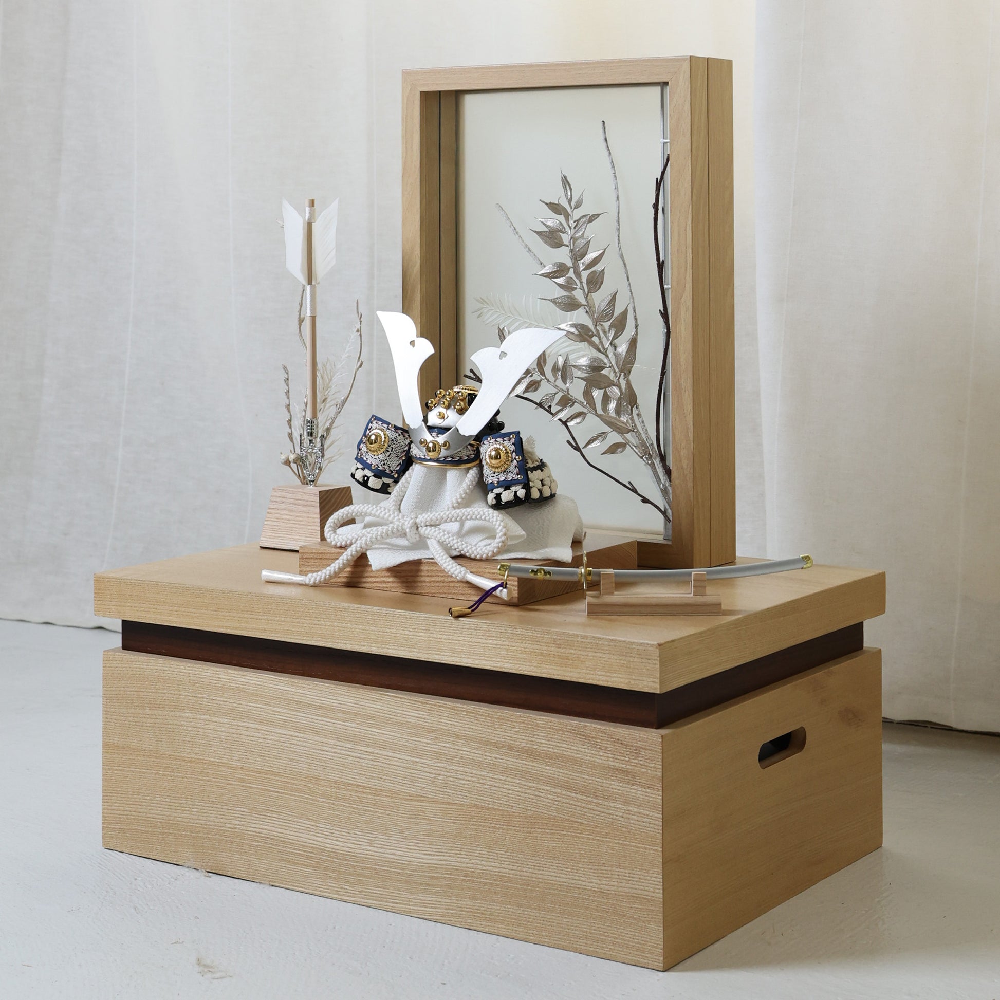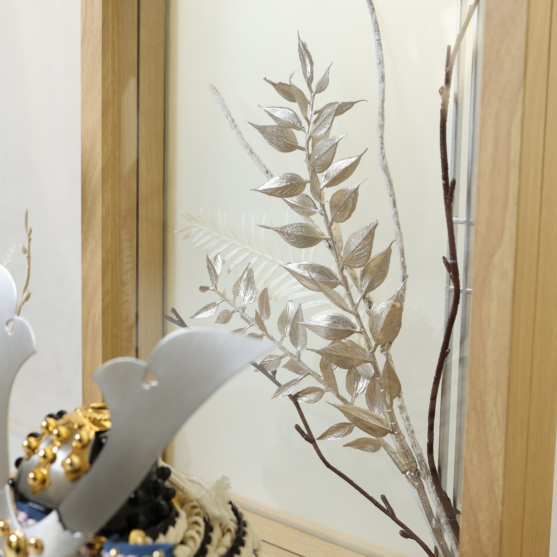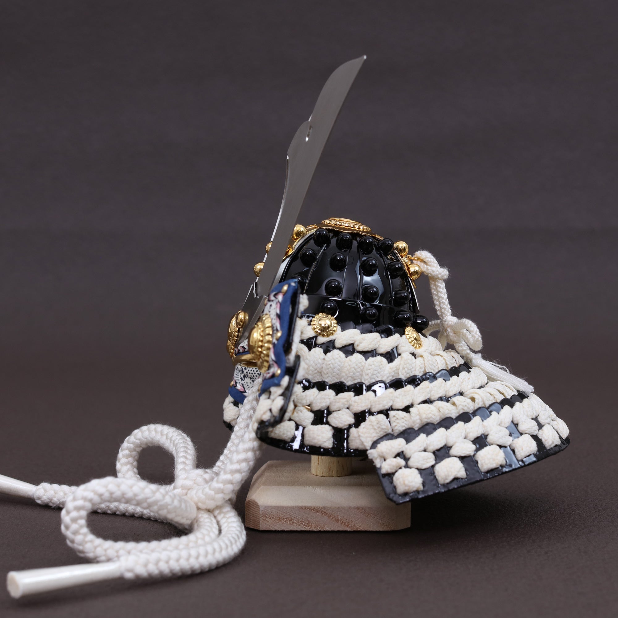 白色の威糸で仕上げた兜の後ろ姿は、品のある美しさが特徴です。白糸が整然と並んだ垂れ部分は、全体に清潔感と高貴な印象を与えます。また、他の素材や色との調和が美しくシンプルながらも伝統美を感じさせる仕上がりになっています。