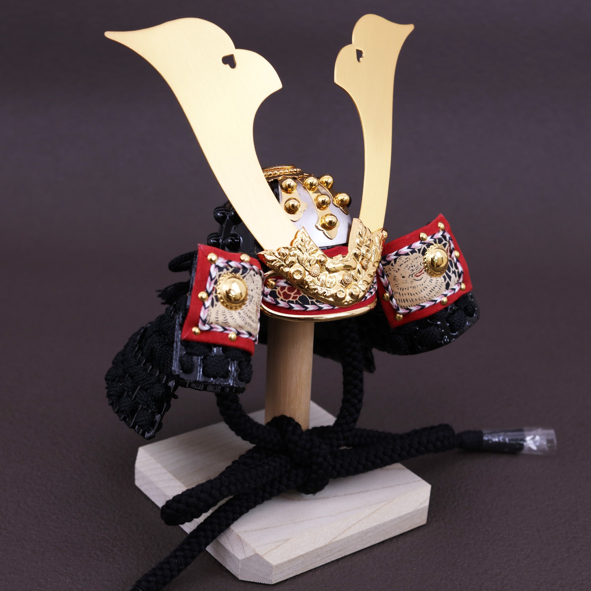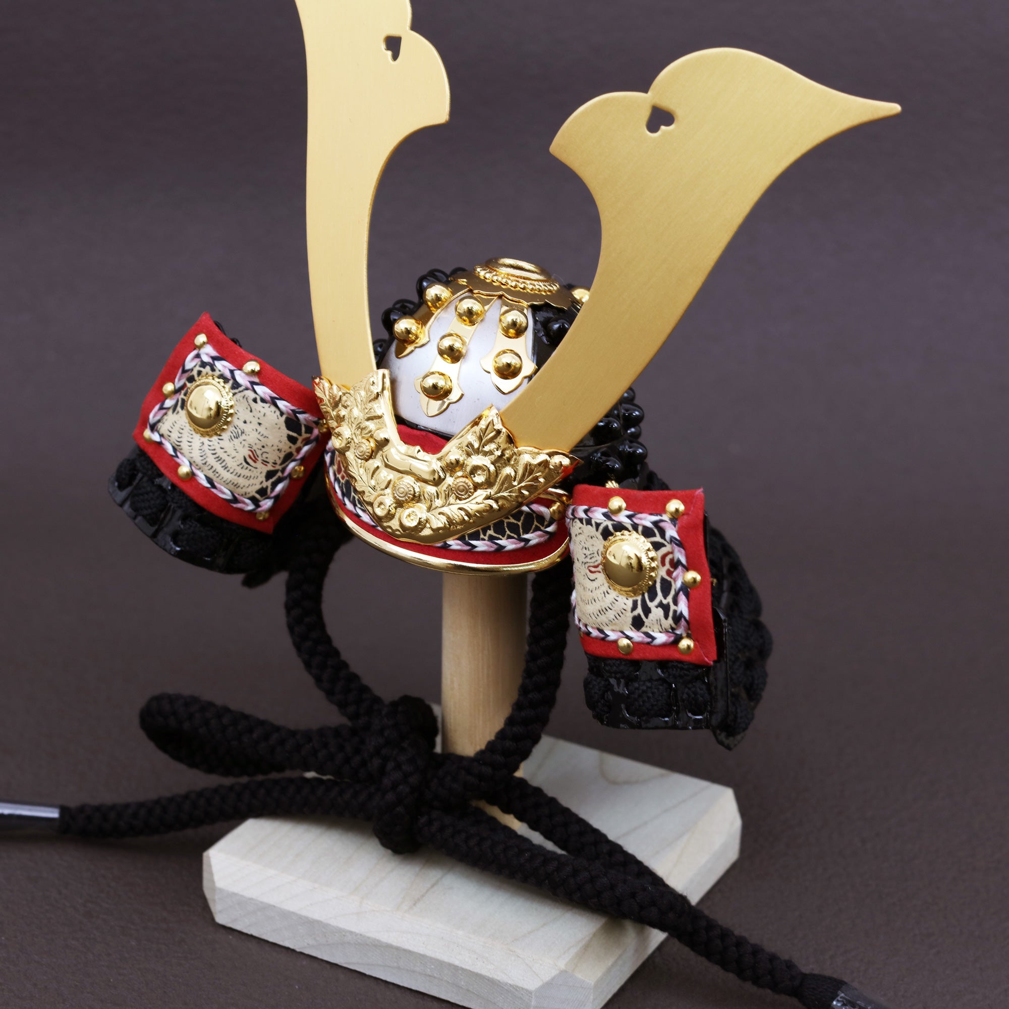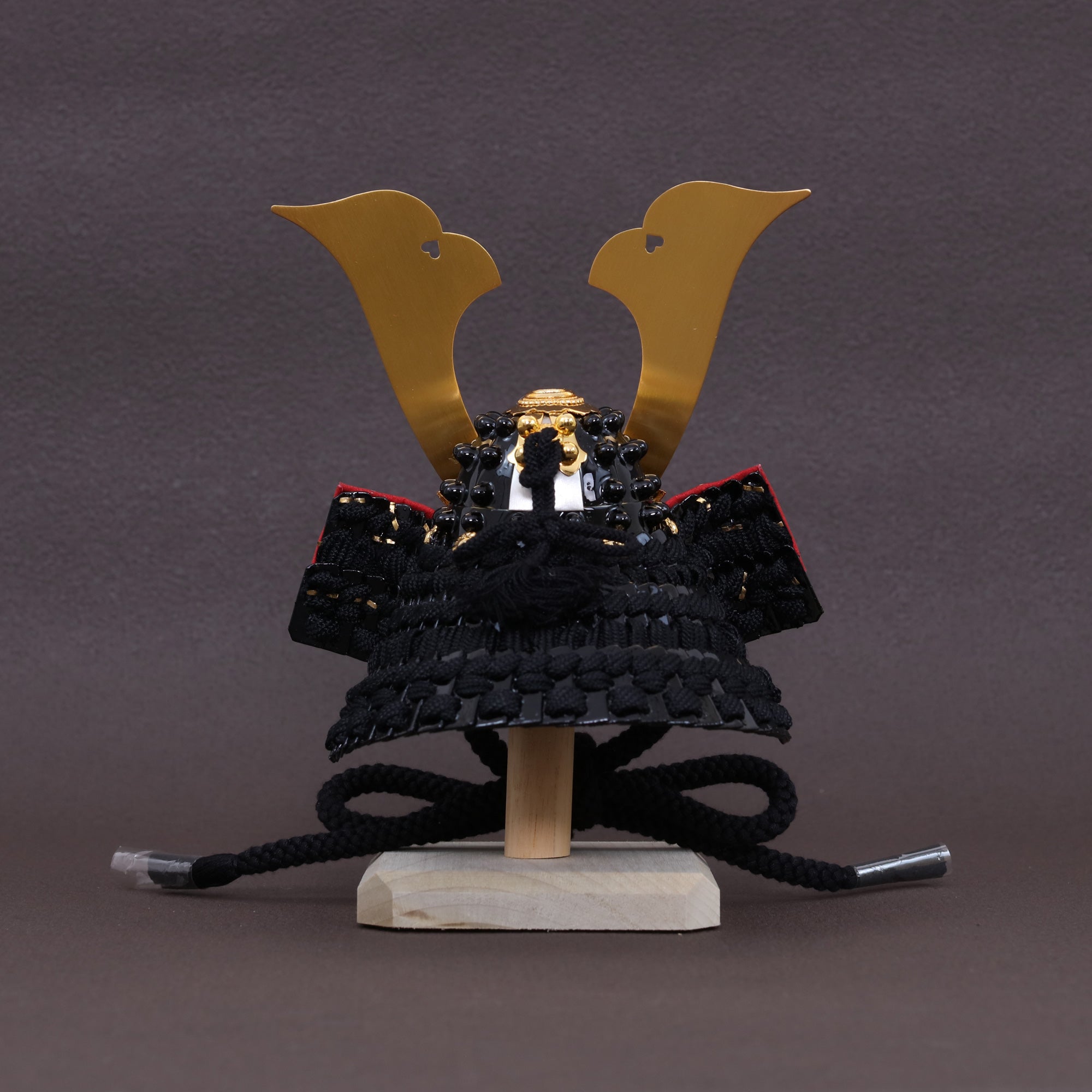 堂々とした幅を持つ大鍬形を、落ち着いた金色で仕立てました。