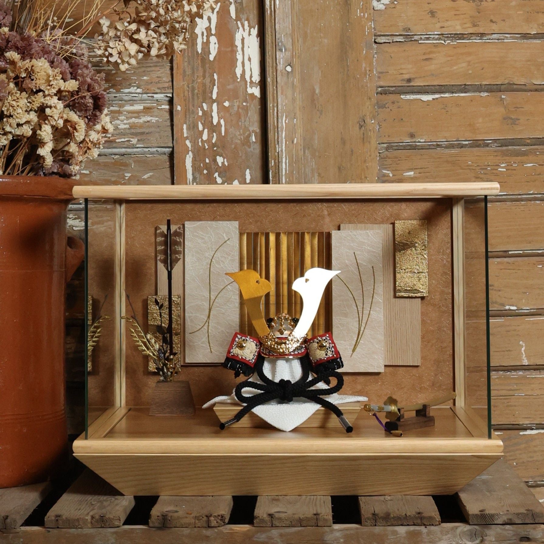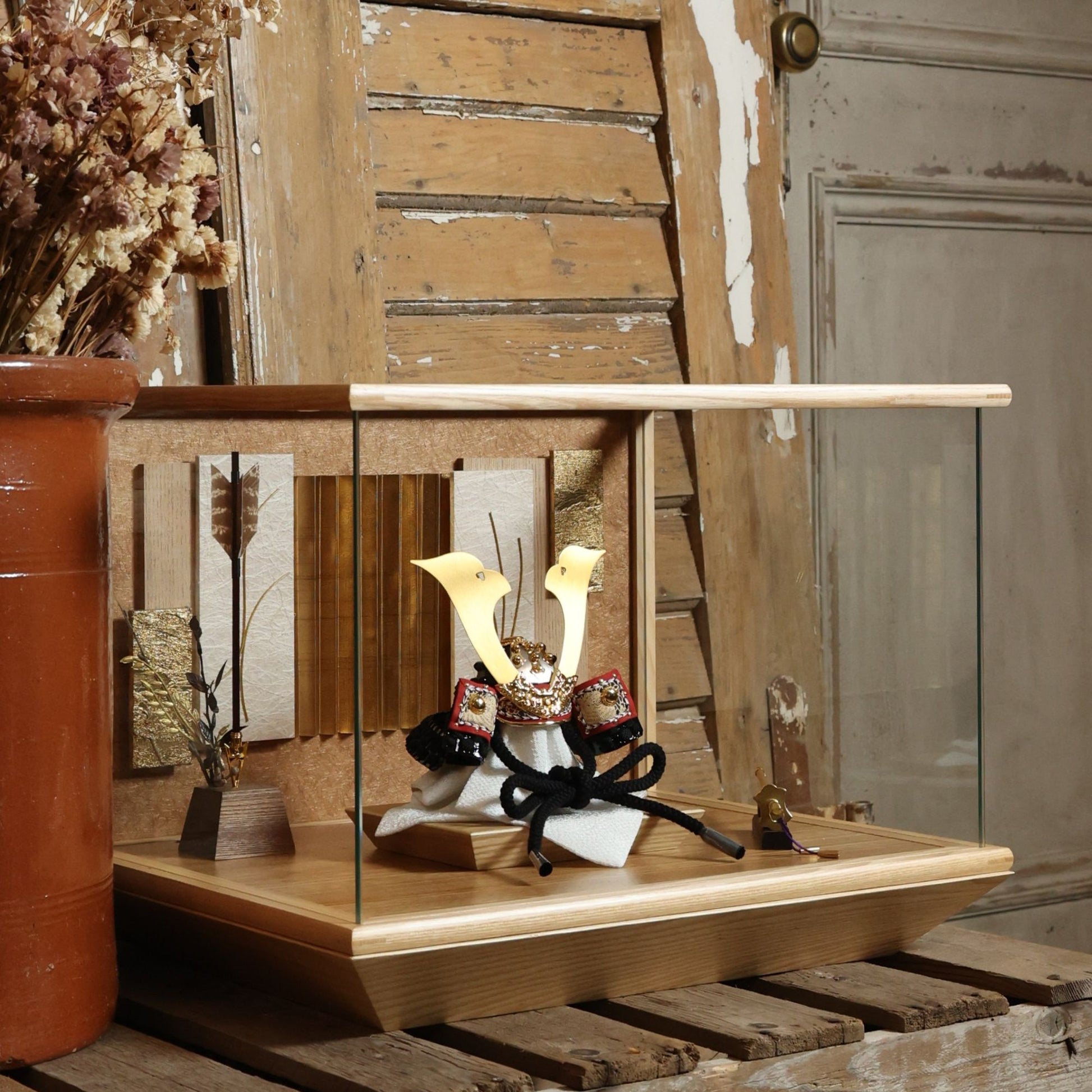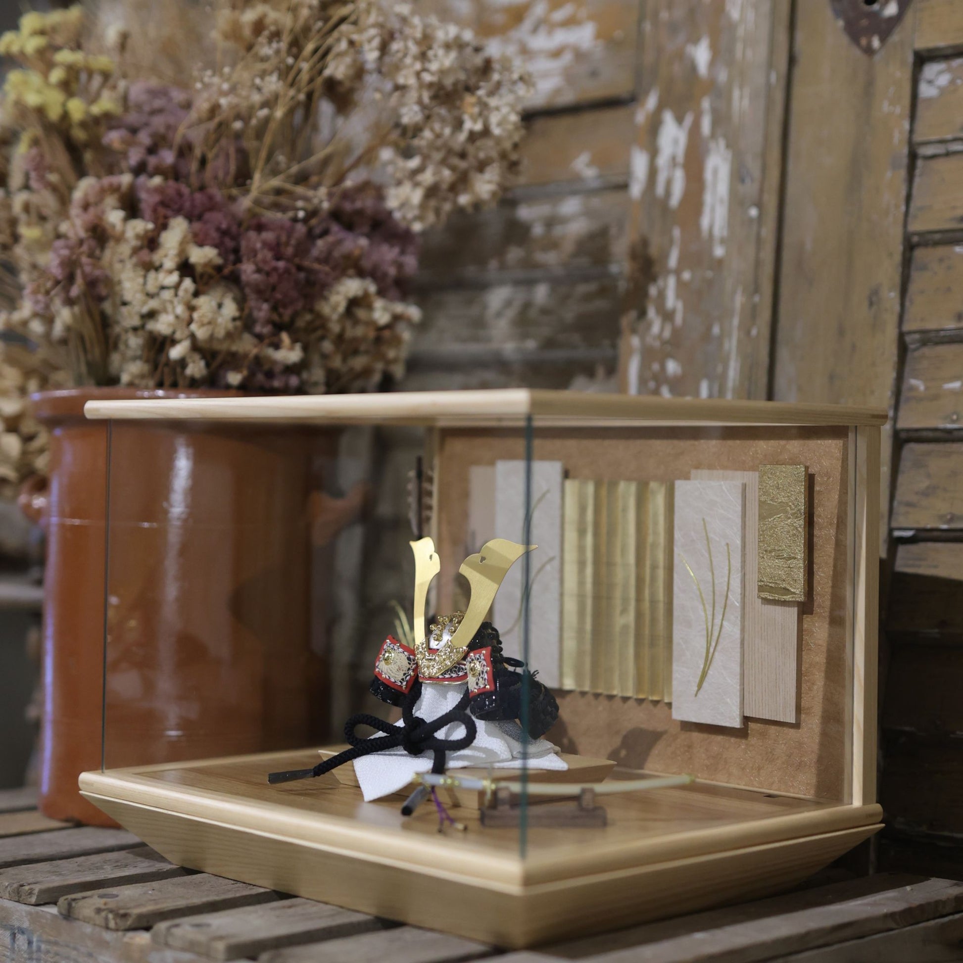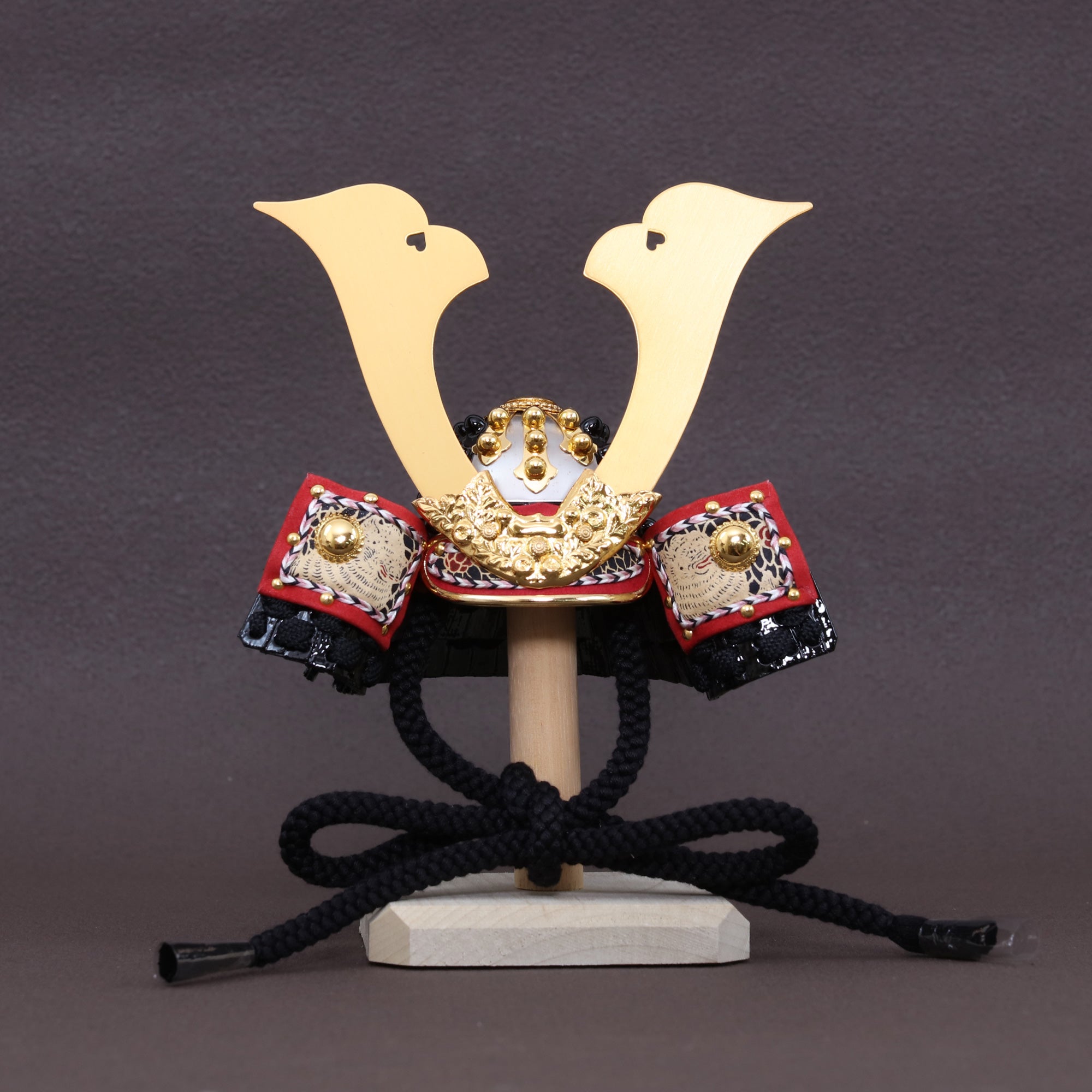 堂々とした幅を持つ大鍬形を、落ち着いた金色で仕立てました。