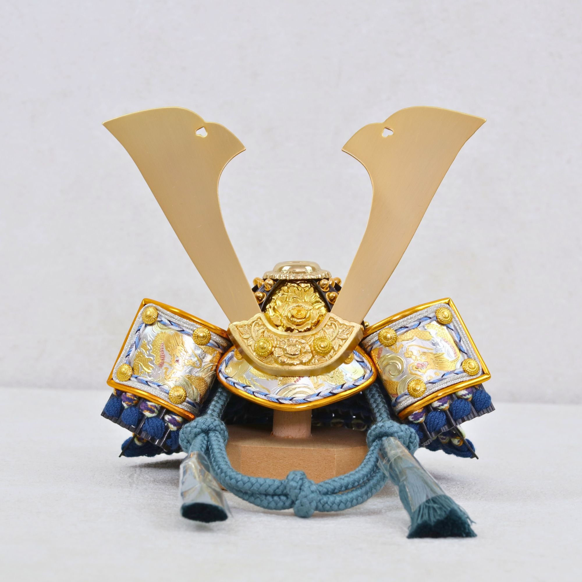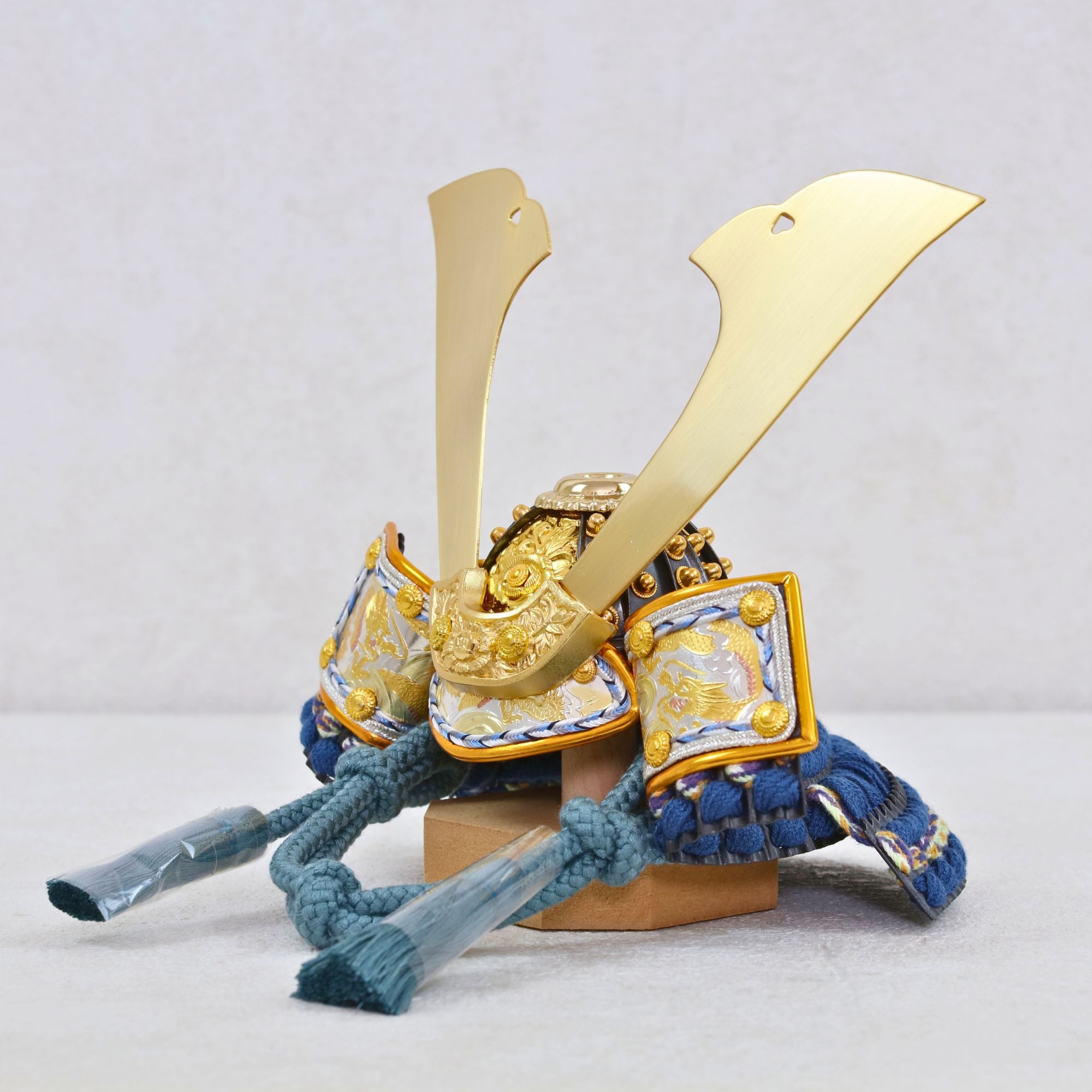 淡い青のトーンが龍柄の立体感をやさしく引き立て、兜全体に清潔感と品のある華やぎをプラス。