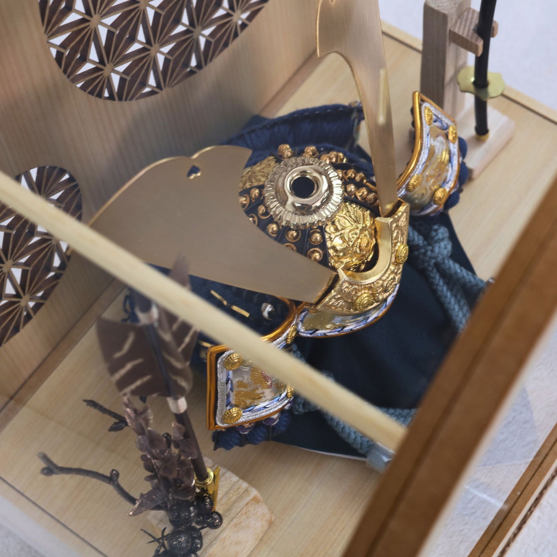 すっきりとした輪郭の鍬形は、軽やかさと安定感のバランスが美しく、兜全体を凛と引き締めます。