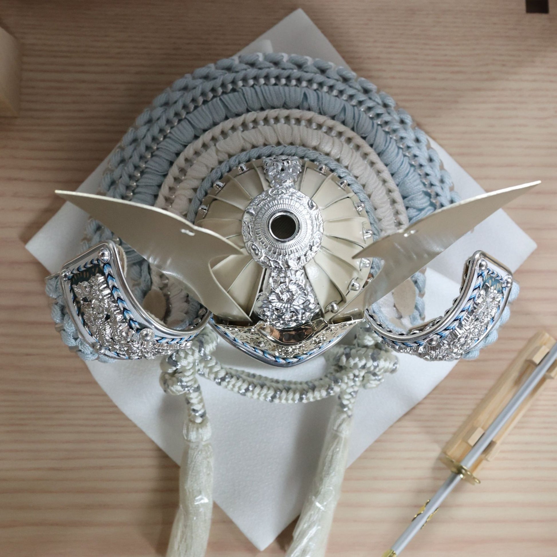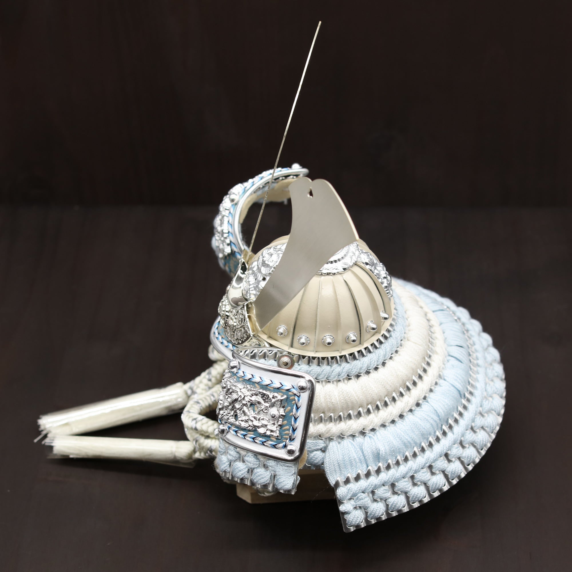 兜に使用している糸はすべて正絹を用いており、上質な素材感と伝統的な美しさを兼ね備えています。正絹特有の柔らかさと光沢が、兜全体に品格と華やかさを与え、細部にまでこだわった仕上がりを実現しています。伝統工芸にふさわしい高品質な素材で、格調高い逸品となっています。