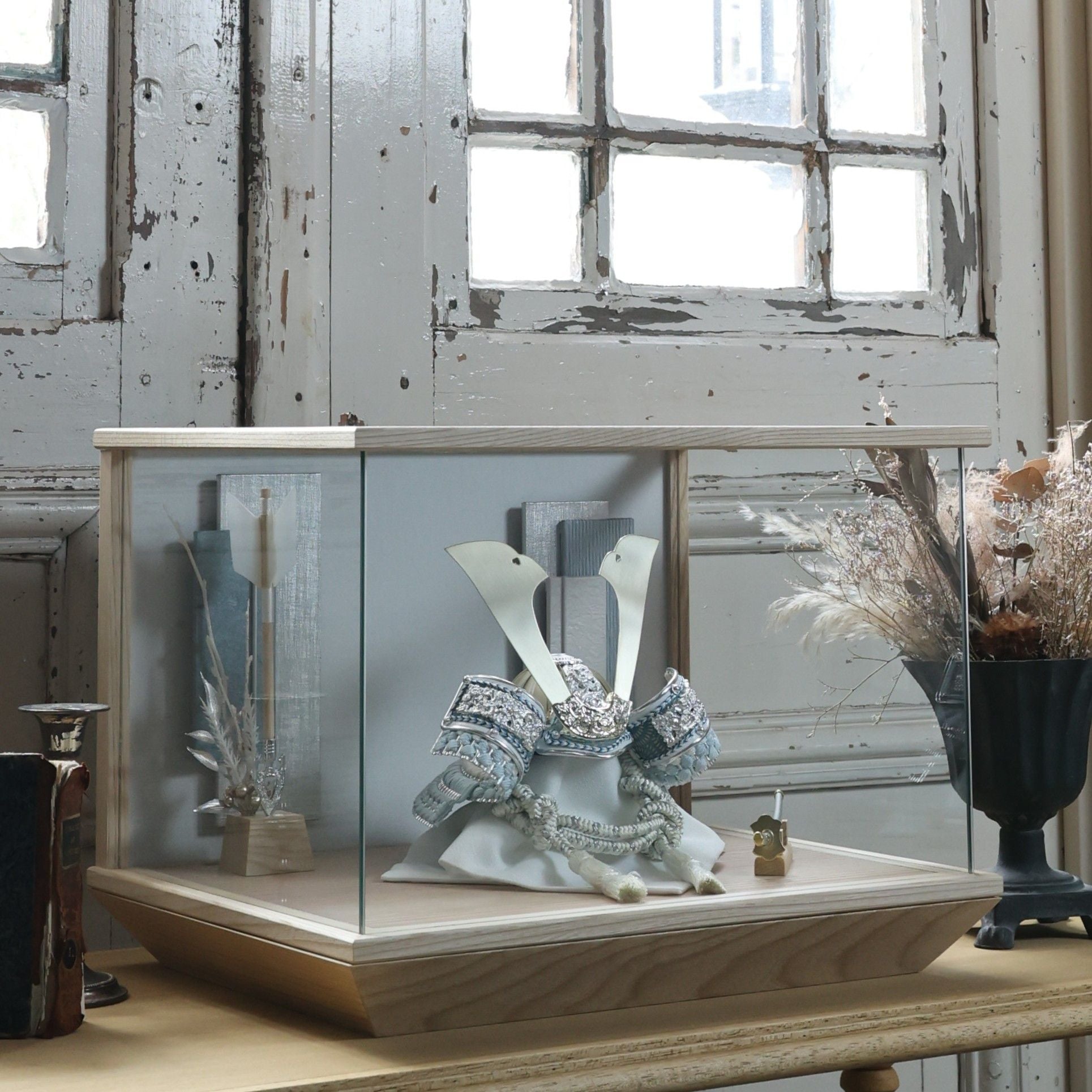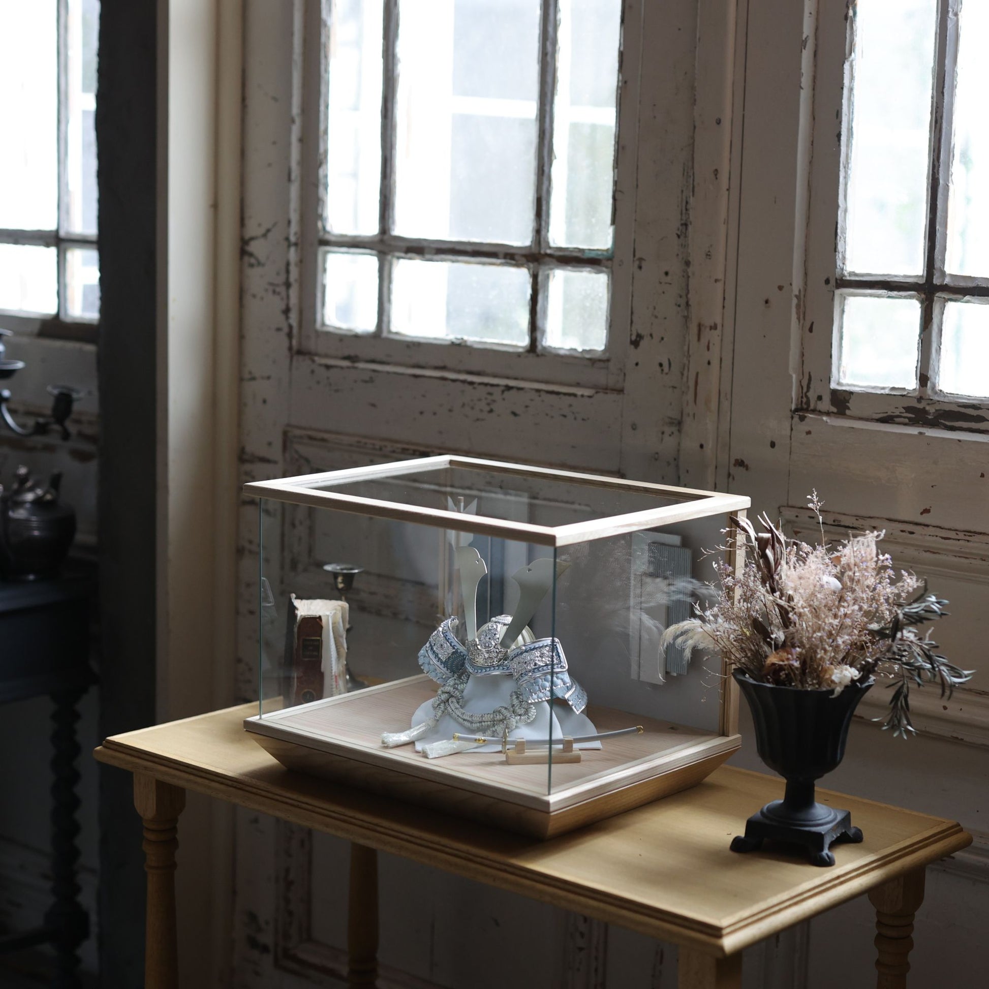 強い輝きではなく、白を基調とした兜にふんわりと光を差し込み、清らかな印象を引き立てます。