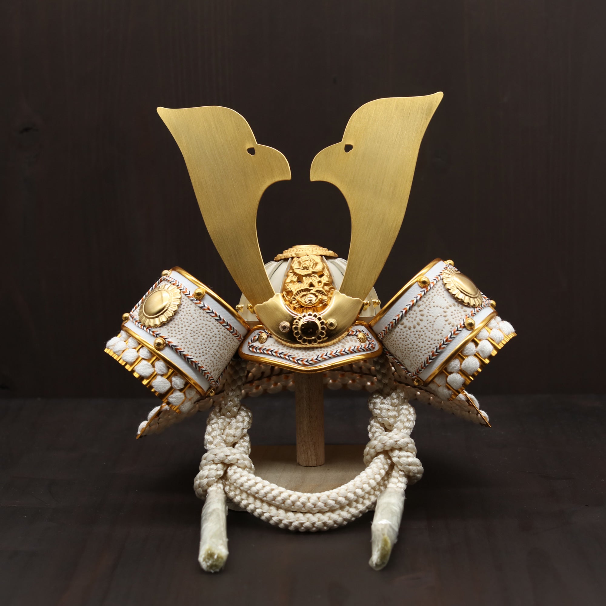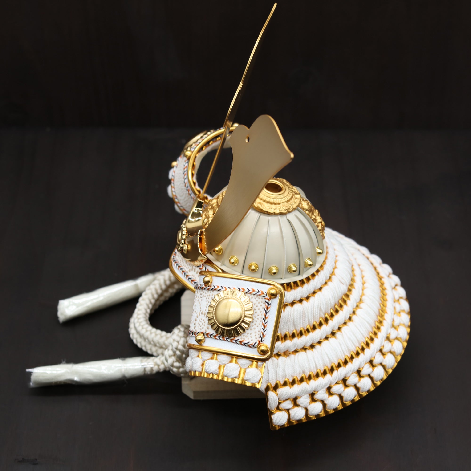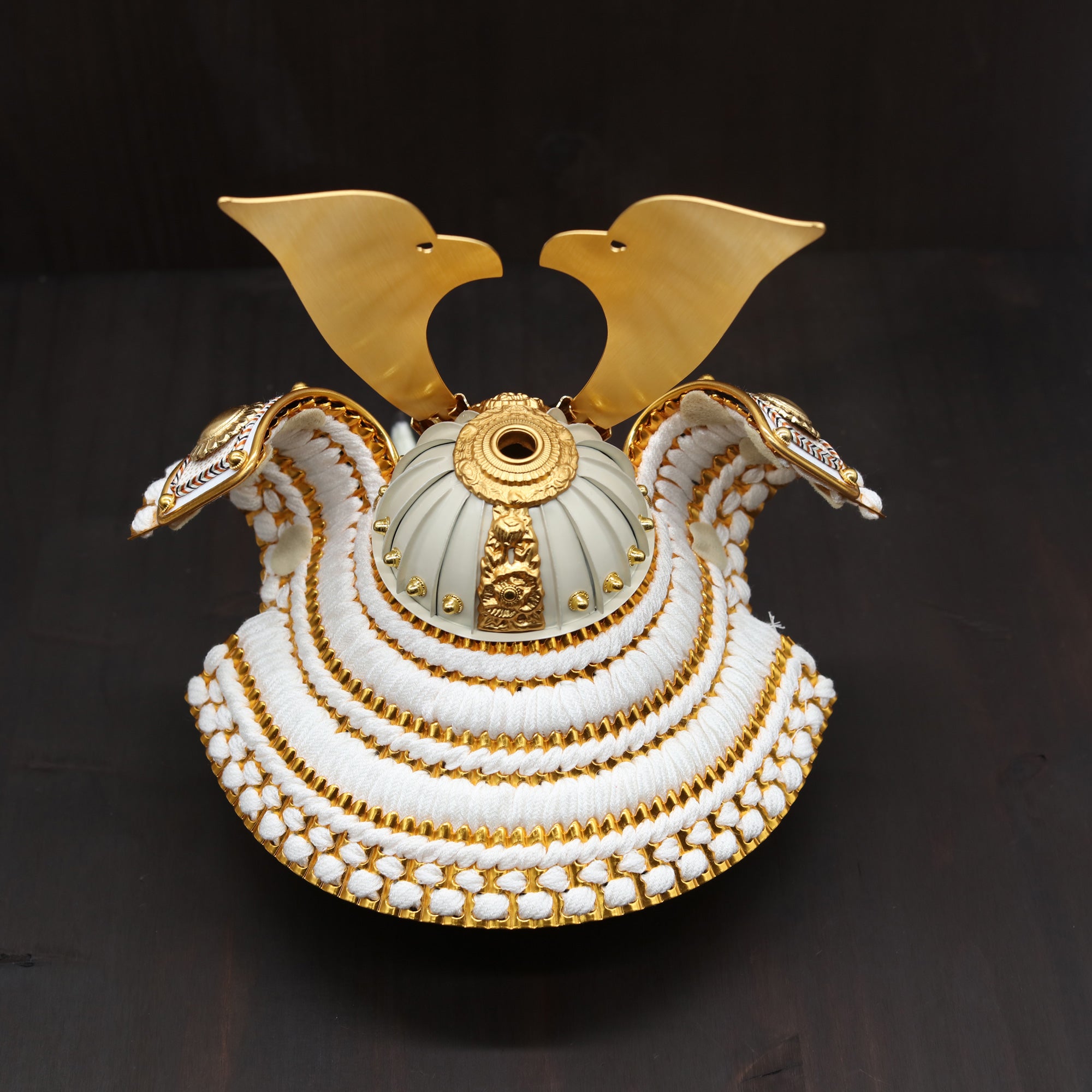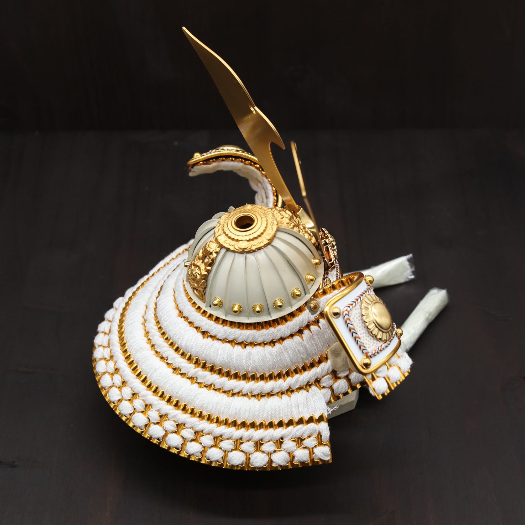 白を基調とした兜に穏やかな輝きを添え、装飾の美しさを端正に引き立てます。
