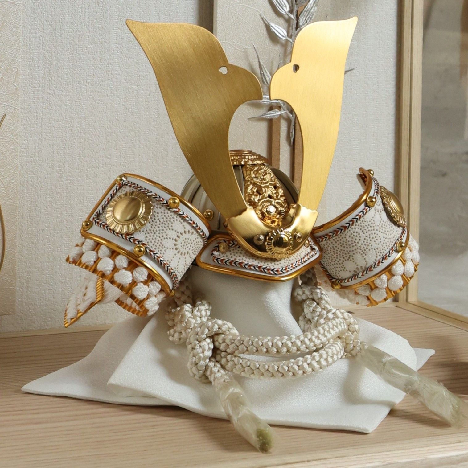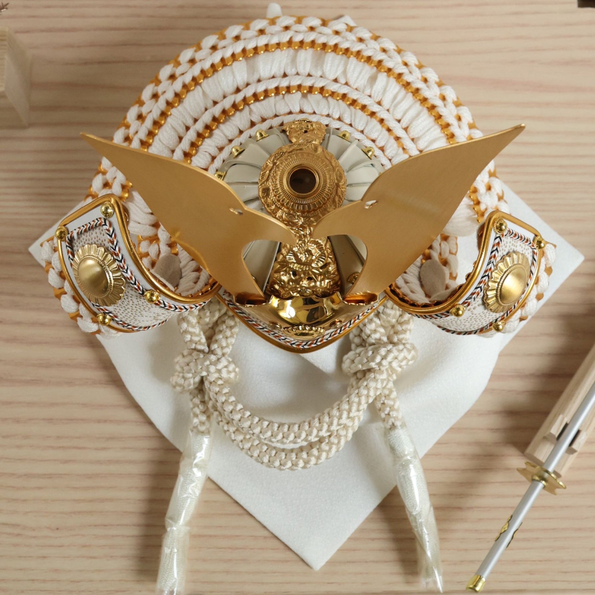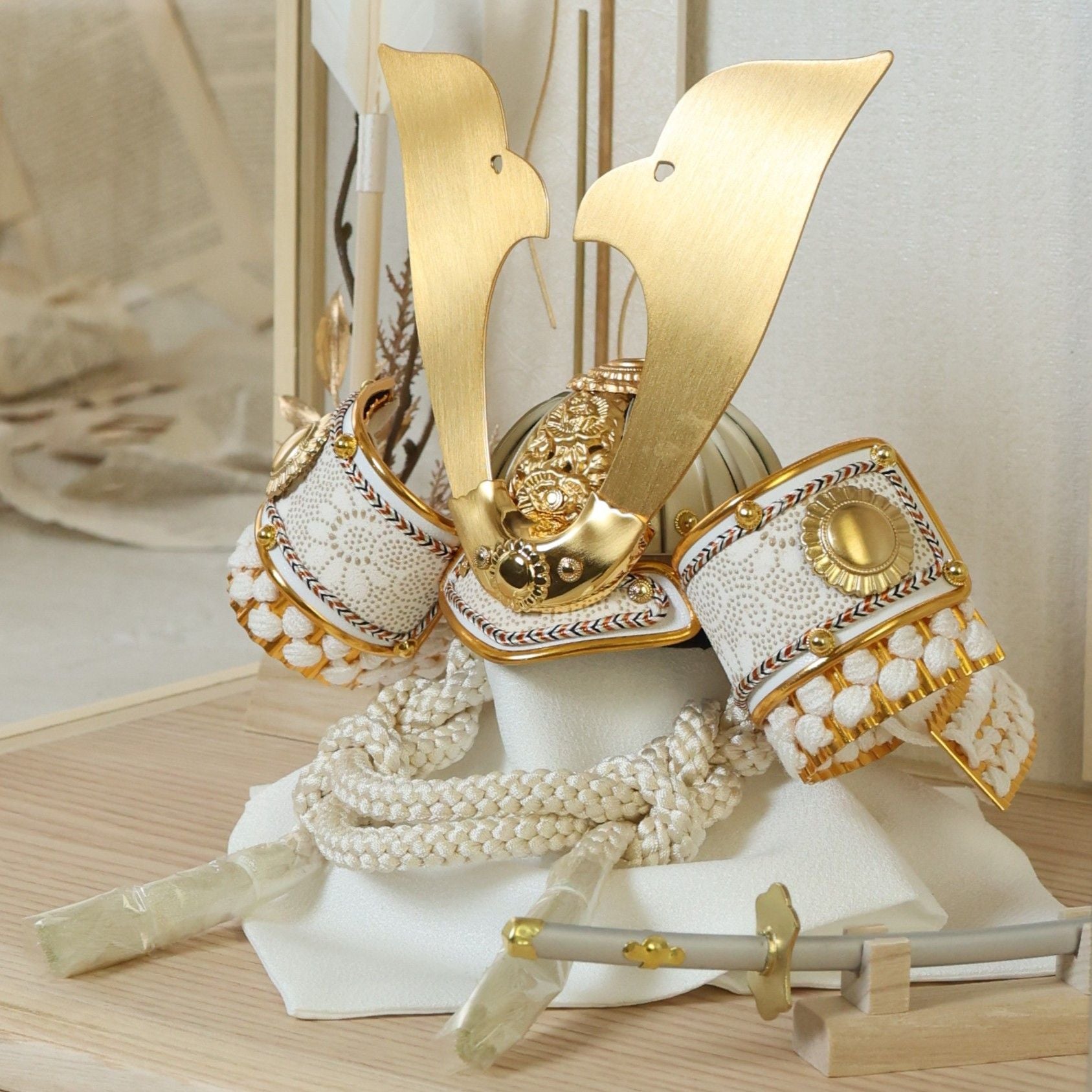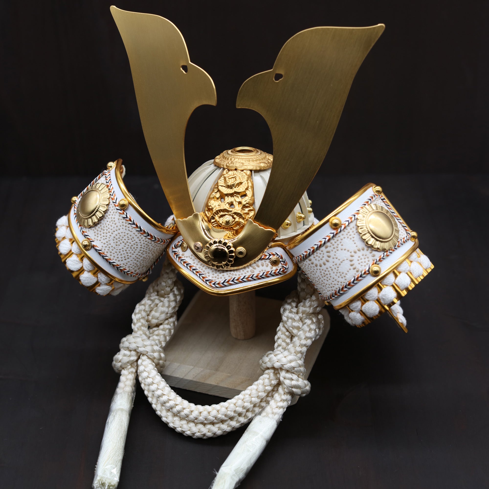白を基調とした兜に穏やかな輝きを添え、装飾の美しさを端正に引き立てます。