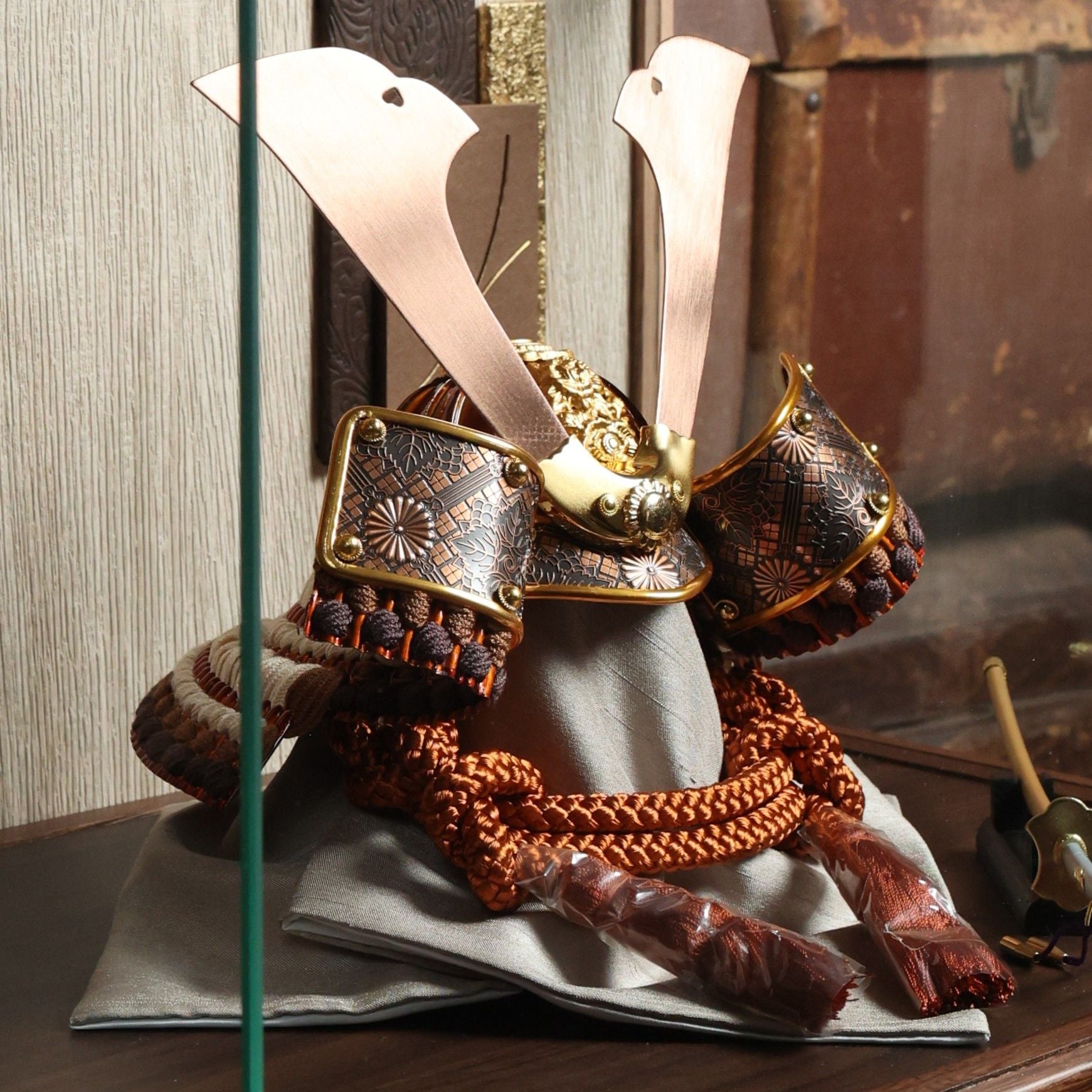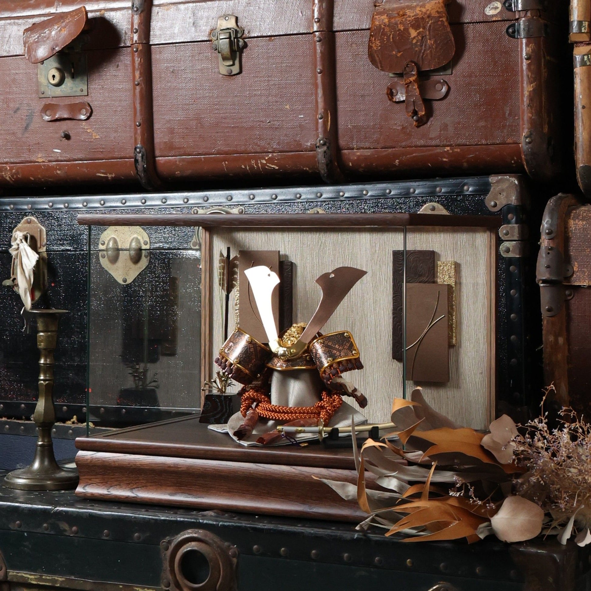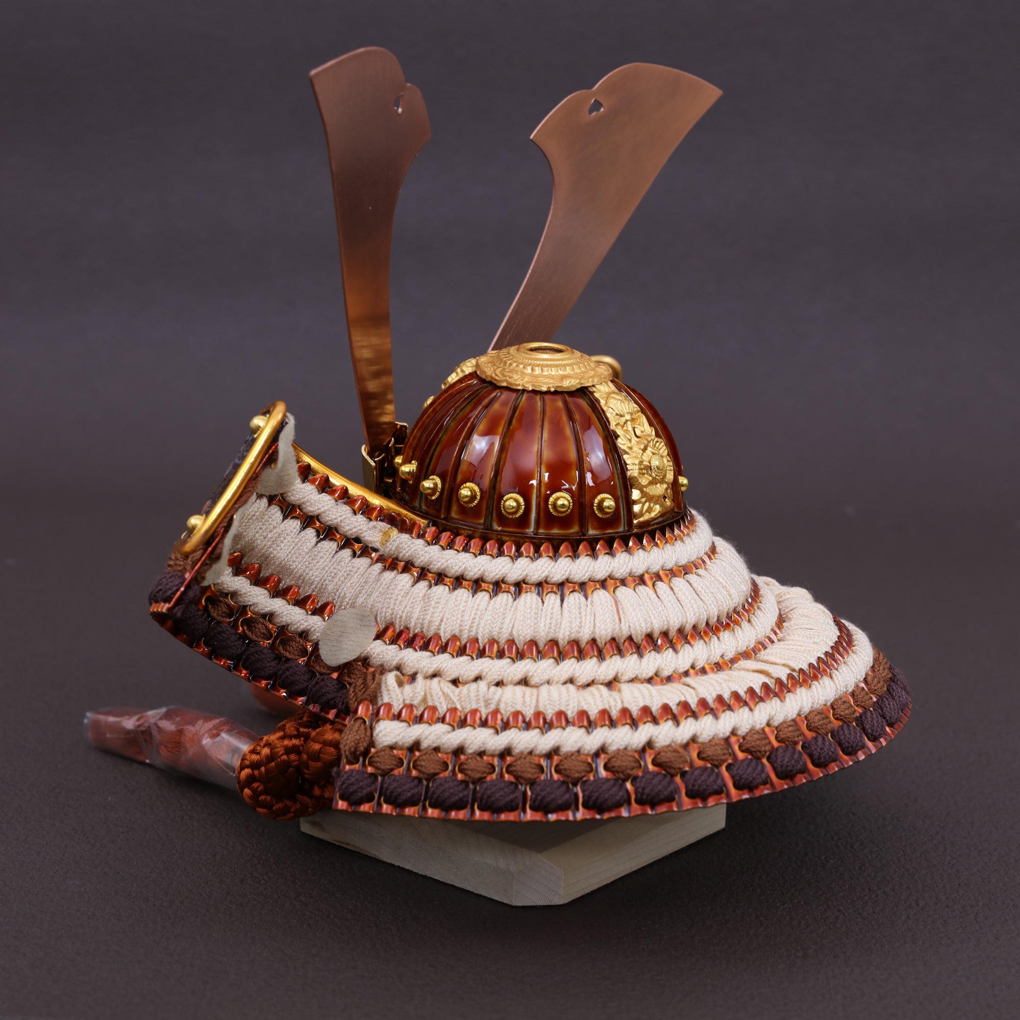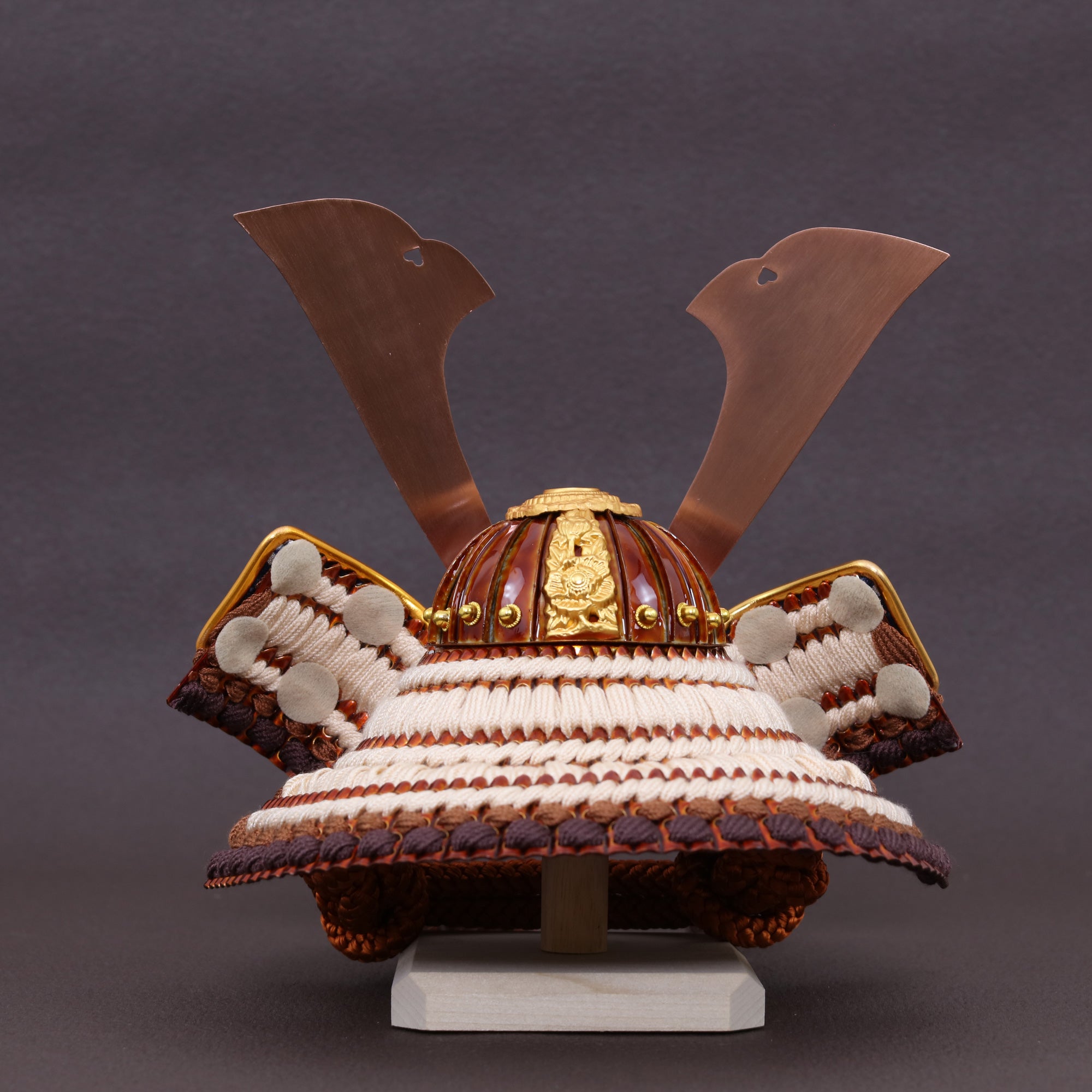落ち着いた艶が兜の輪郭をすっと引き立て、深みのある色合わせに上品な華やぎを添えます。