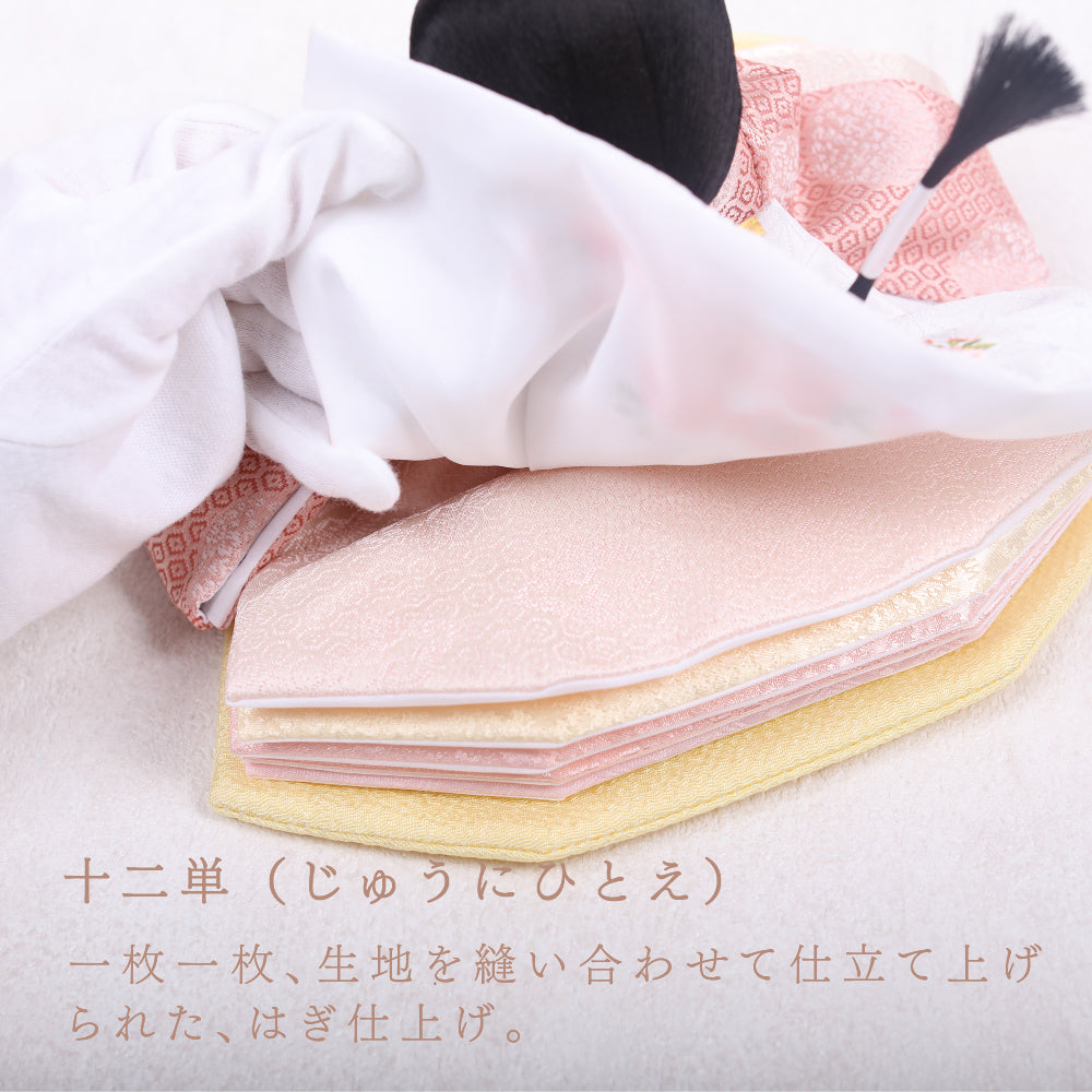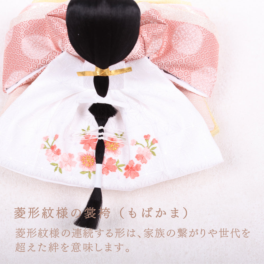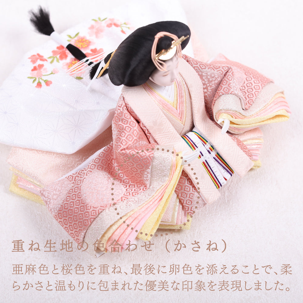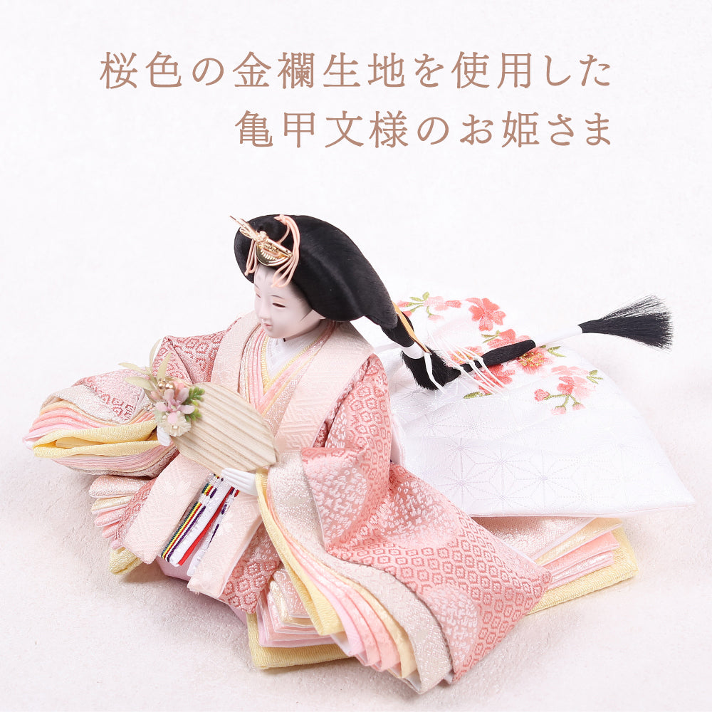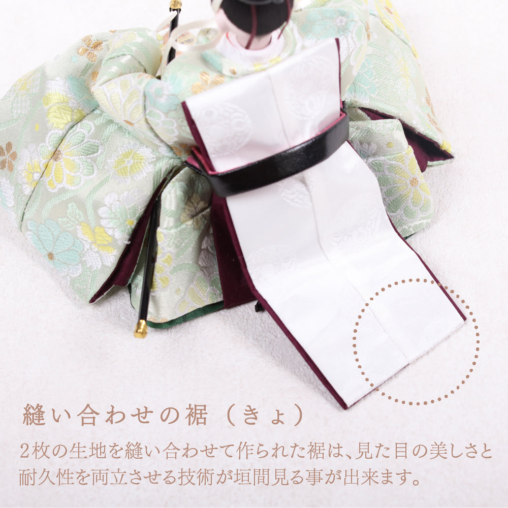 金襴は、豪華な織物で、全て金糸で模様を織り出しています。この技法は中国の宋代に始まり、明の時代に栄えました。日本には室町時代に伝来し、当初は「織金(しょくきん)」と呼ばれていました。金襴は金を多く用いているため、特に華やかで、雛人形の衣装や、着物の帯にもよく使われ、その黄金色の輝きが重厚感を与えます。金襴の模様は細やかで、職人の高い技術が必要です。雛人形に使用することで、伝統的な美しさを引き立て、特別な存在感を生み出します