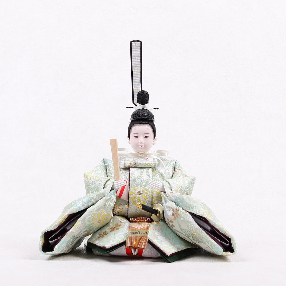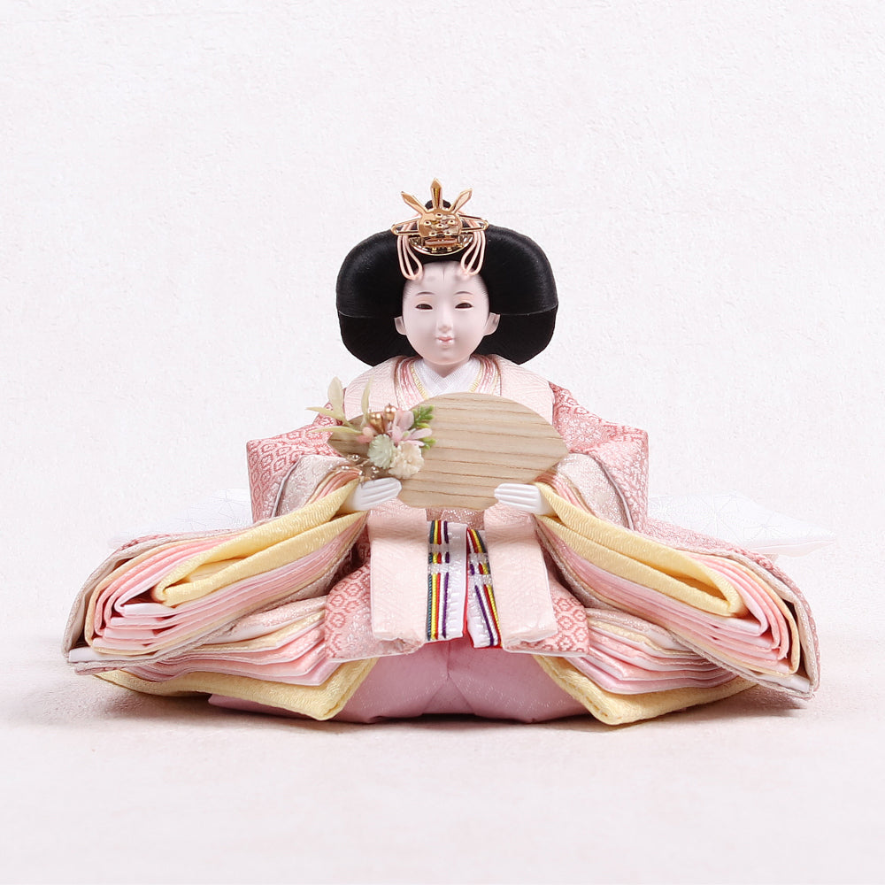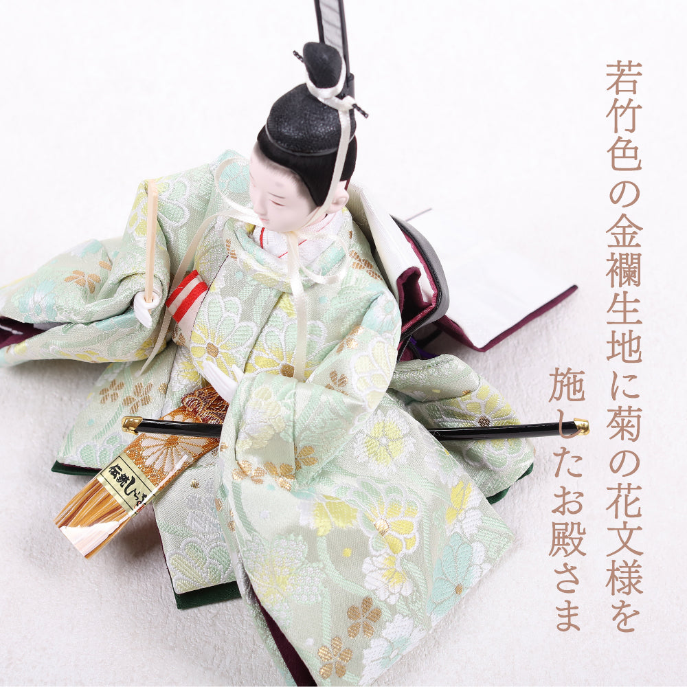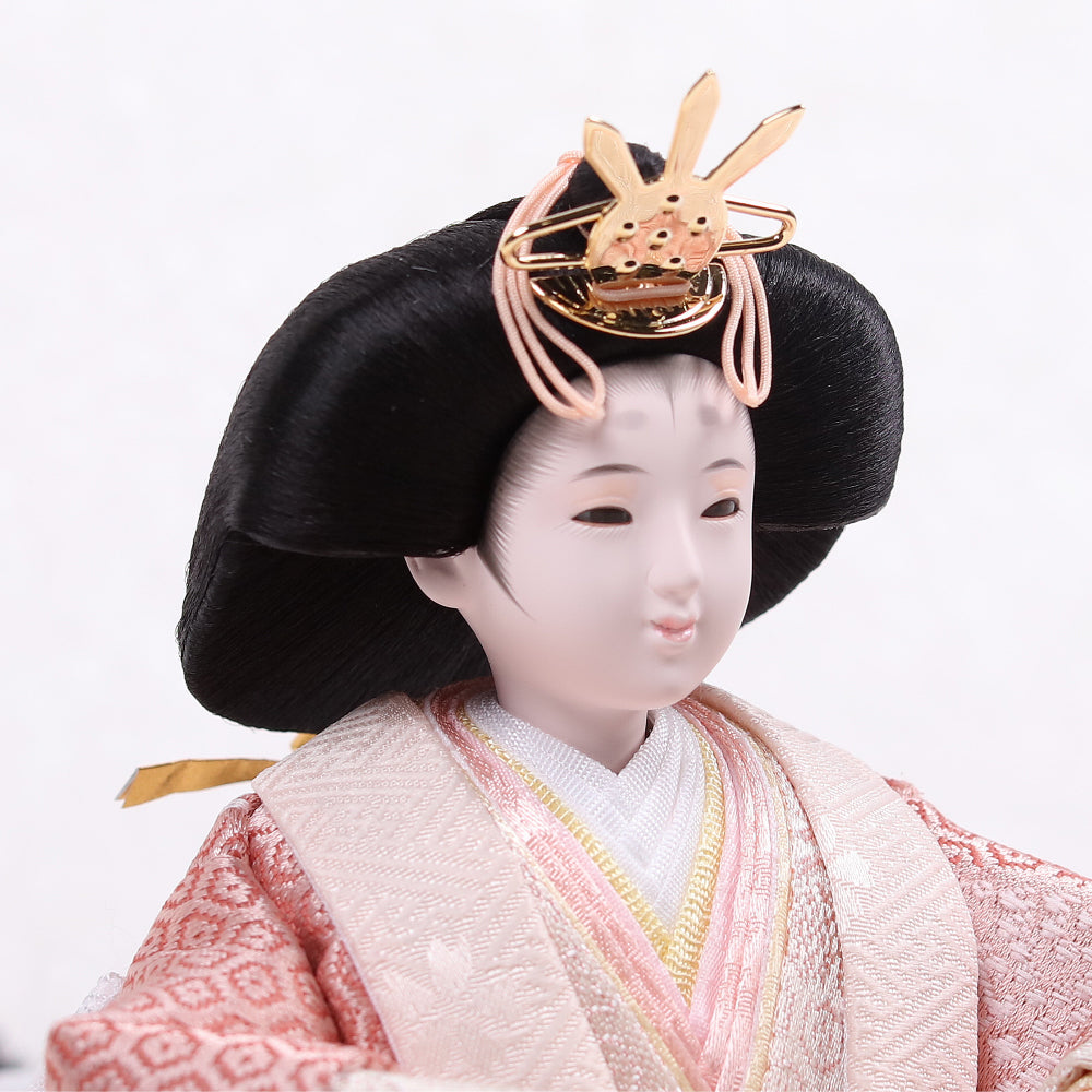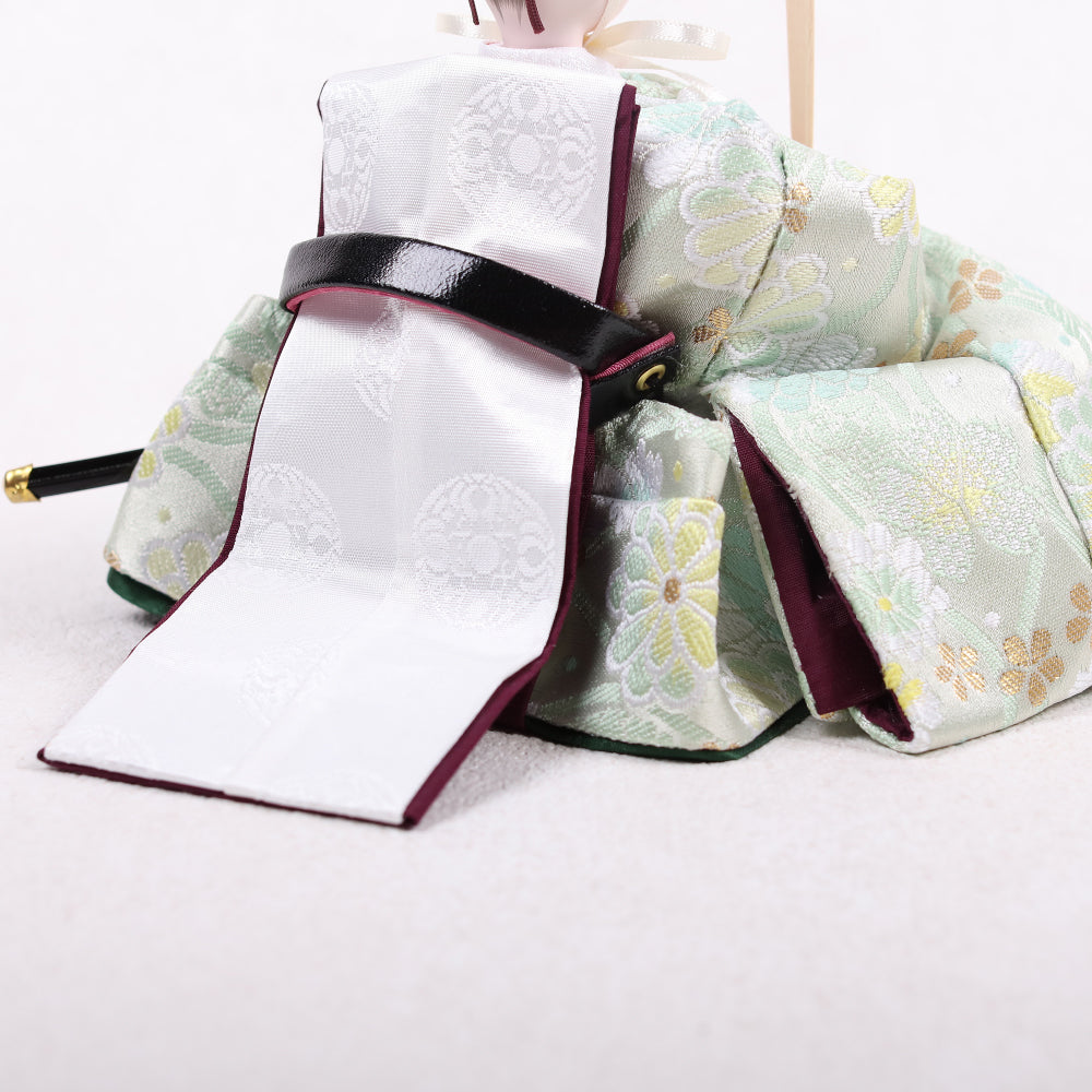 金襴は、豪華な織物で、全て金糸で模様を織り出しています。この技法は中国の宋代に始まり、明の時代に栄えました。日本には室町時代に伝来し、当初は「織金(しょくきん)」と呼ばれていました。金襴は金を多く用いているため、特に華やかで、雛人形の衣装や、着物の帯にもよく使われ、その黄金色の輝きが重厚感を与えます。金襴の模様は細やかで、職人の高い技術が必要です。雛人形に使用することで、伝統的な美しさを引き立て、特別な存在感を生み出します