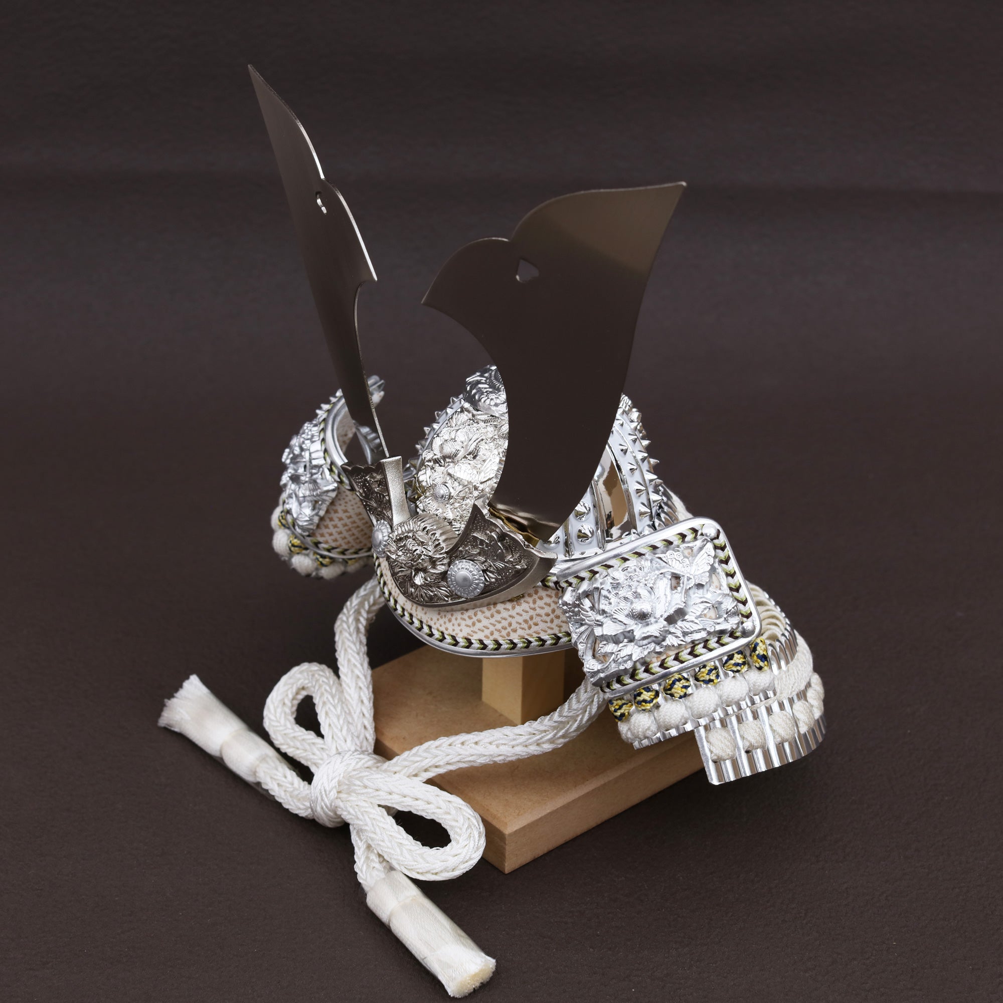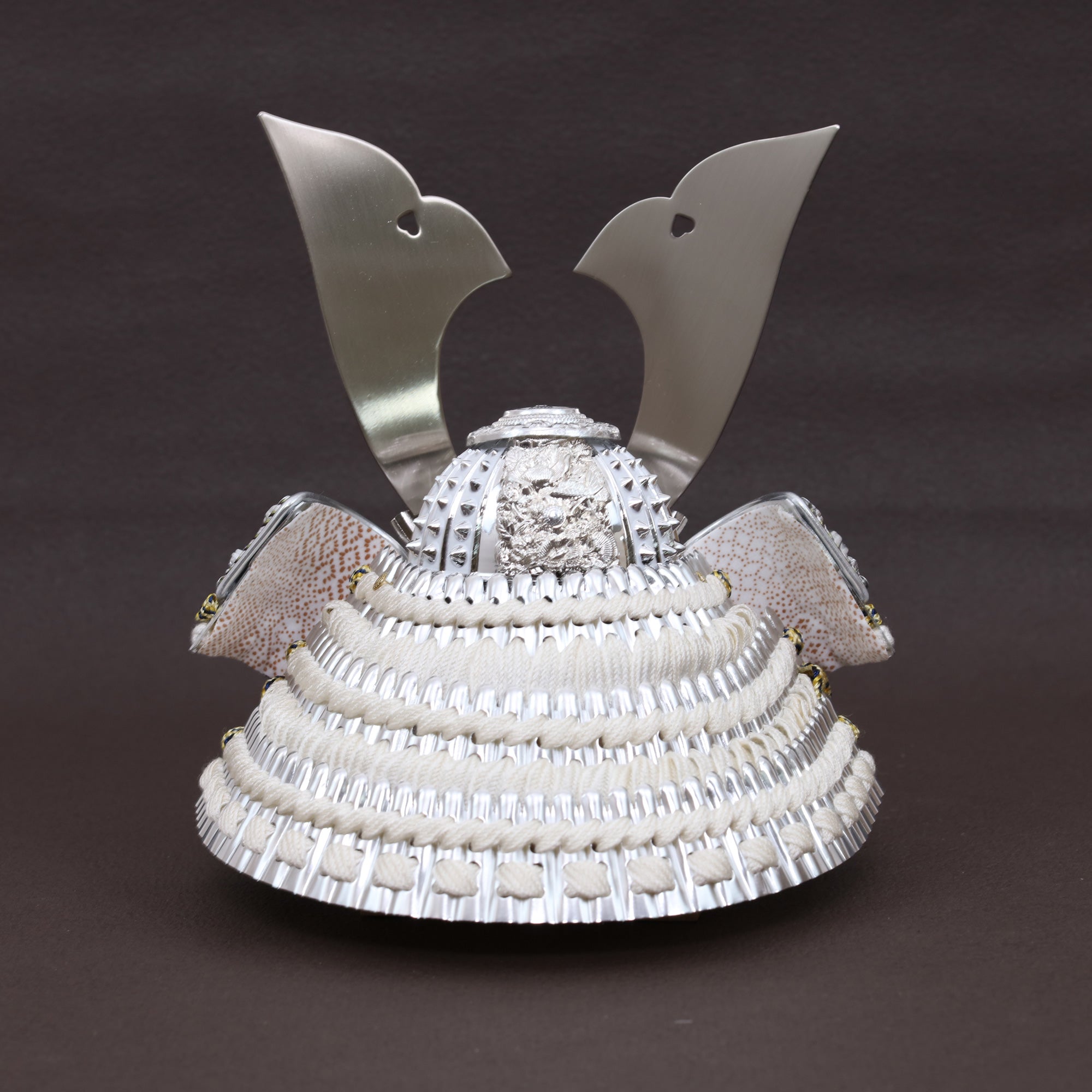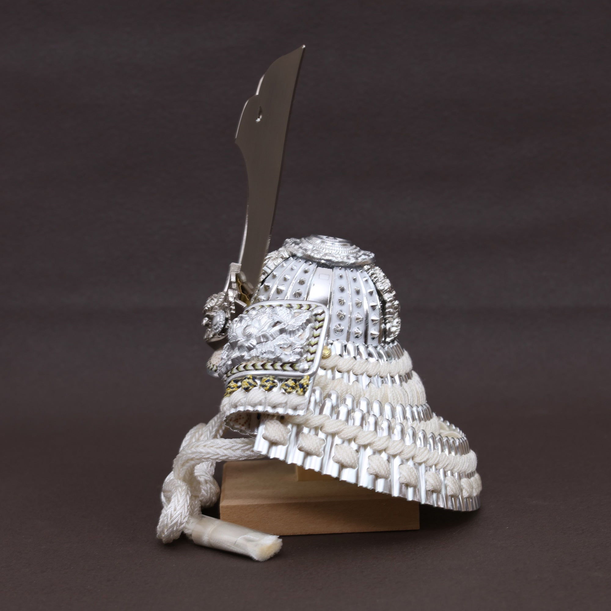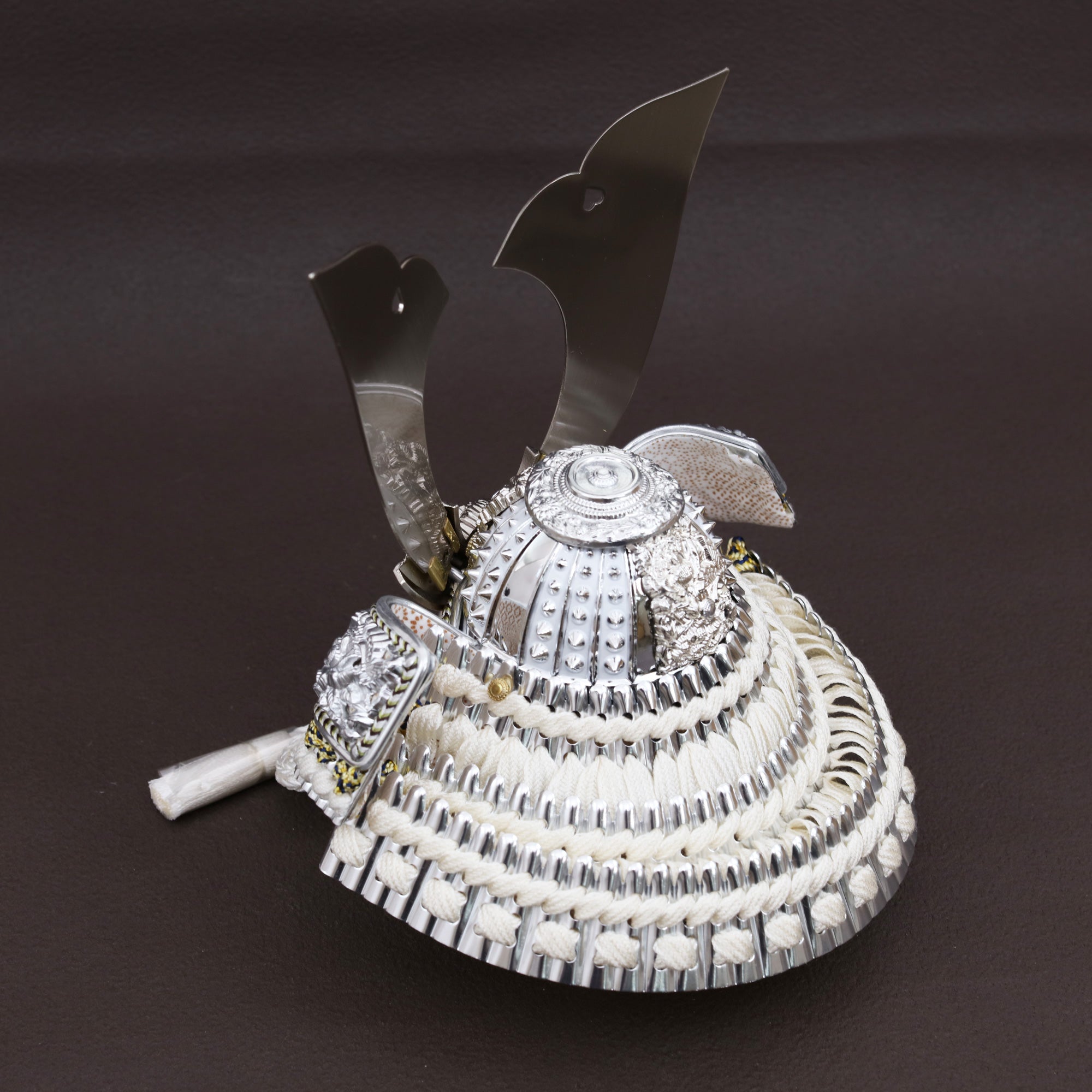 兜を彩る金具は、ただ飾るだけではなく、全体の格を引き上げる“顔”のような存在。繊細な彫りや打ち出しの陰影が光を受けて浮かび上がり、上品な輝きを放ちます。華美になりすぎず、それでいて確かな存在感。すっきりとした白の組紐とも相まって、清らかで洗練された兜姿に仕上げています。