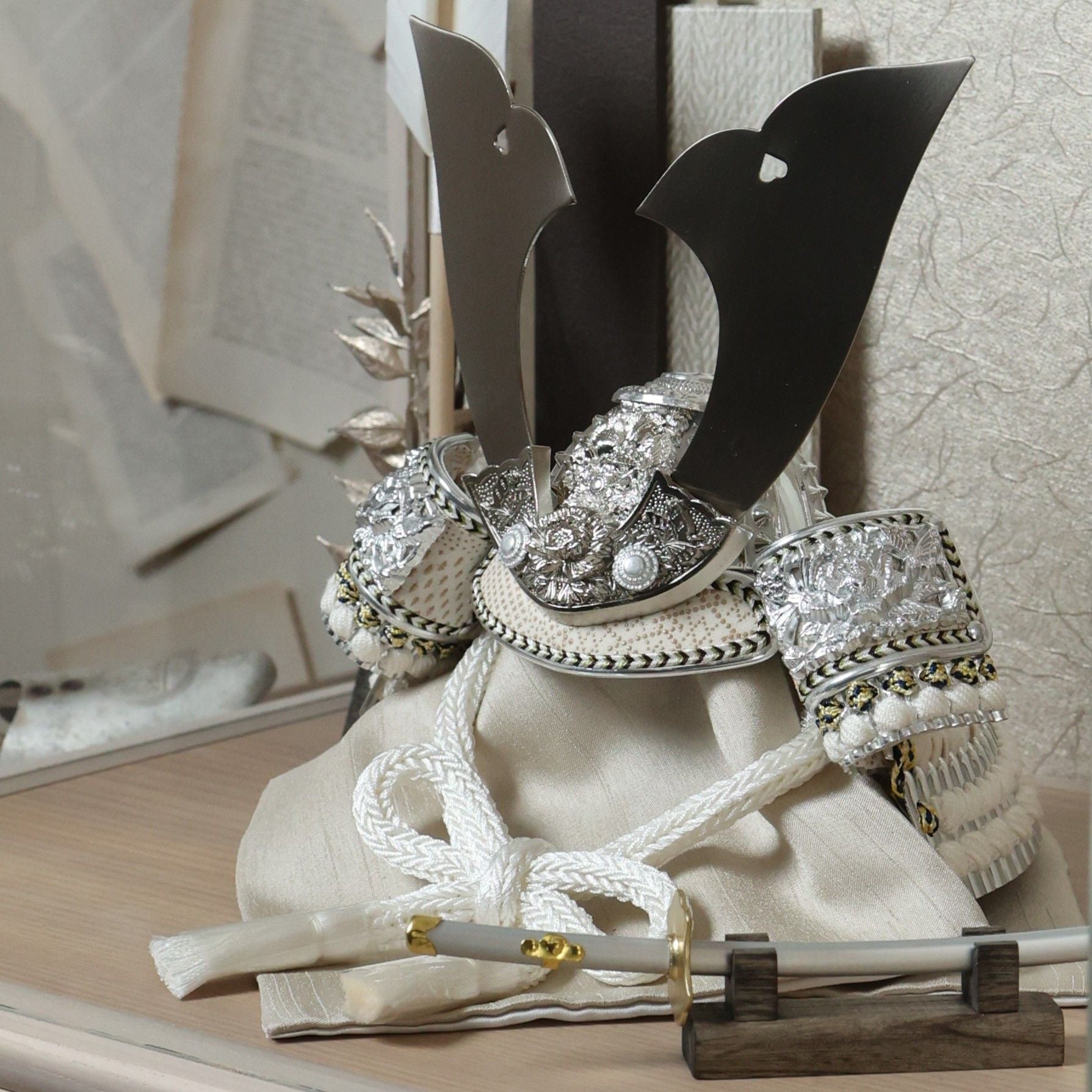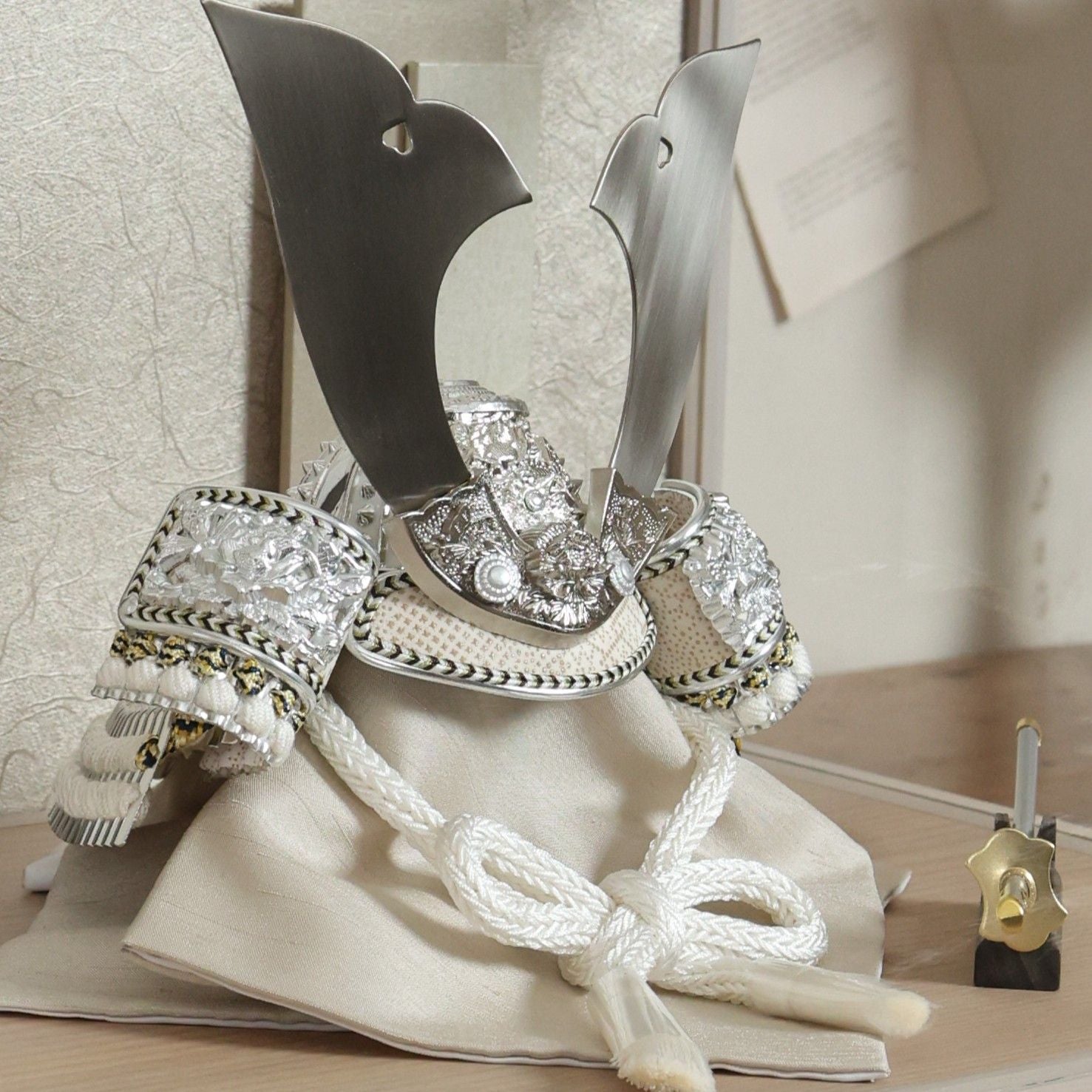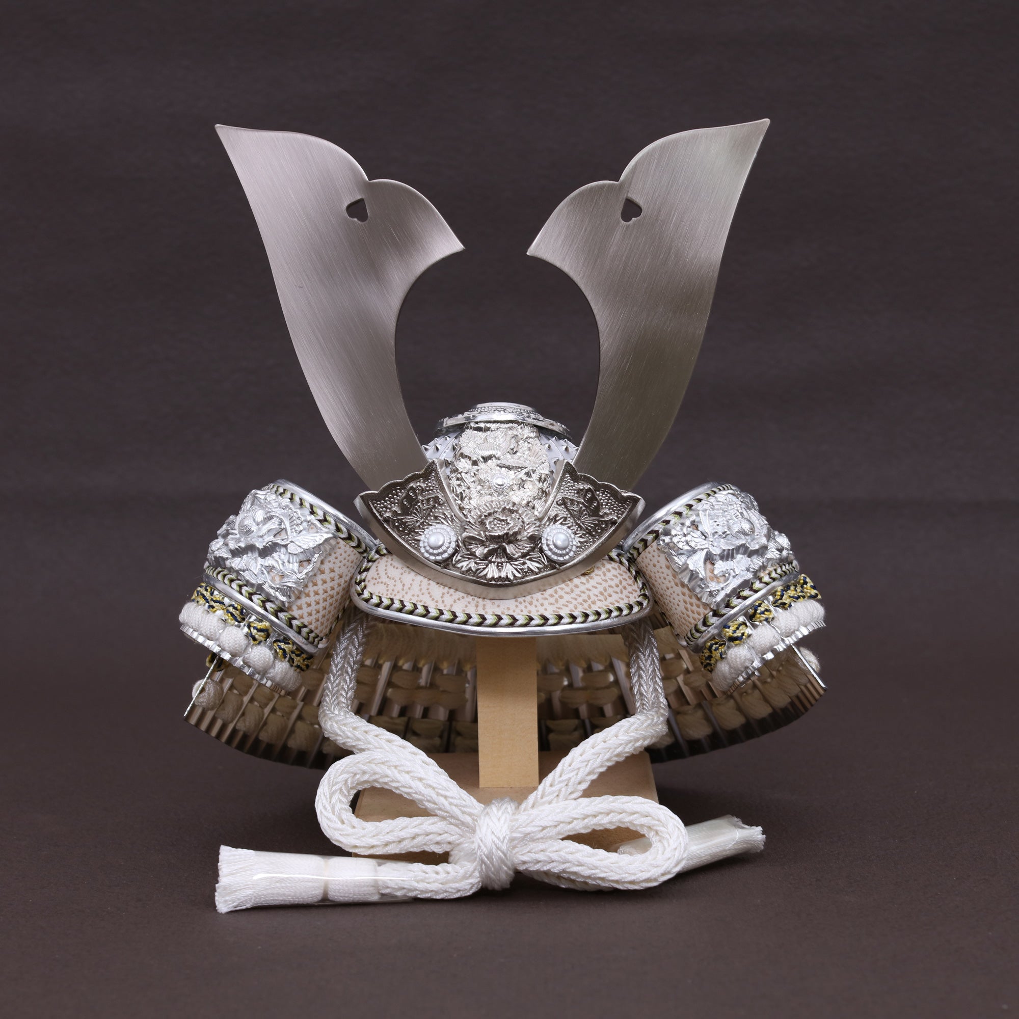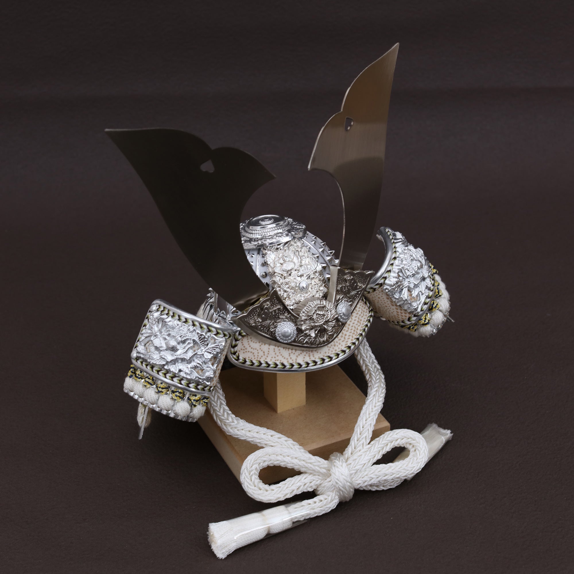 兜を彩る金具は、ただ飾るだけではなく、全体の格を引き上げる“顔”のような存在。繊細な彫りや打ち出しの陰影が光を受けて浮かび上がり、上品な輝きを放ちます。華美になりすぎず、それでいて確かな存在感。すっきりとした白の組紐とも相まって、清らかで洗練された兜姿に仕上げています。