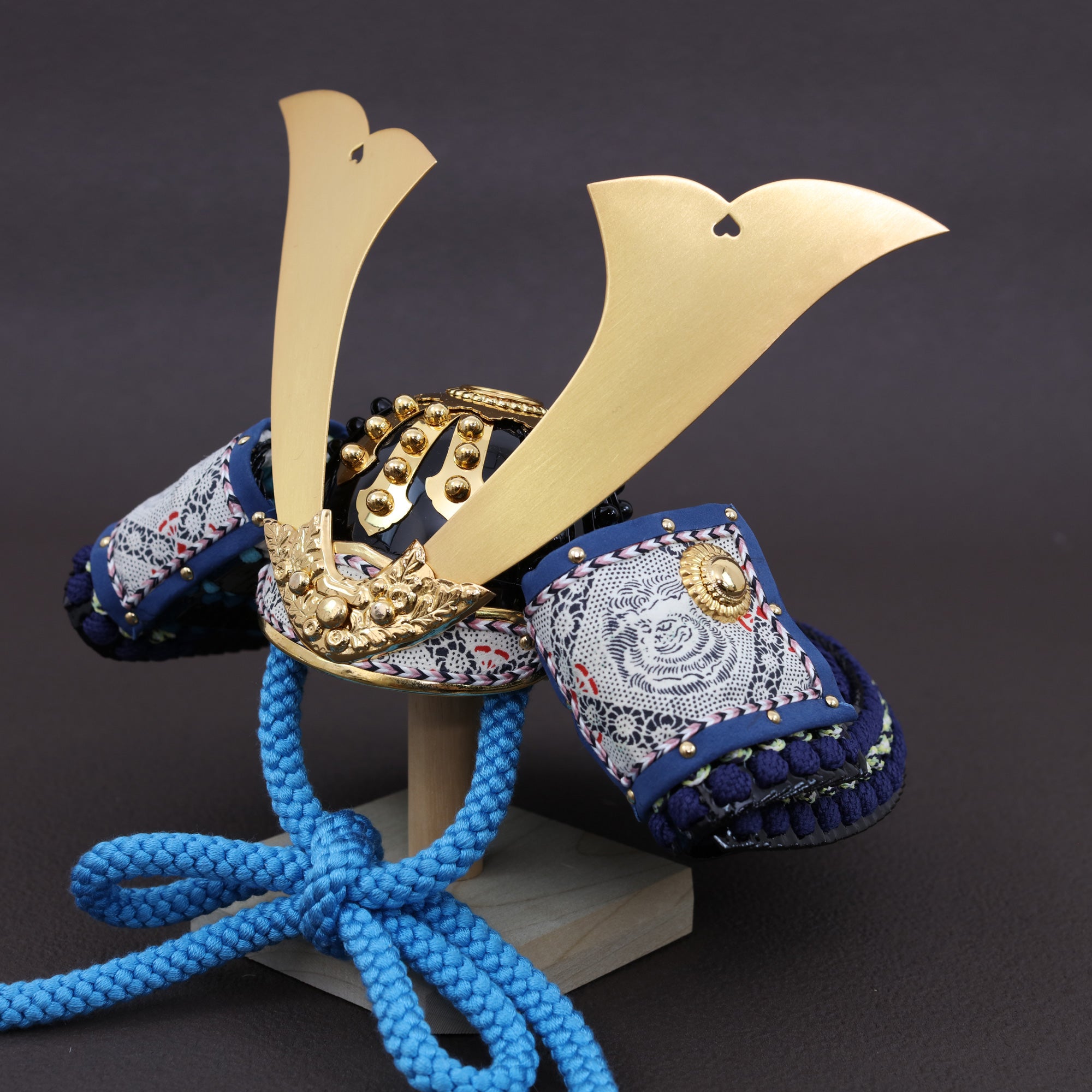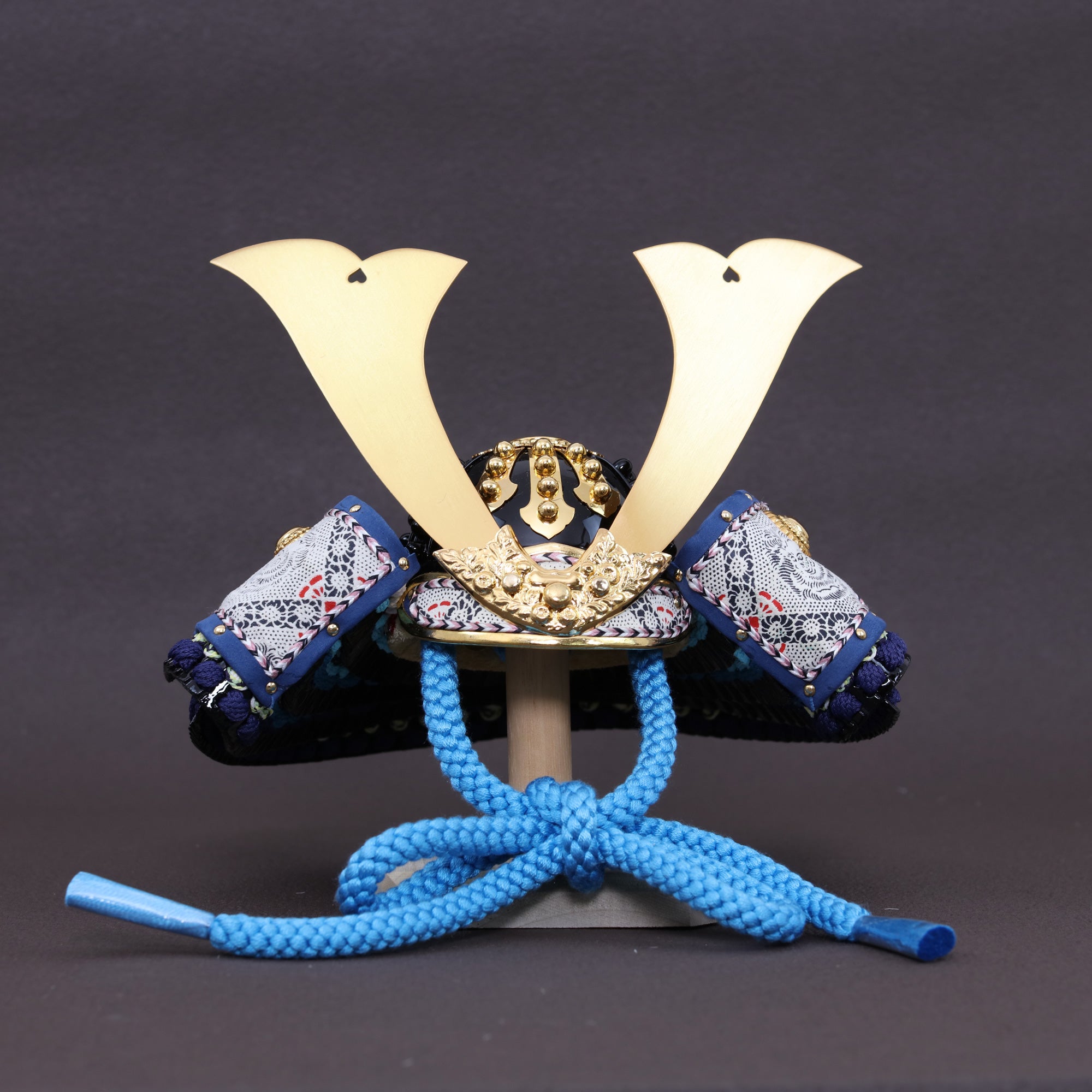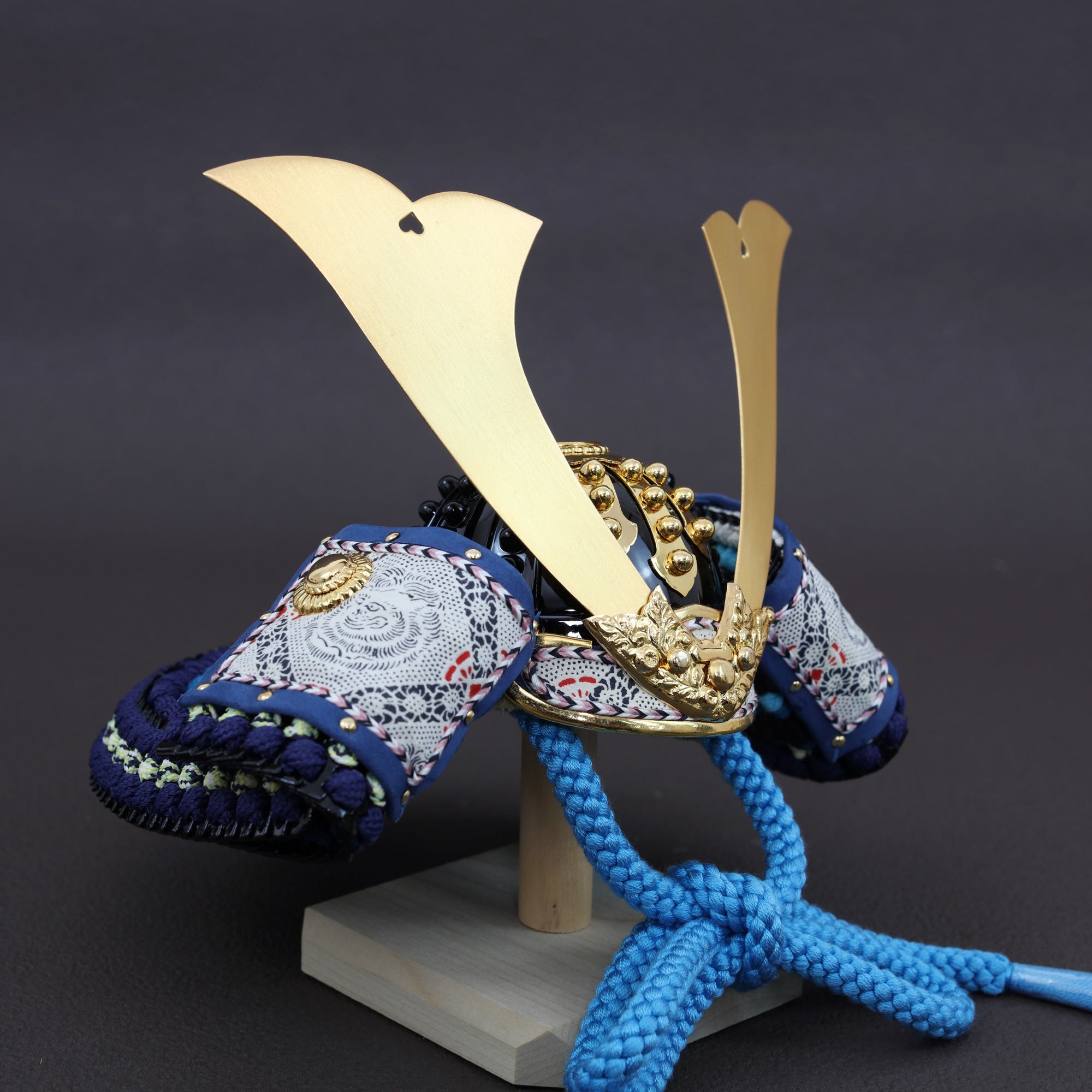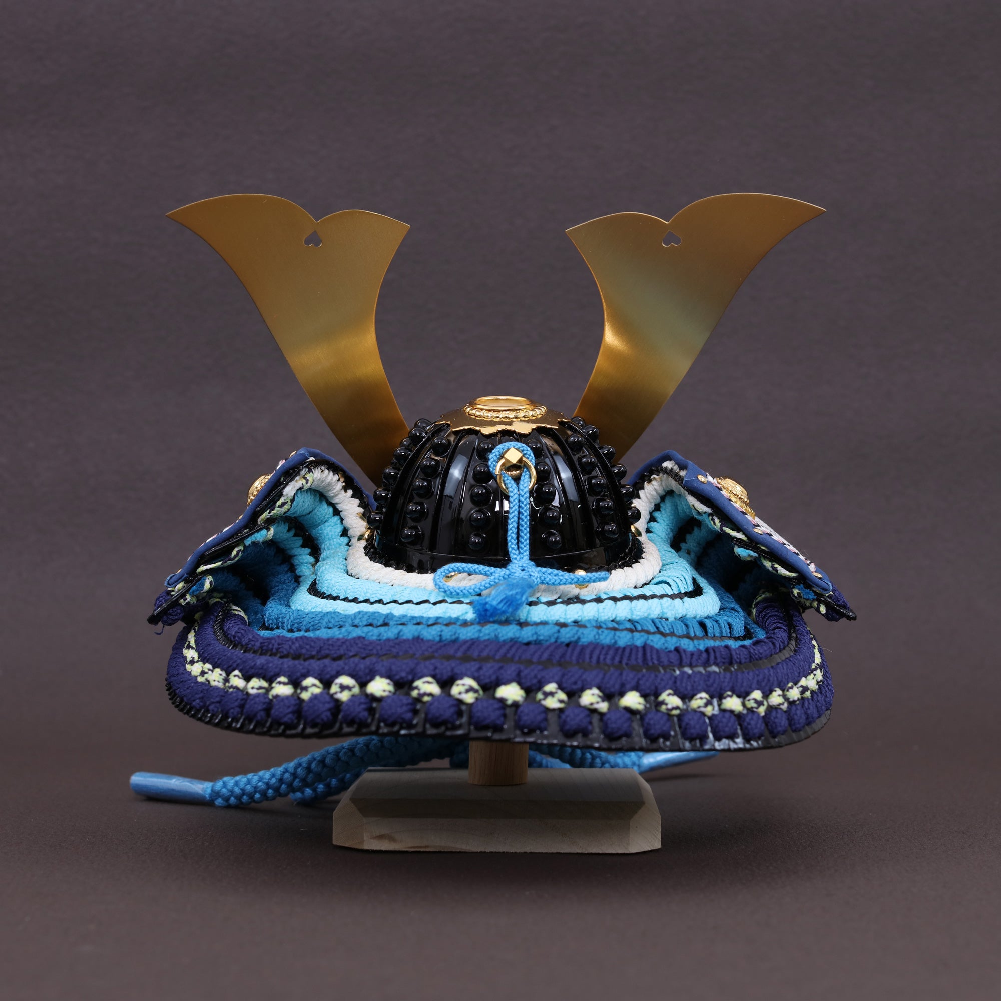 堂々とした幅を持つ大鍬形を、落ち着いた金色で仕立てました。