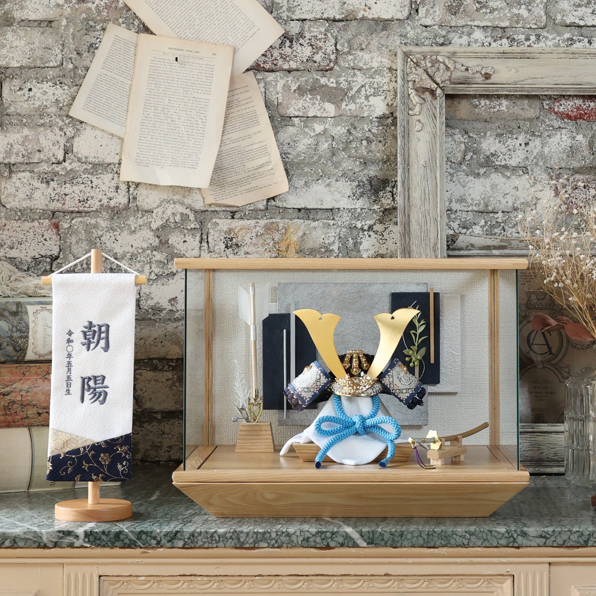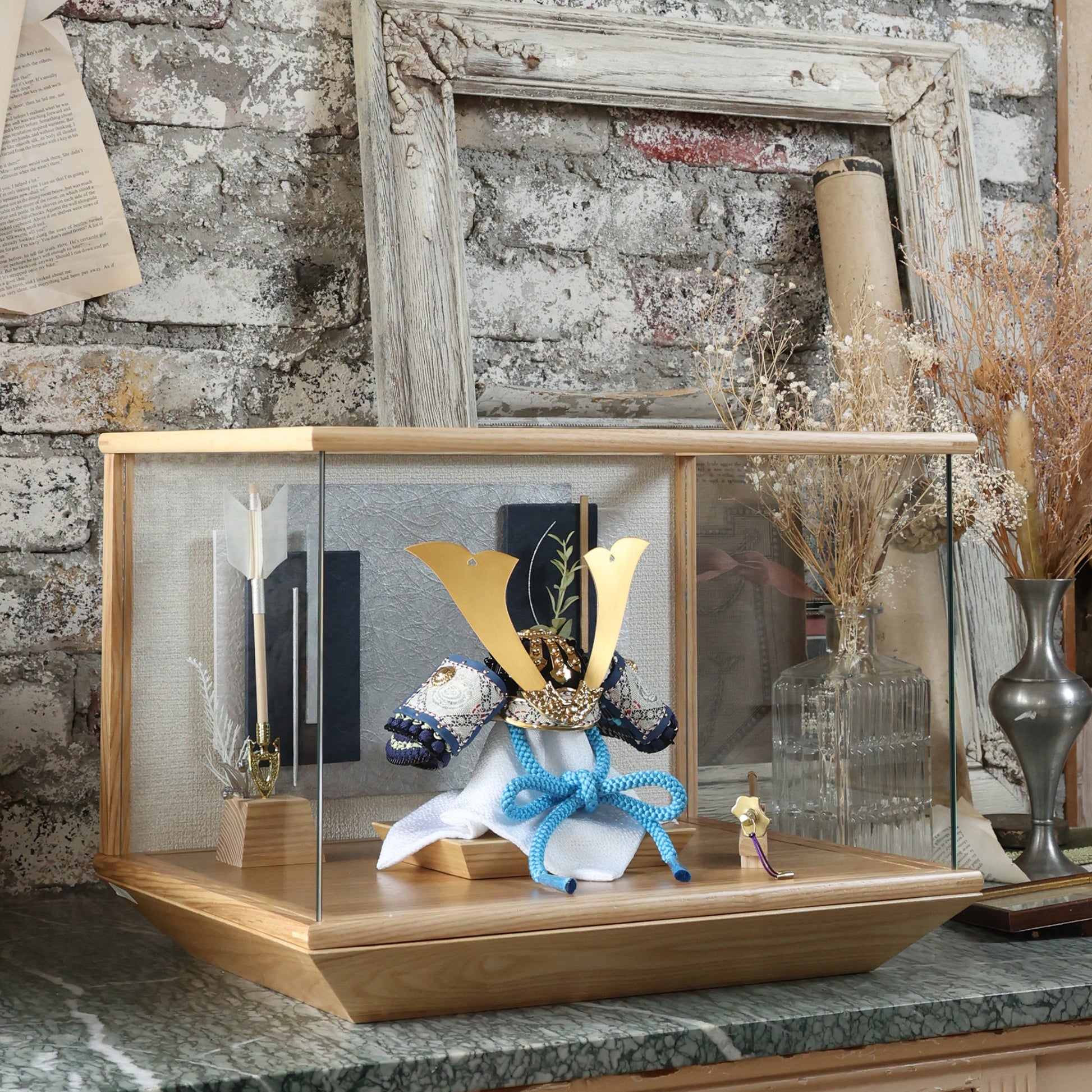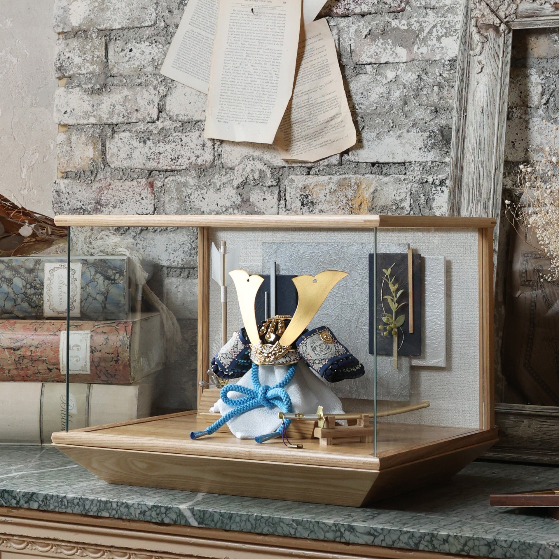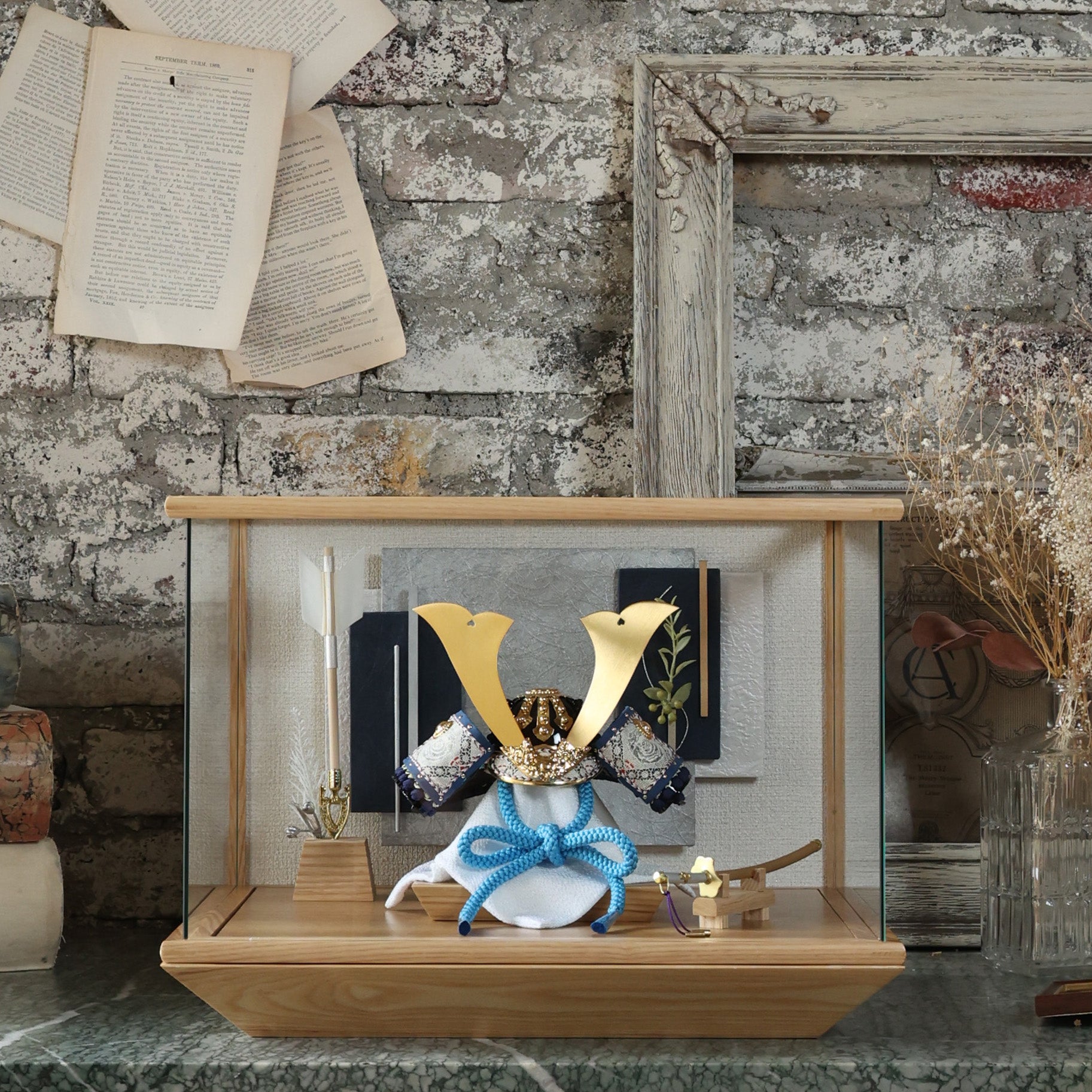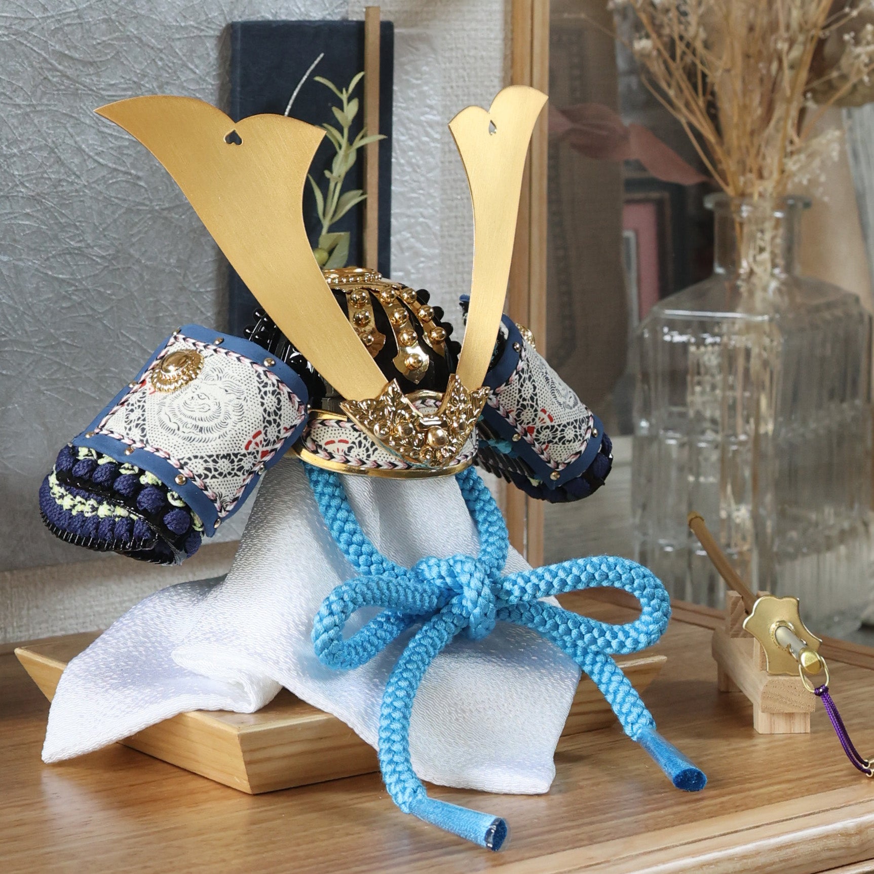 堂々とした幅を持つ大鍬形を、落ち着いた金色で仕立てました。