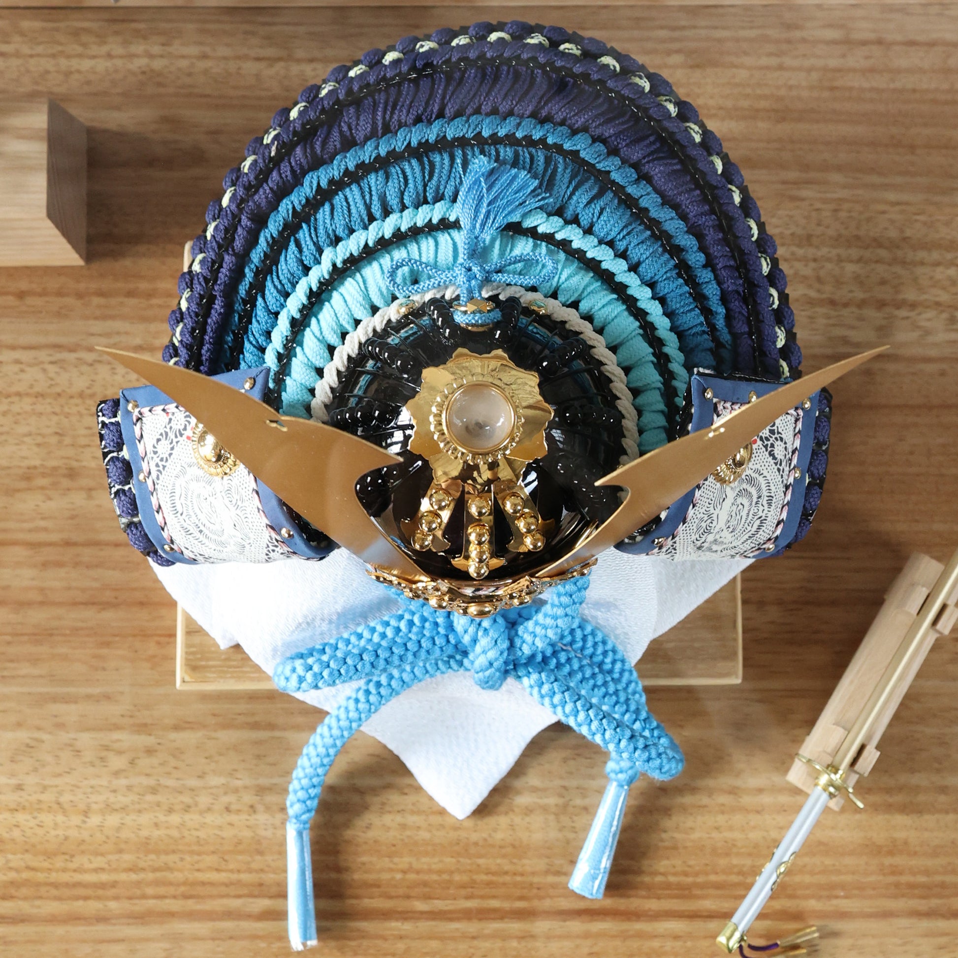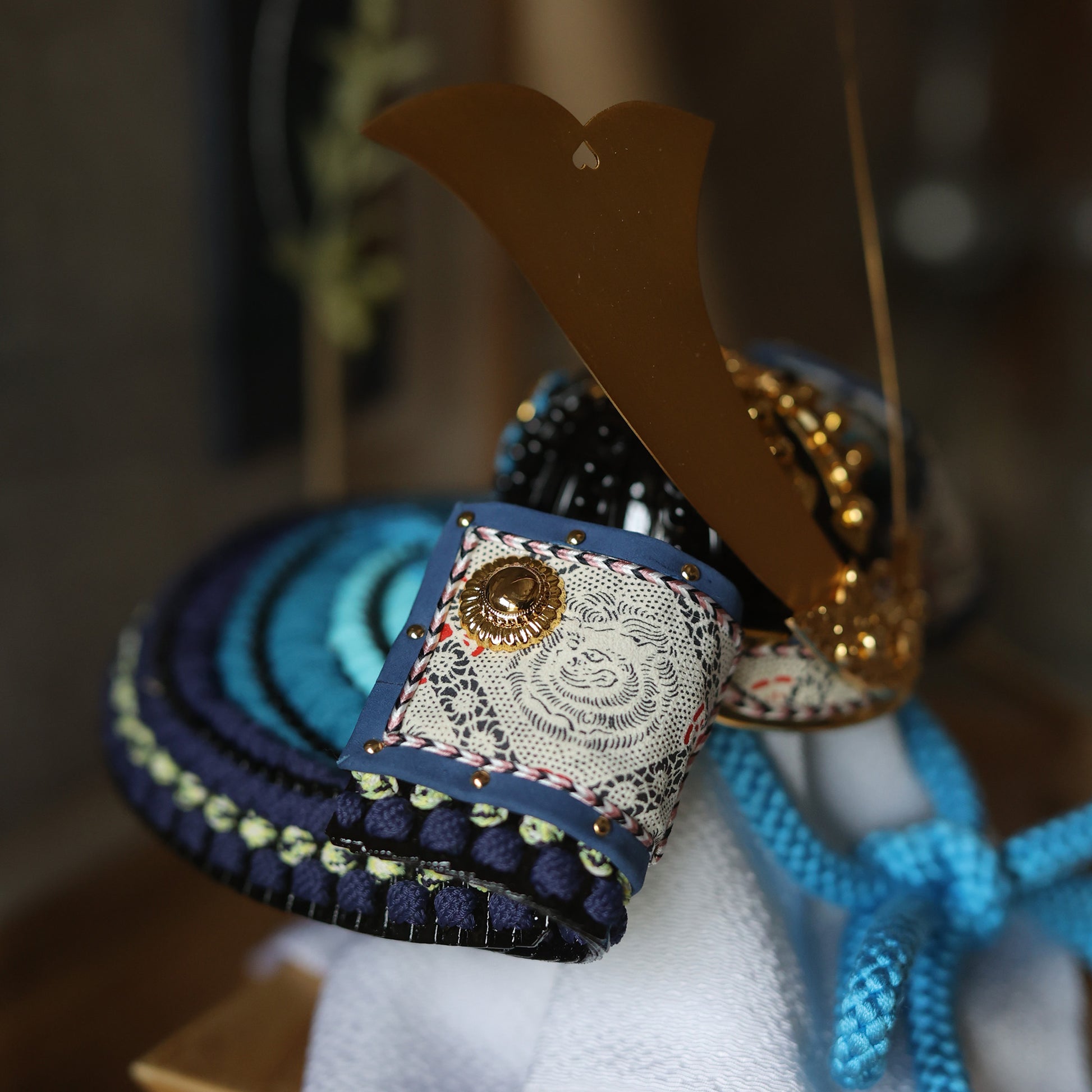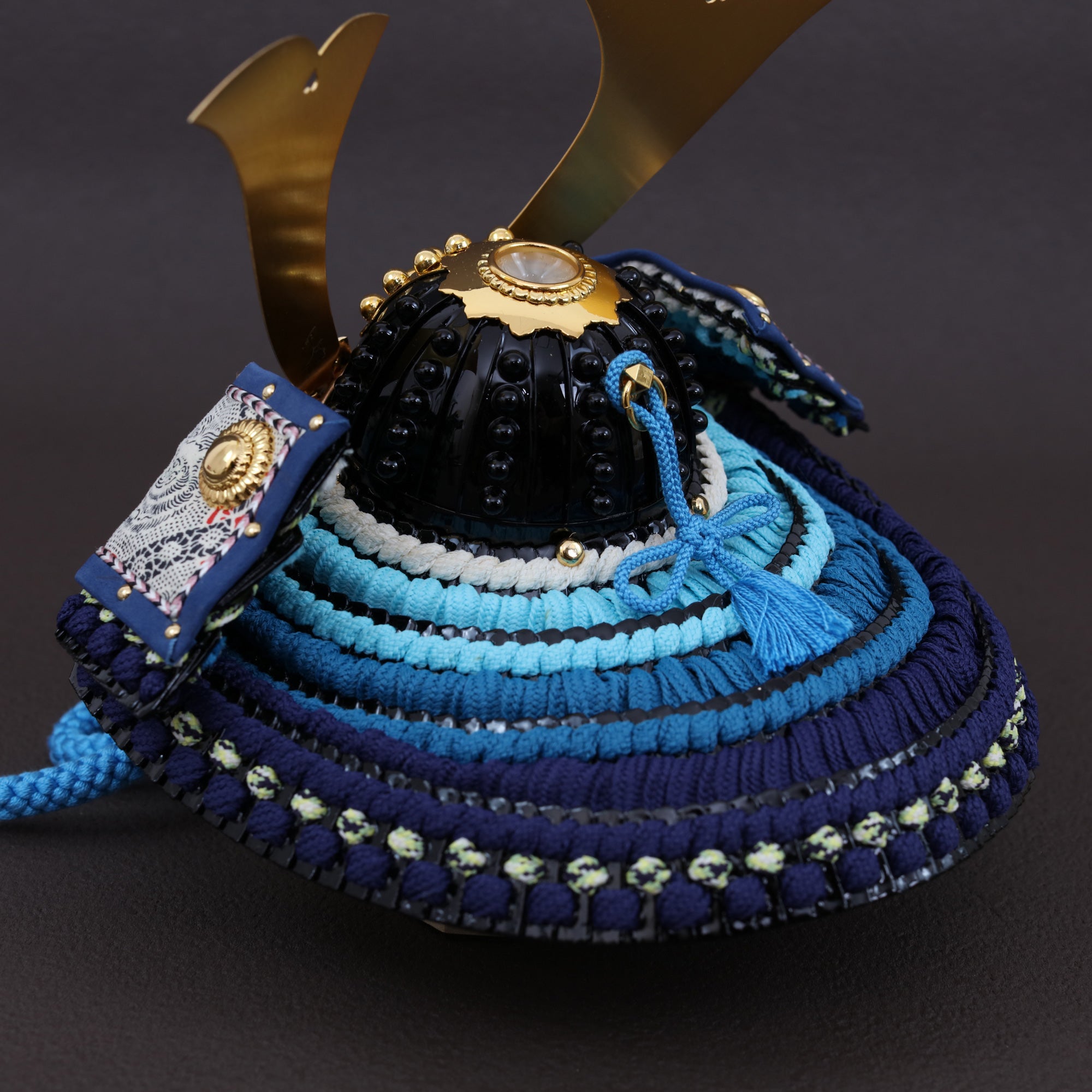 紺裾濃色の威し糸で仕上げた兜の後ろ姿は、深みのある色合いの美しさが特徴です。紺から徐々に濃淡が移ろう裾濃の糸が織りなすグラデーションは、静かな中にも動きを感じさせ、洗練された奥ゆかしさを演出しています。重厚な金具や黒漆との調和が見事であり、伝統美の中に格式高い雰囲気が漂います。その緻密で芸術的な仕上がりは、日本の職人技が生む格別な美を余すことなく伝えています。