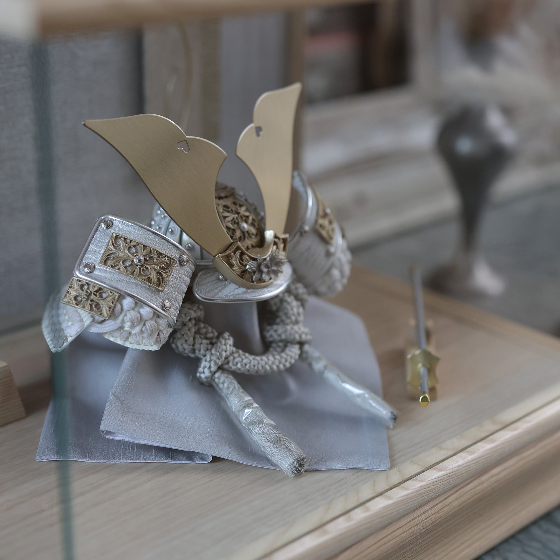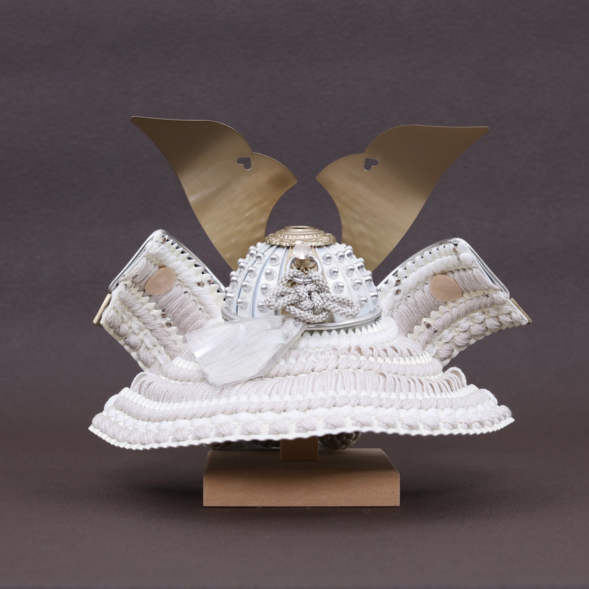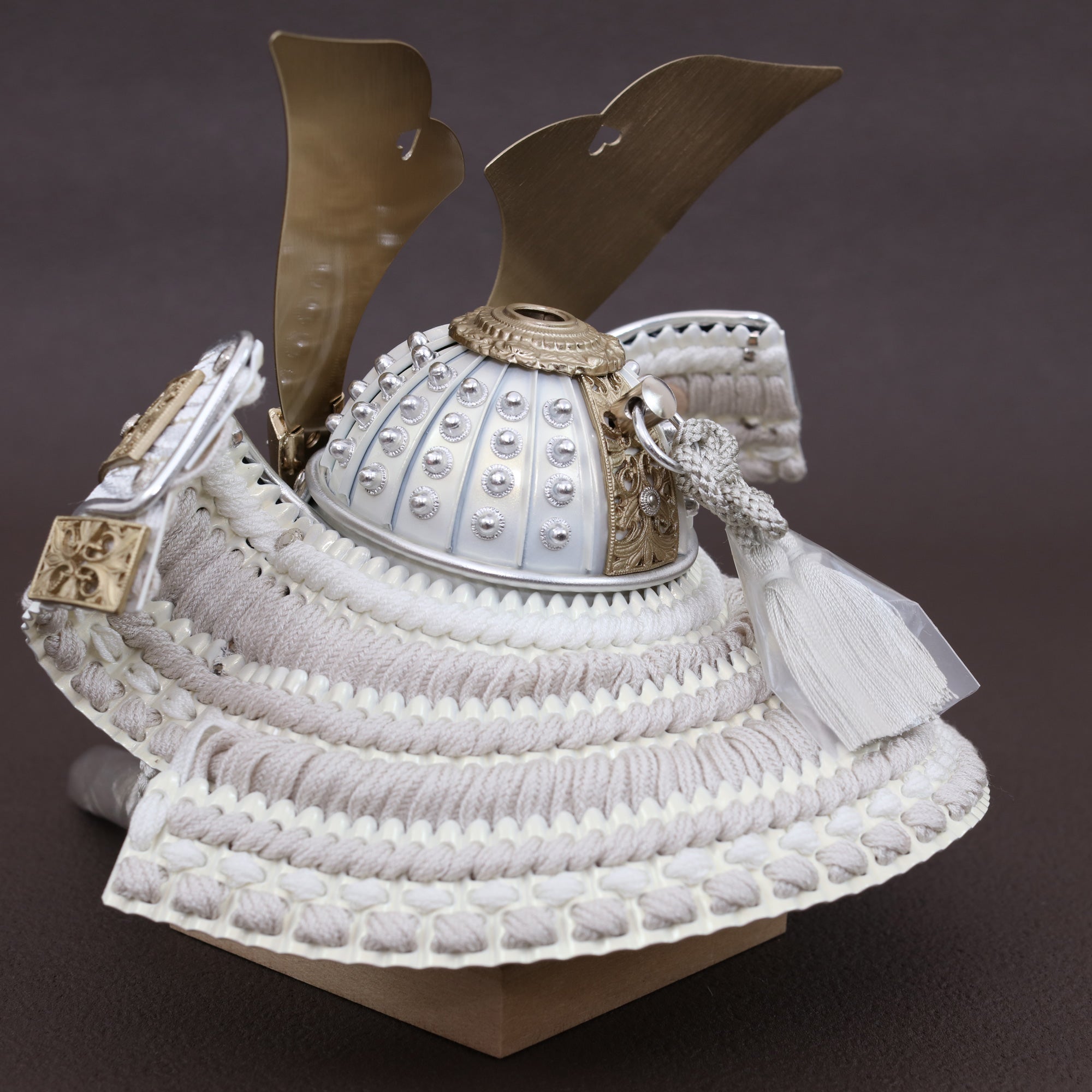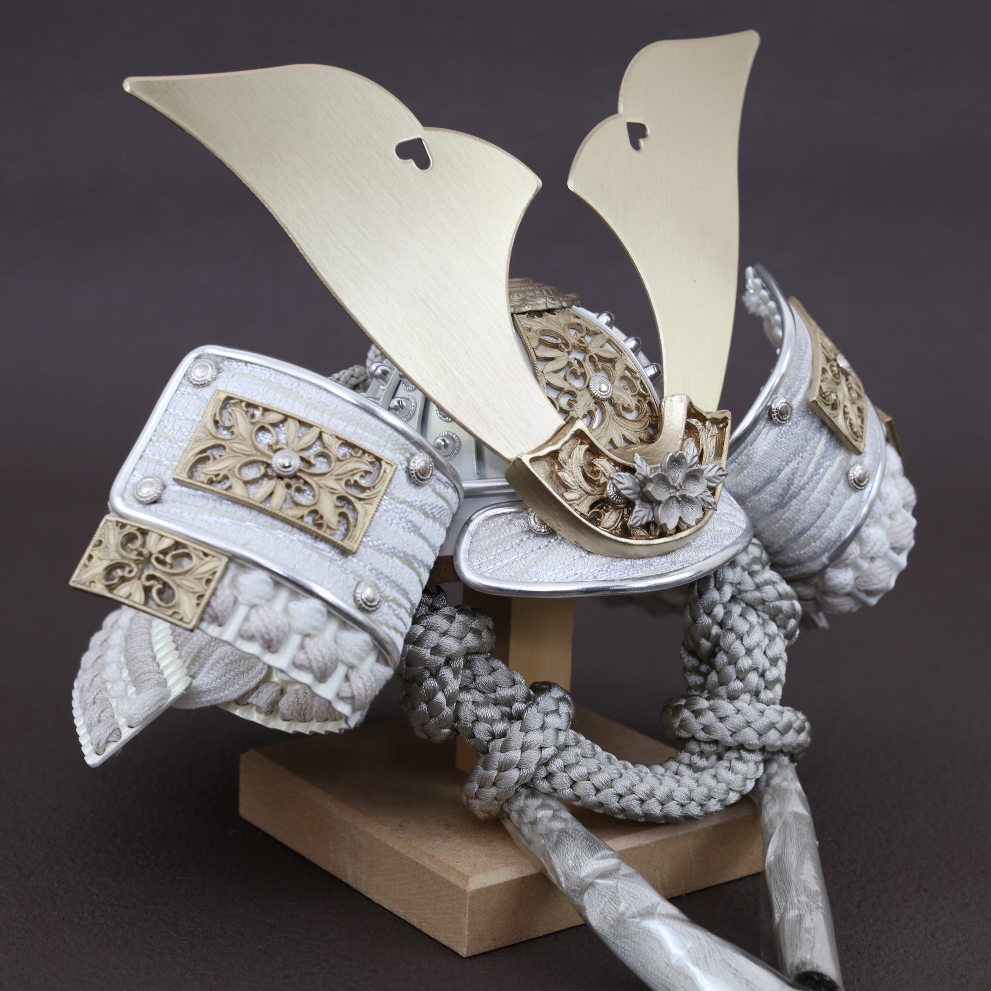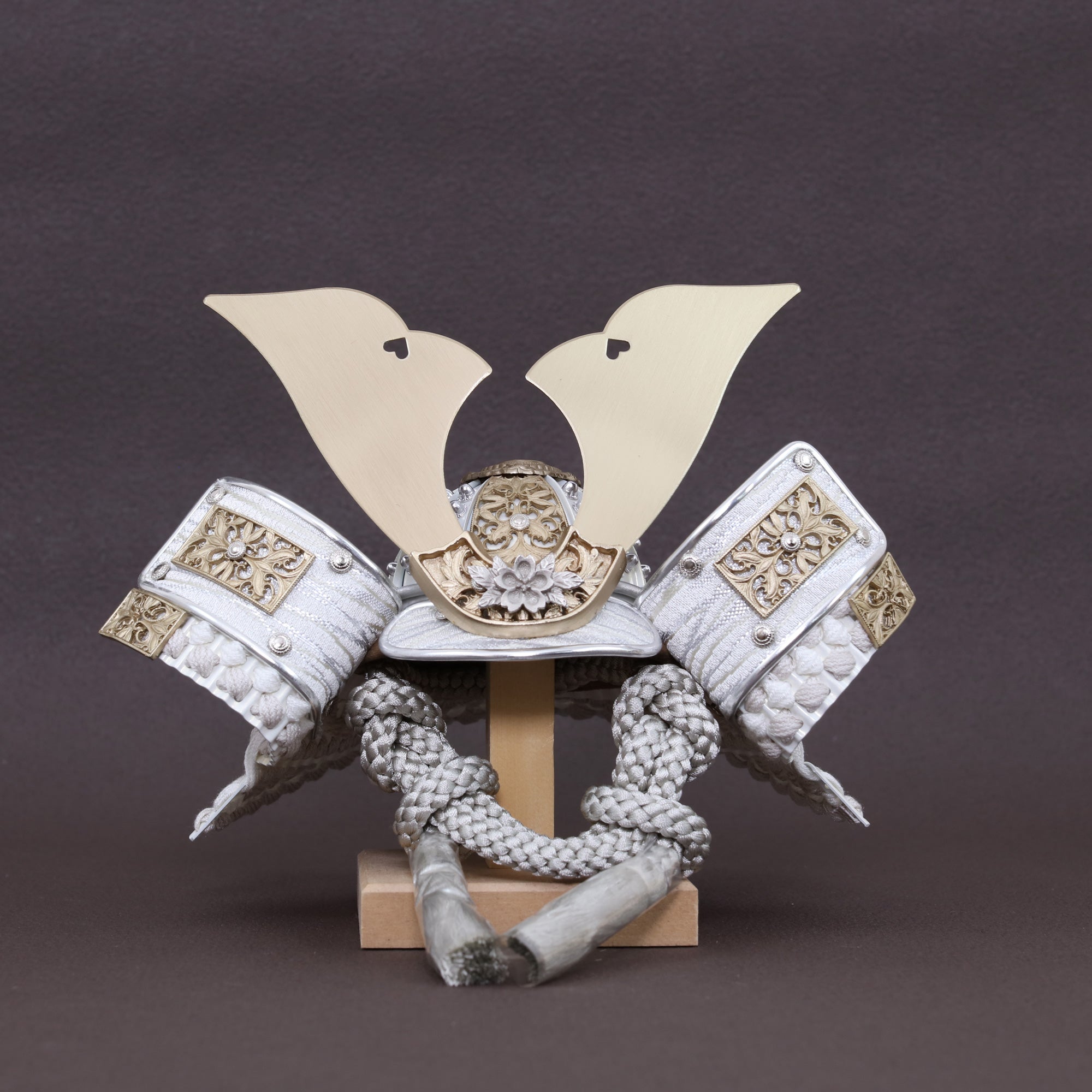 堂々とした大鍬形を、光を抑えた白銀の質感で仕立てました。