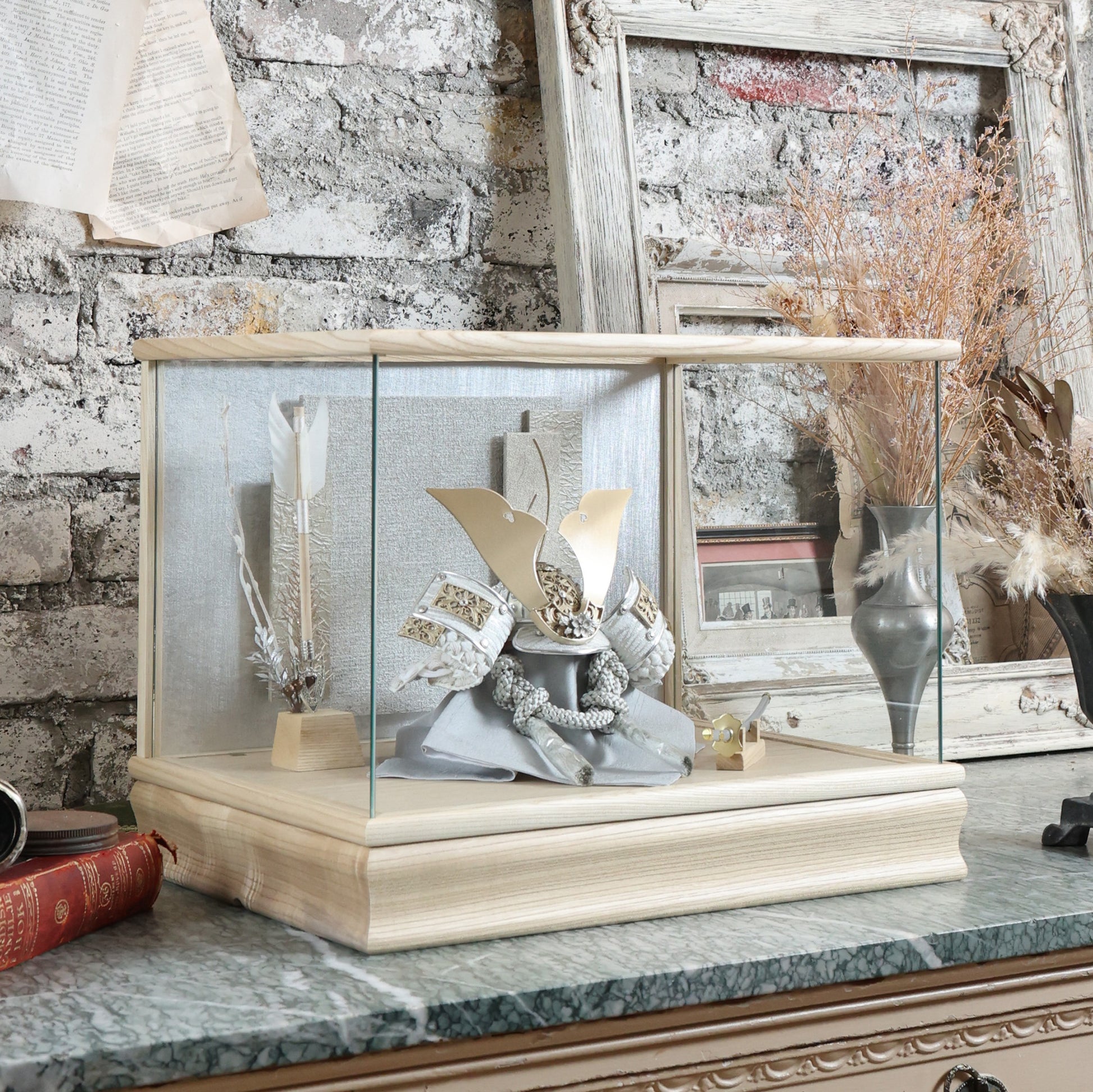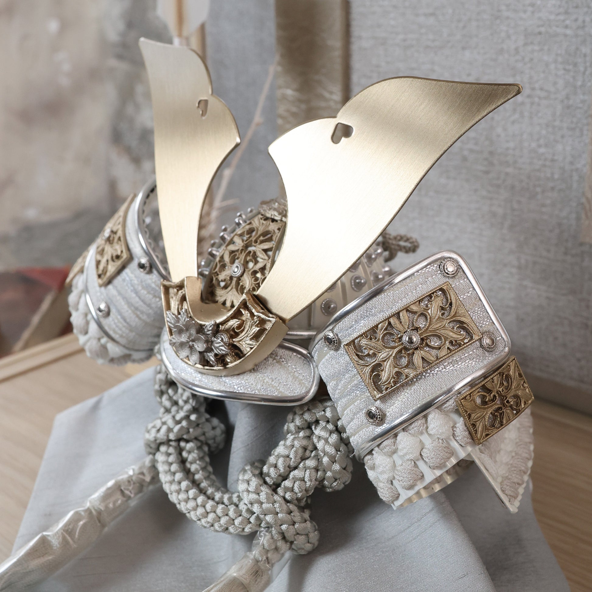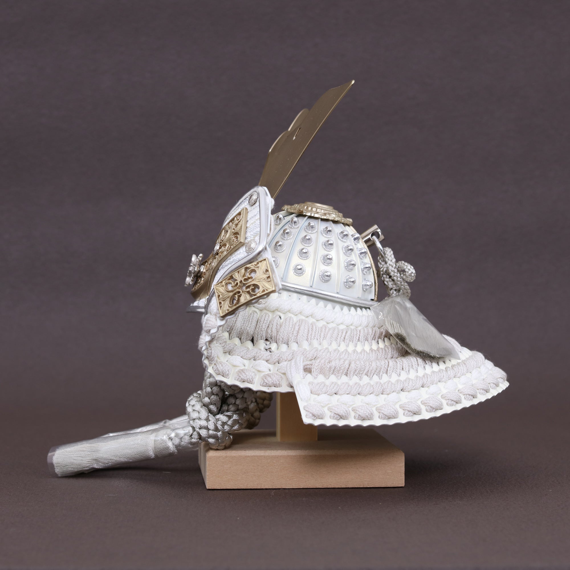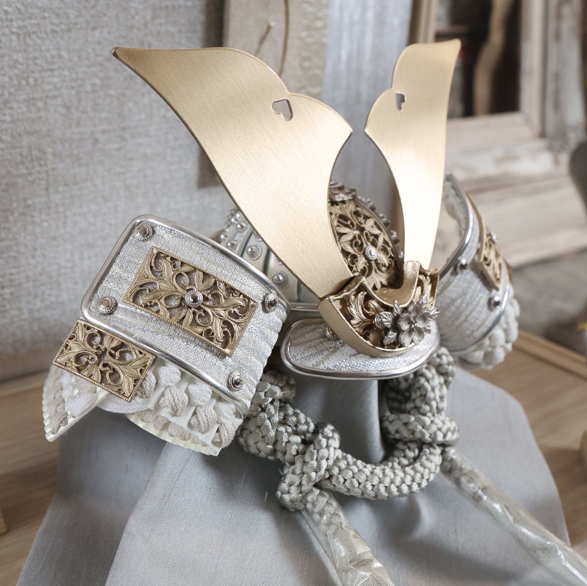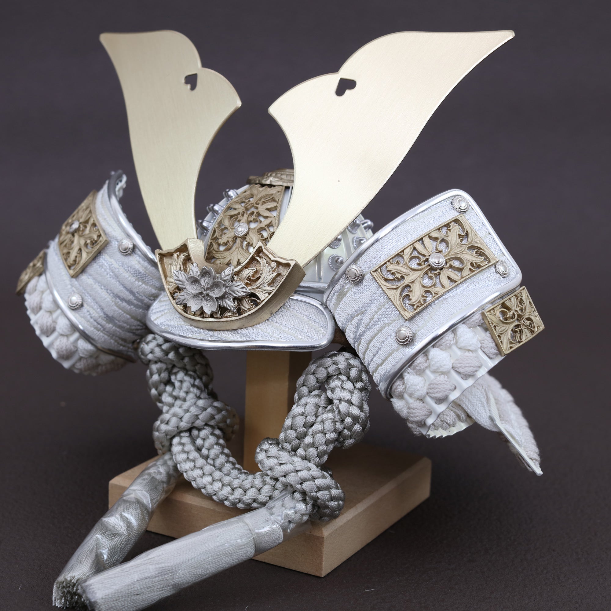 堂々とした大鍬形を、光を抑えた白銀の質感で仕立てました。