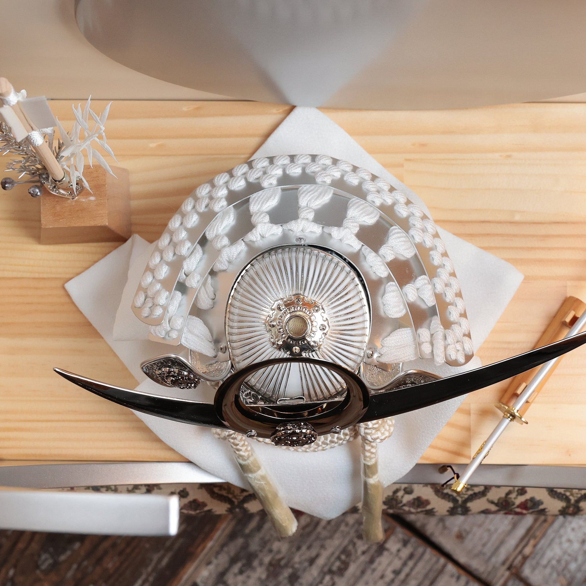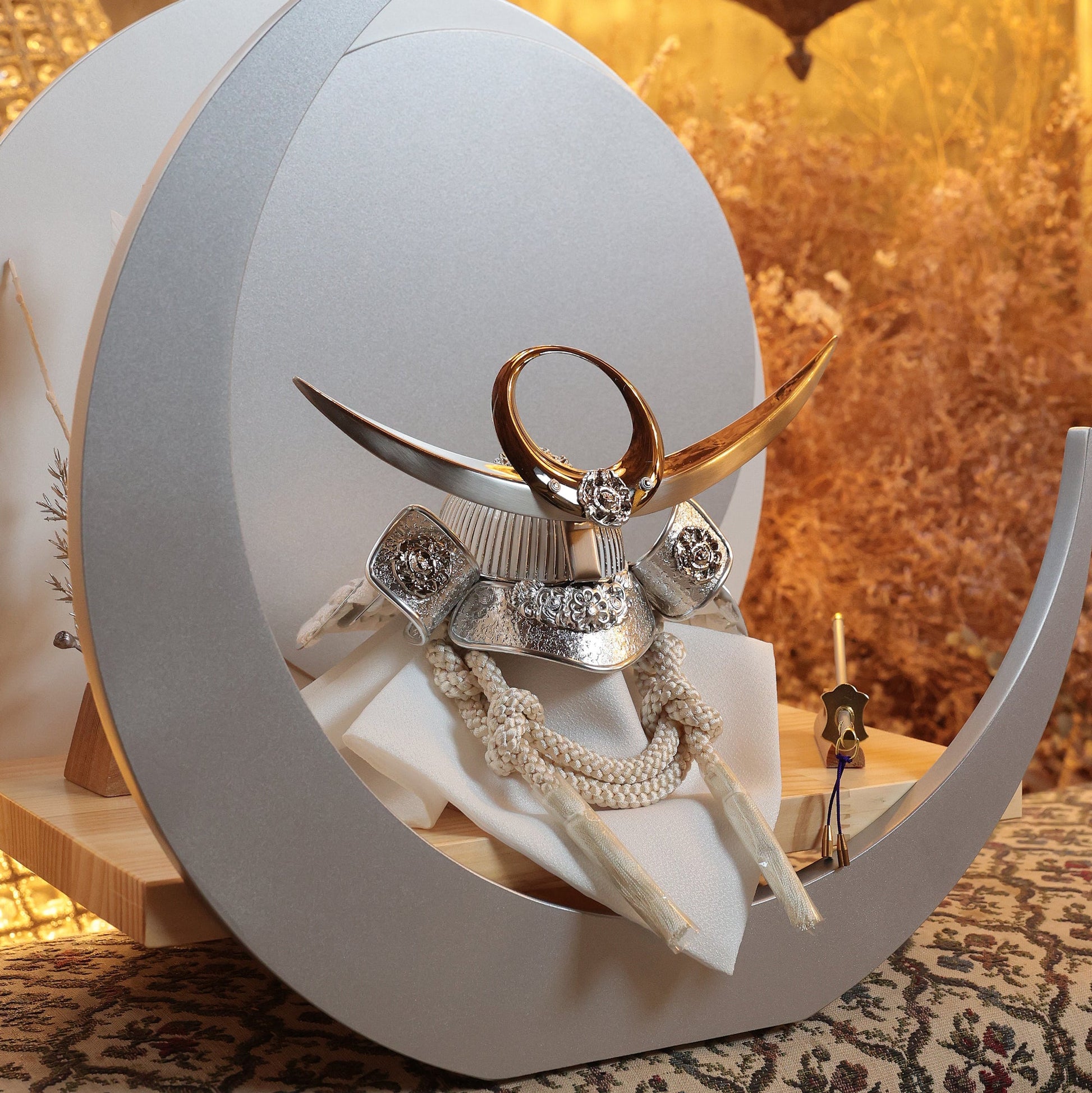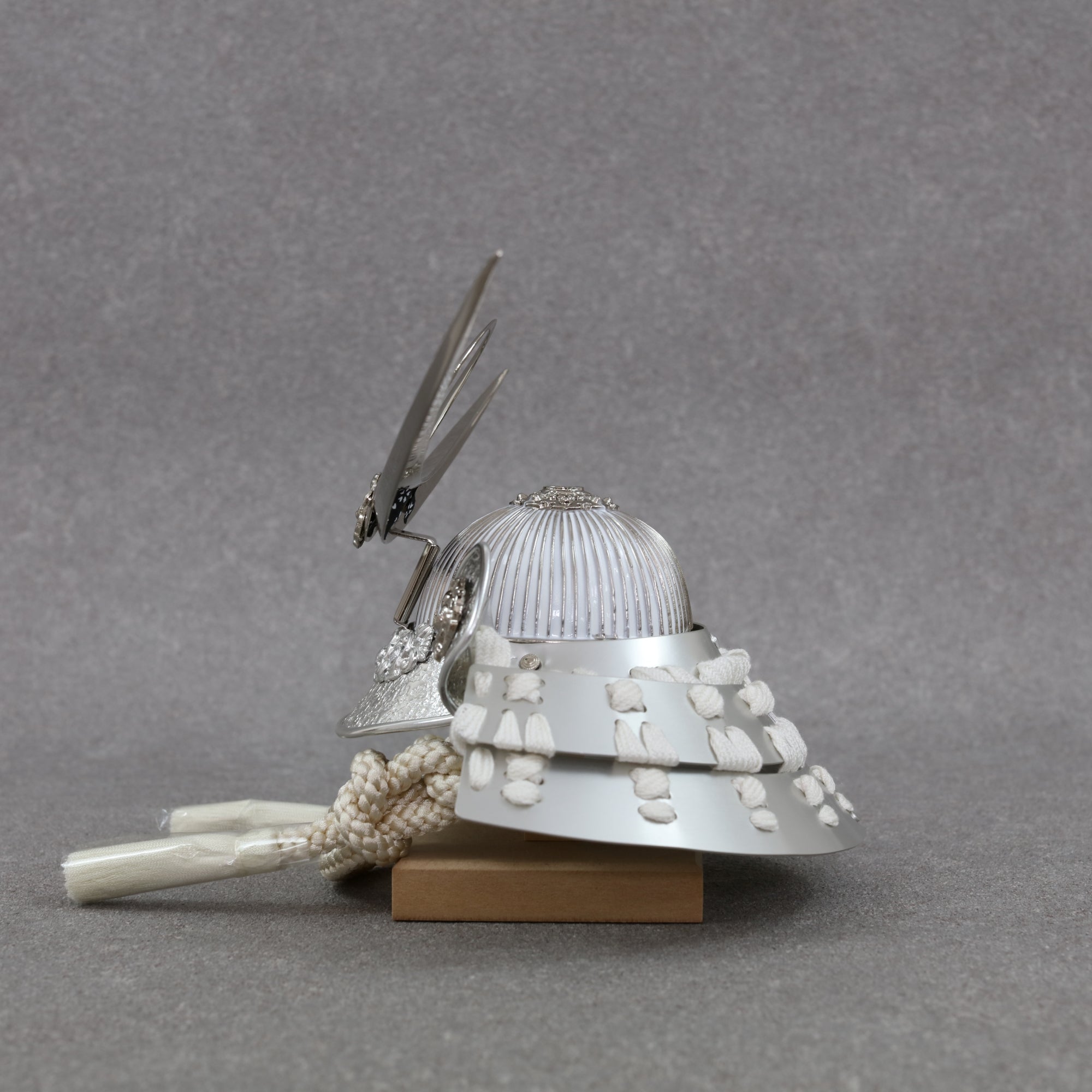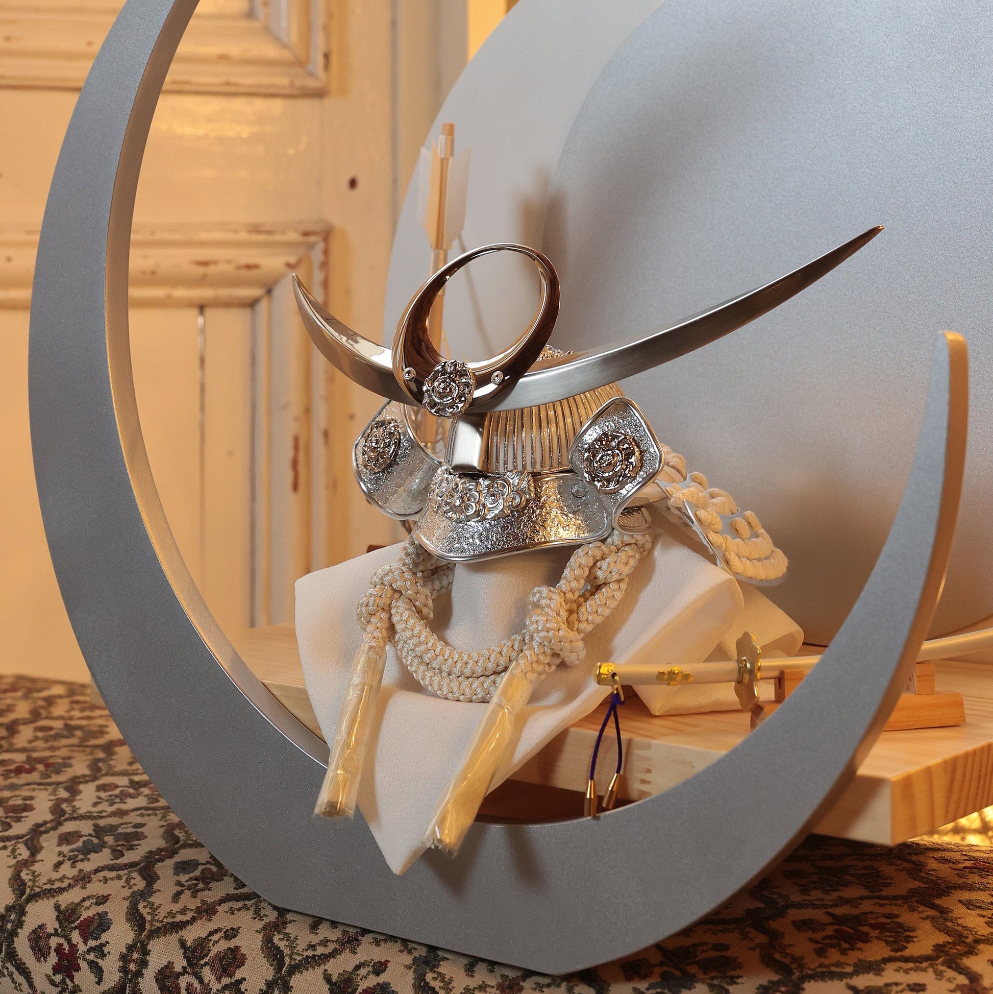 白を基調としたしつらえに溶け込みながら、確かな格を残す――上品で力強い鍬形です。