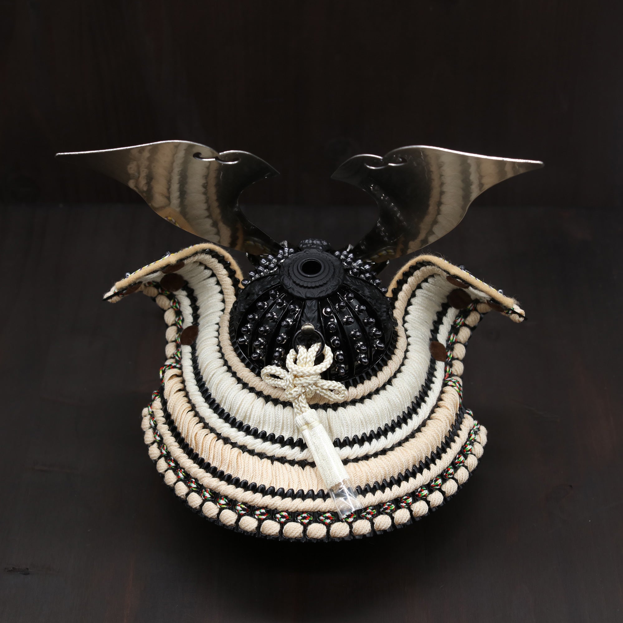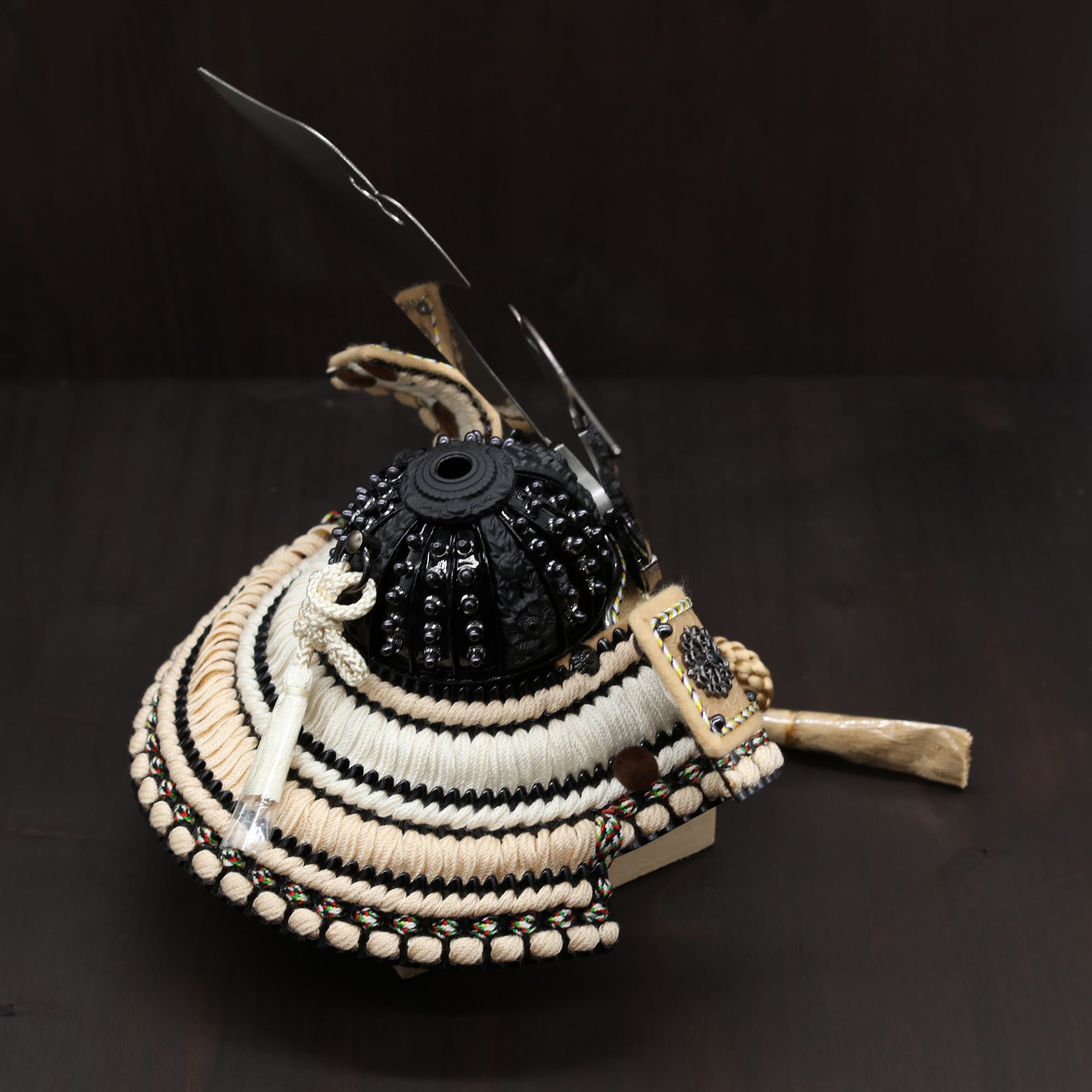 アイボリーとベージュの威し糸で仕上げた兜の後ろ姿