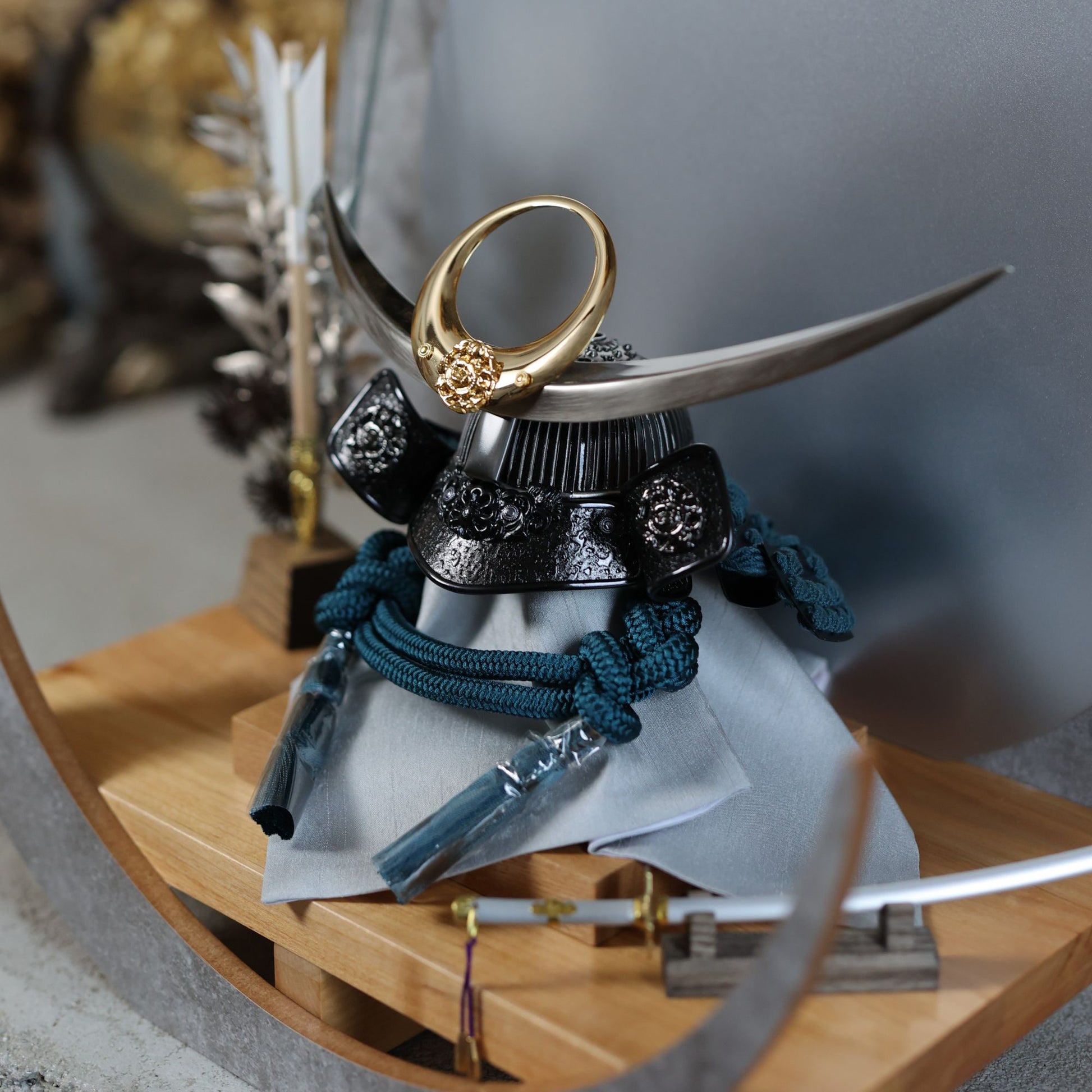 光を受けてやわらかく輝くゴールドが、兜全体に上品な華やぎと気高さを添えます。